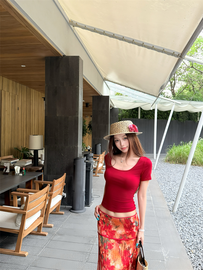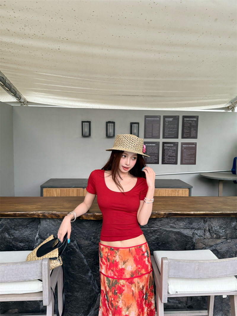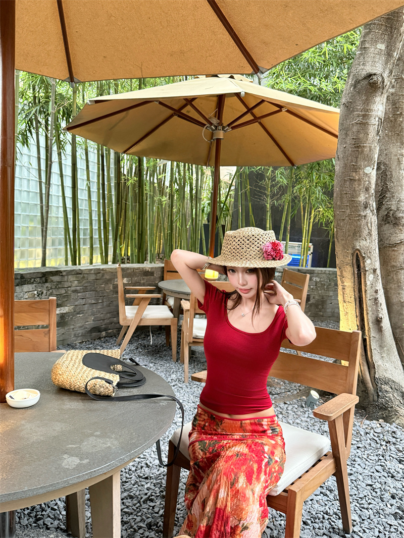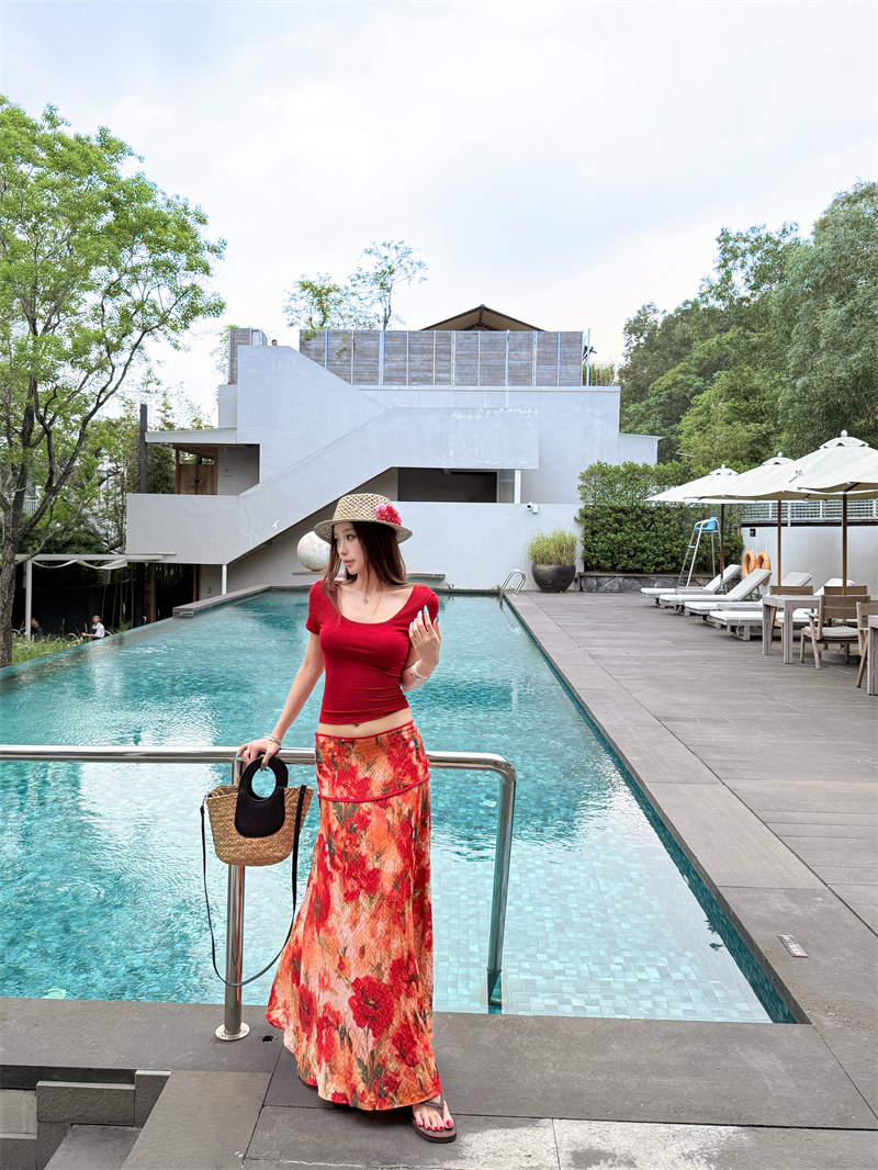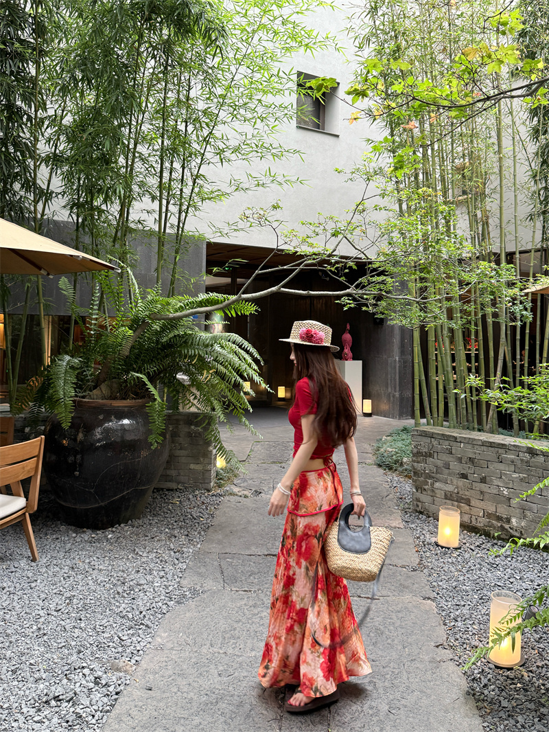 실사 정가 Mingyan 분위기 빨간색 티셔츠 맨위 유화 대 꽃 반신 치마 세트