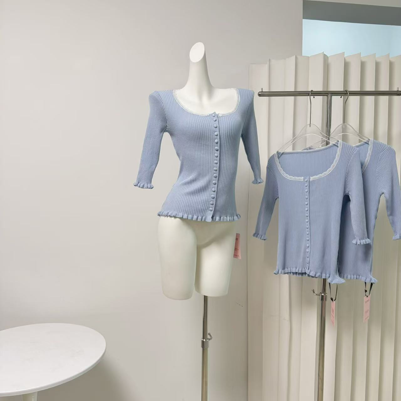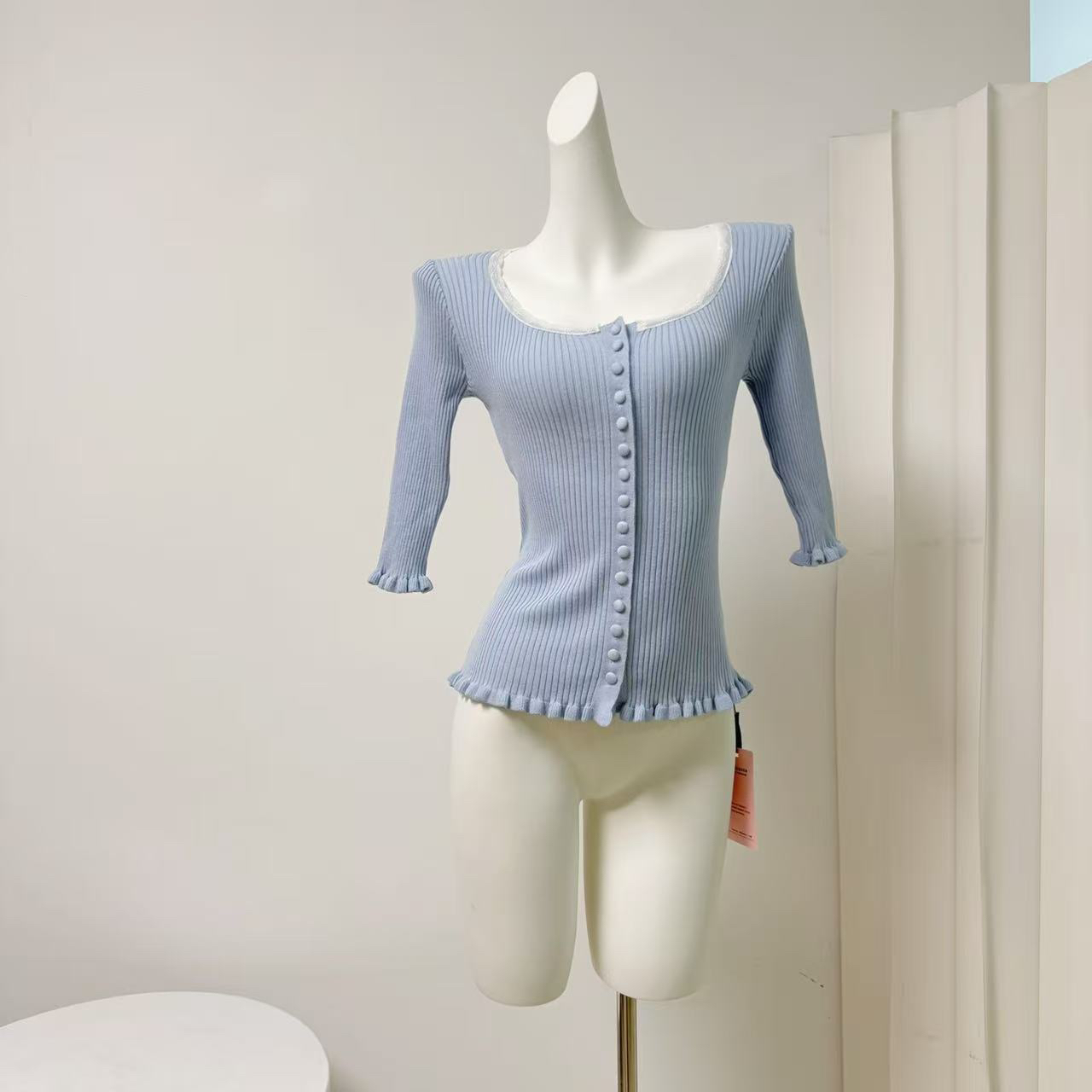 꽃 3 3 같은 단락 5k+chlo 전원 블루 레이스 7부 소매 니트 스웨터 케이크 하프 치마바지 세트