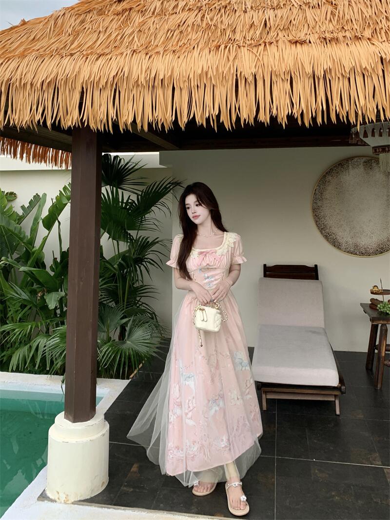 실사 중 사쿠라 분말 카니발 슈퍼 요정 메시 원단 프린트 도망자 공주 드레스