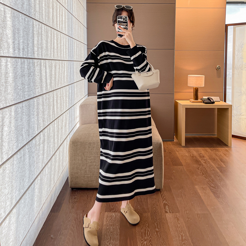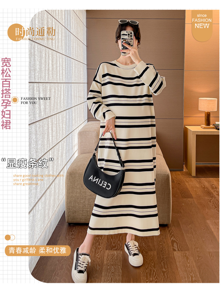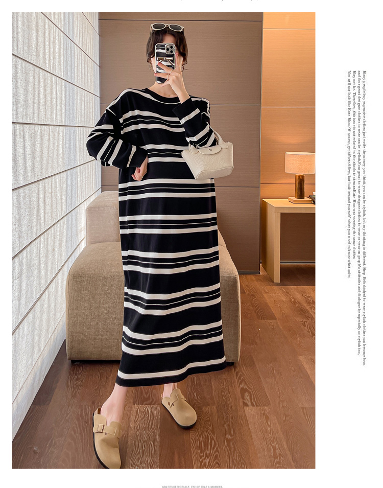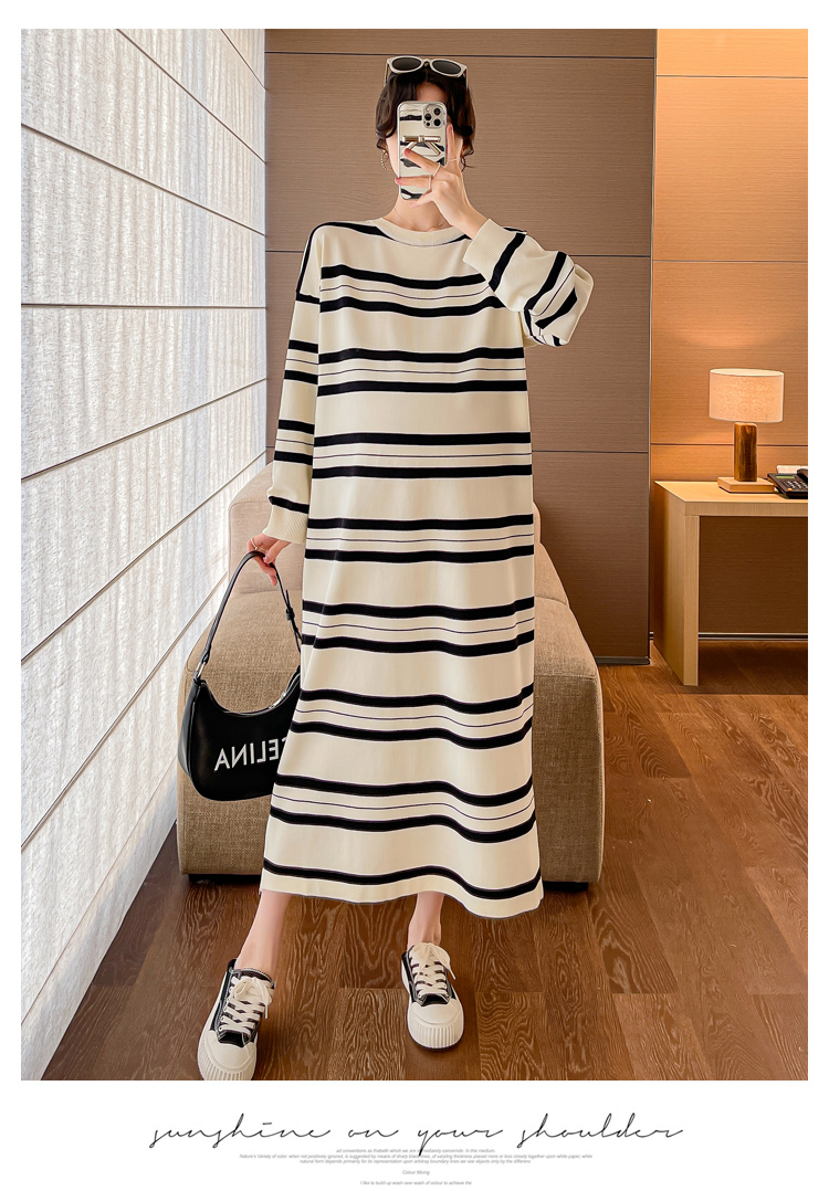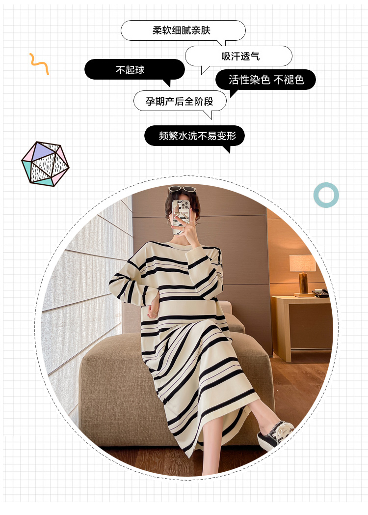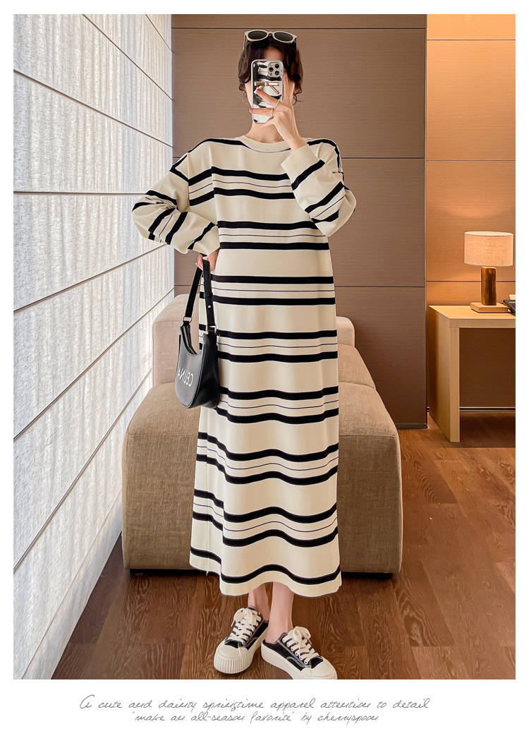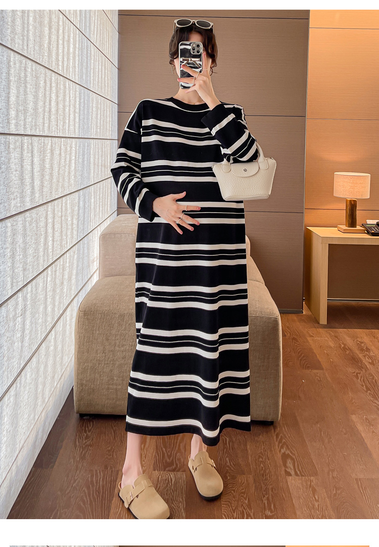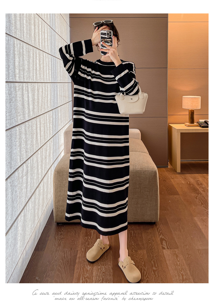 실사 봄 드레스 새로운 인터넷 유명인 출산 착용 니트 스트라이프 임산부 롱 코트 드레스 한국 스타일 루즈핏 디스플레이 농땡이 부리다
