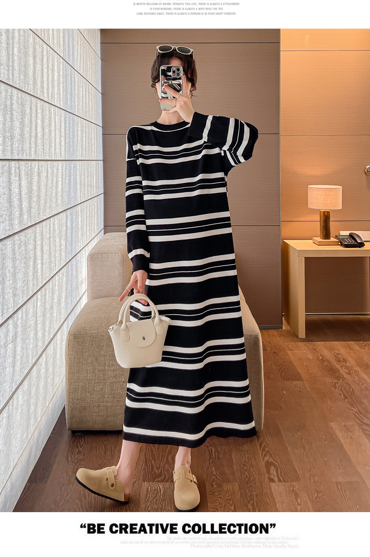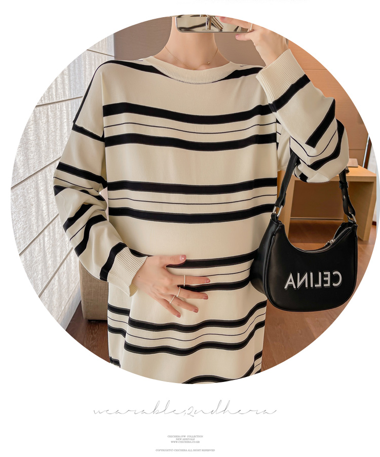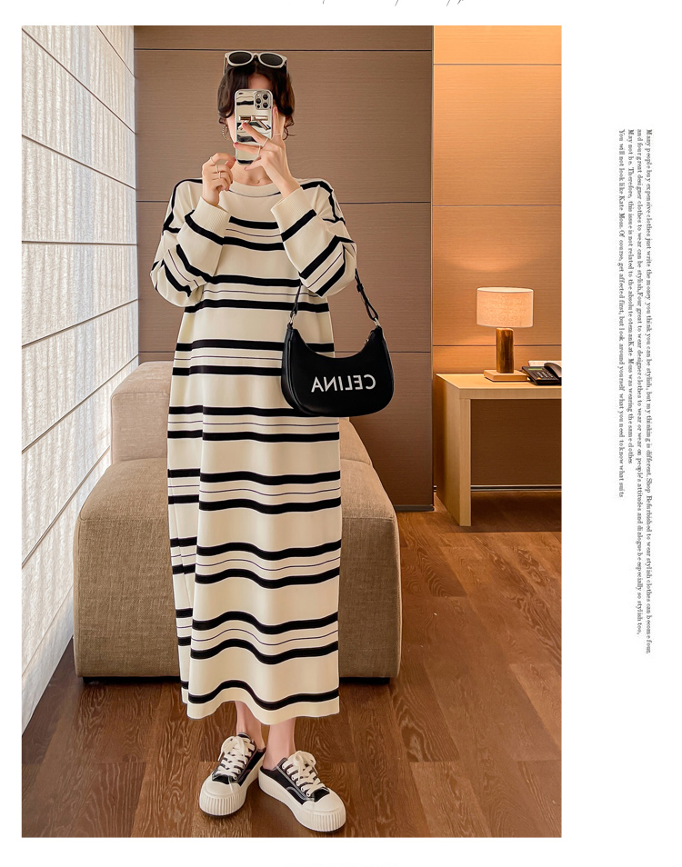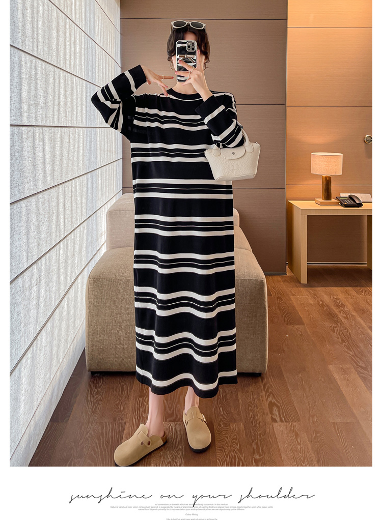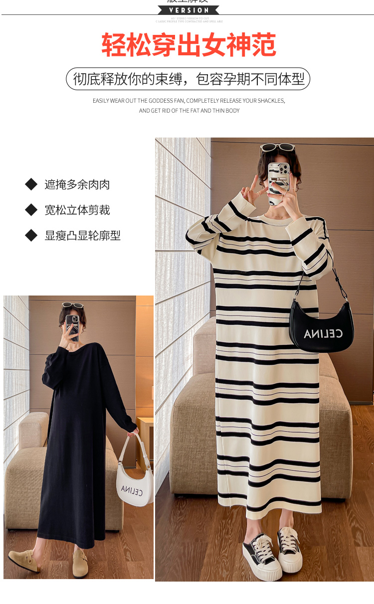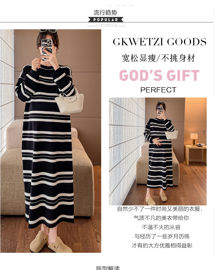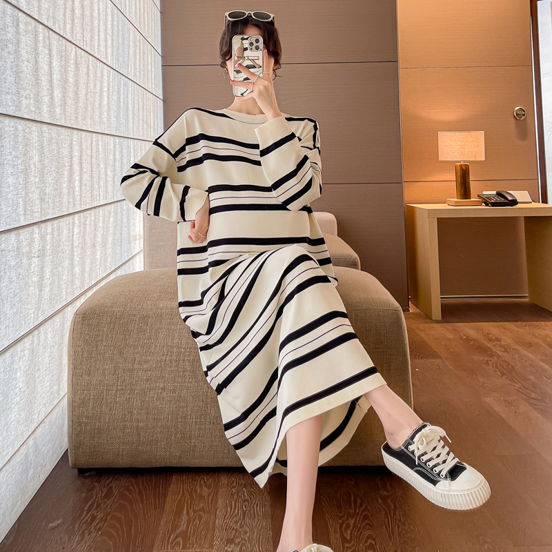 실사 봄 드레스 새로운 인터넷 유명인 출산 착용 니트 스트라이프 임산부 롱 코트 드레스 한국 스타일 루즈핏 디스플레이 농땡이 부리다