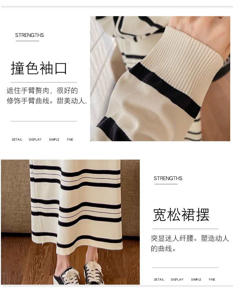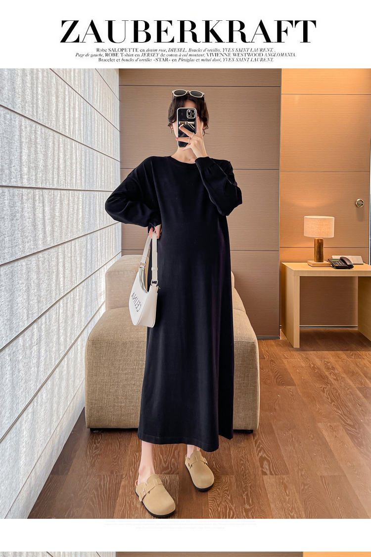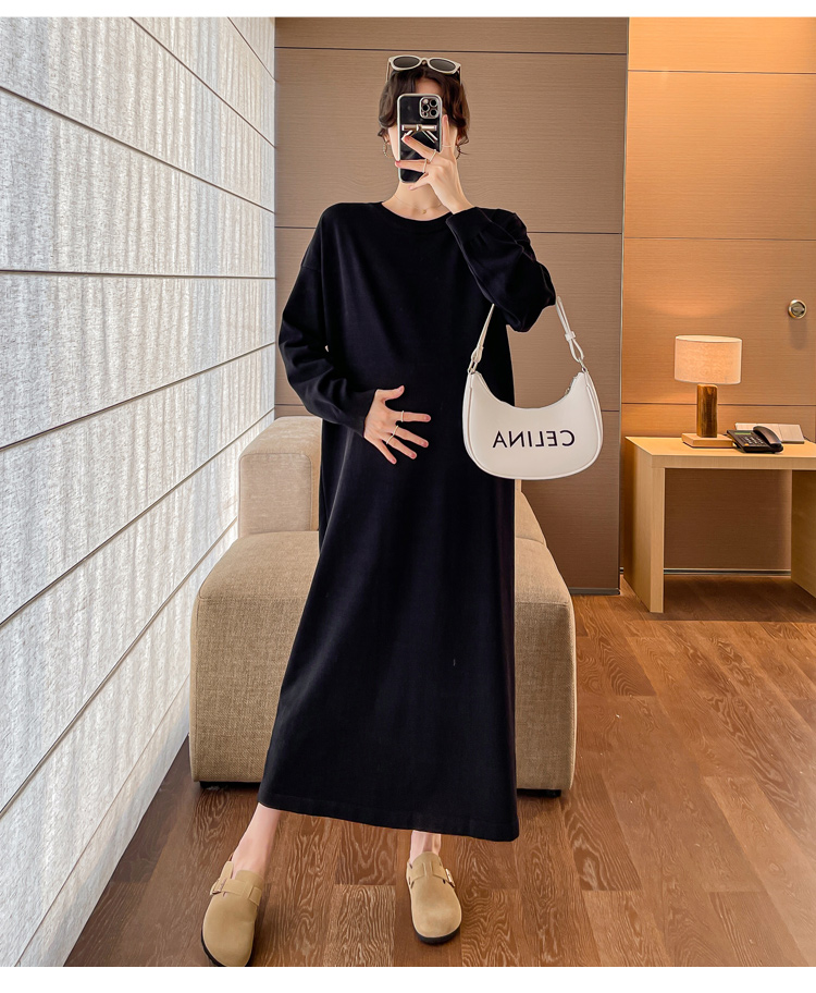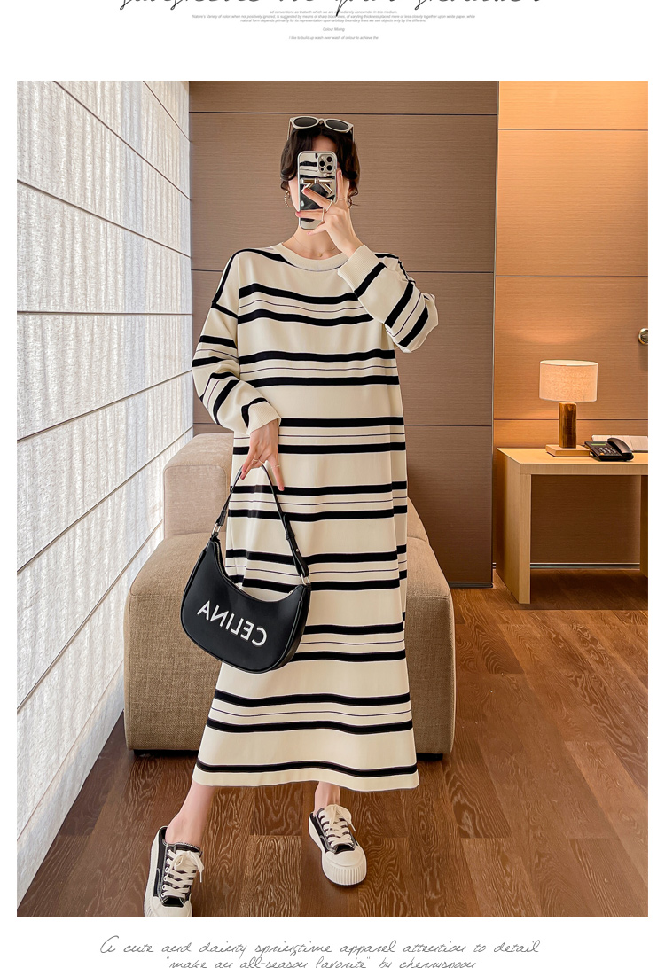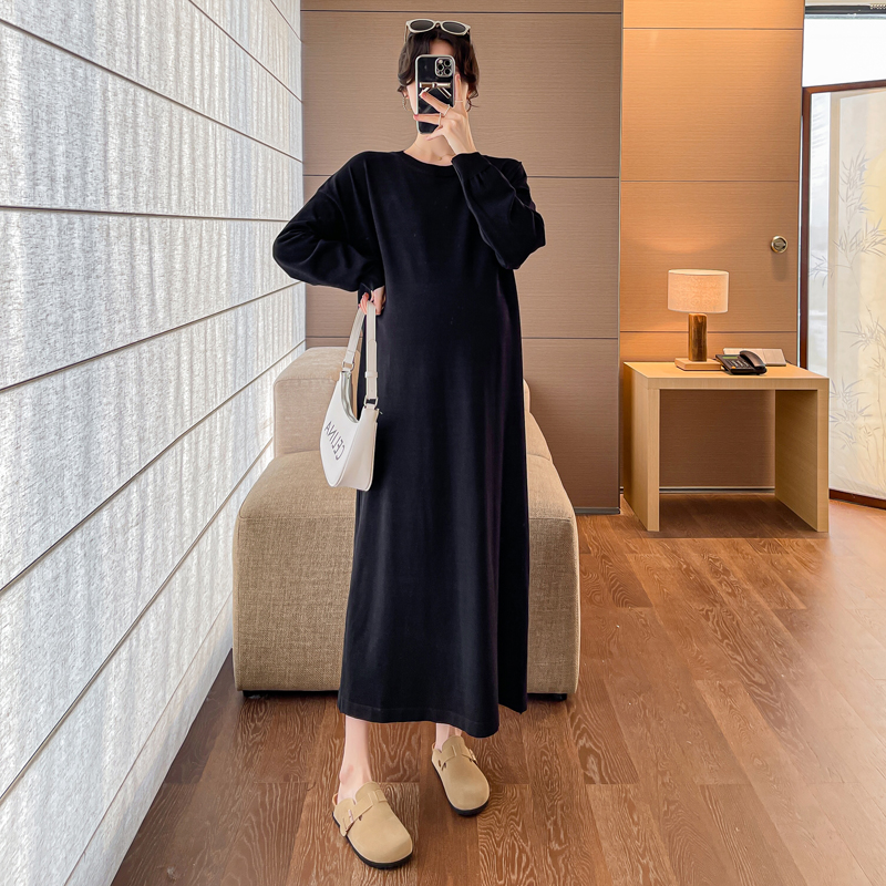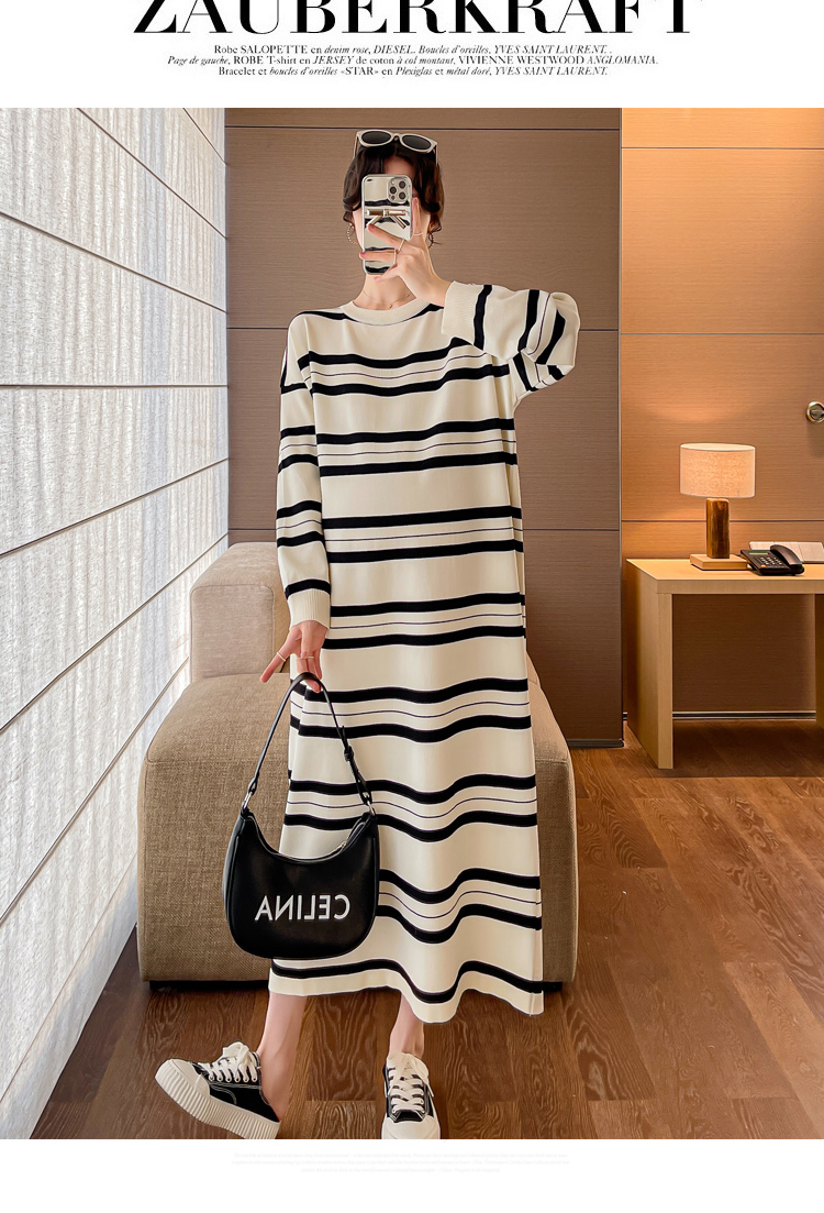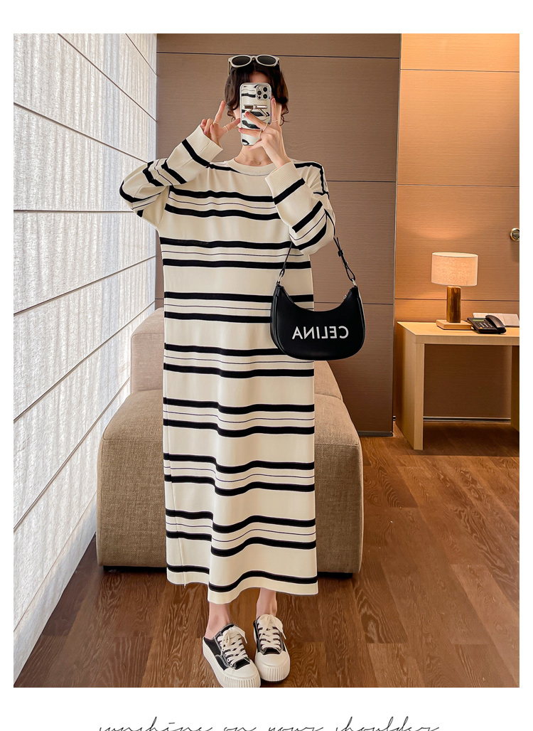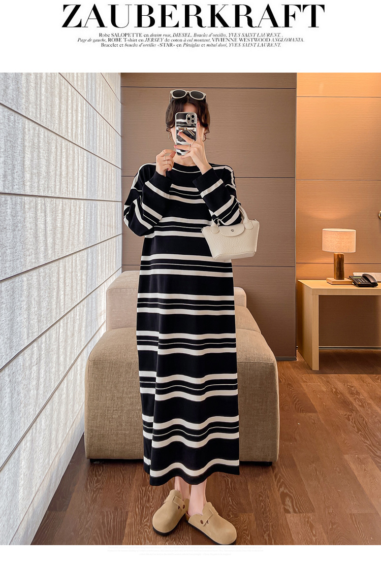 실사 봄 드레스 새로운 인터넷 유명인 출산 착용 니트 스트라이프 임산부 롱 코트 드레스 한국 스타일 루즈핏 디스플레이 농땡이 부리다