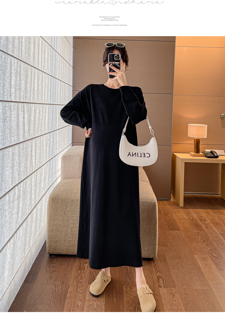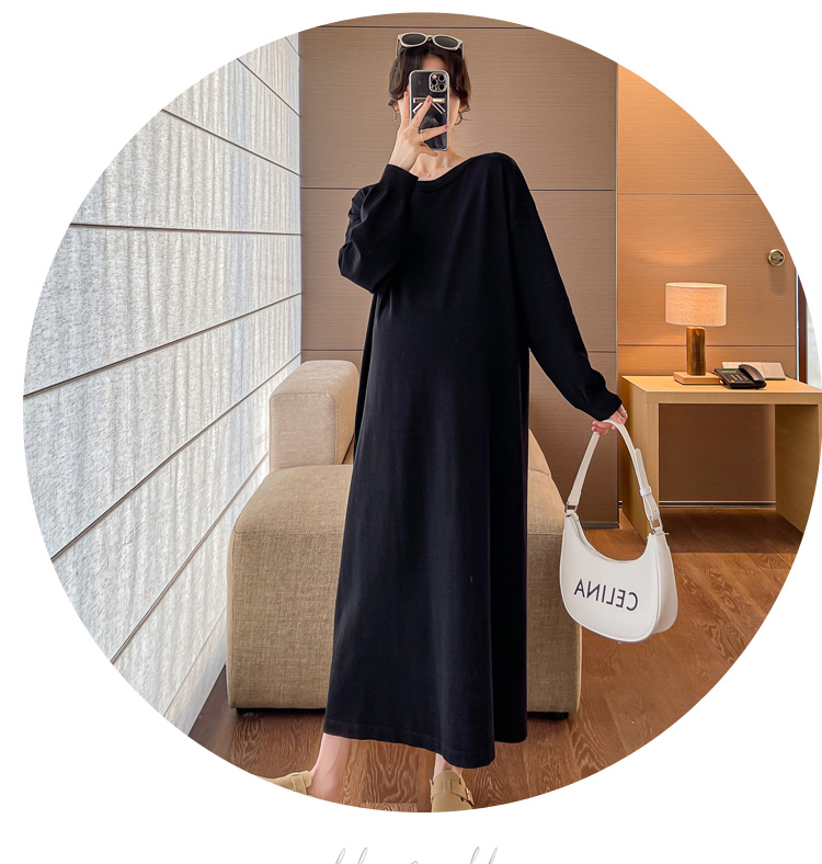 실사 출산 착용 2026 봄 드레스 새로운 루즈핏 슬림해 보이는 연령 감소 품격 스카프 중간 길이 니트 드레스