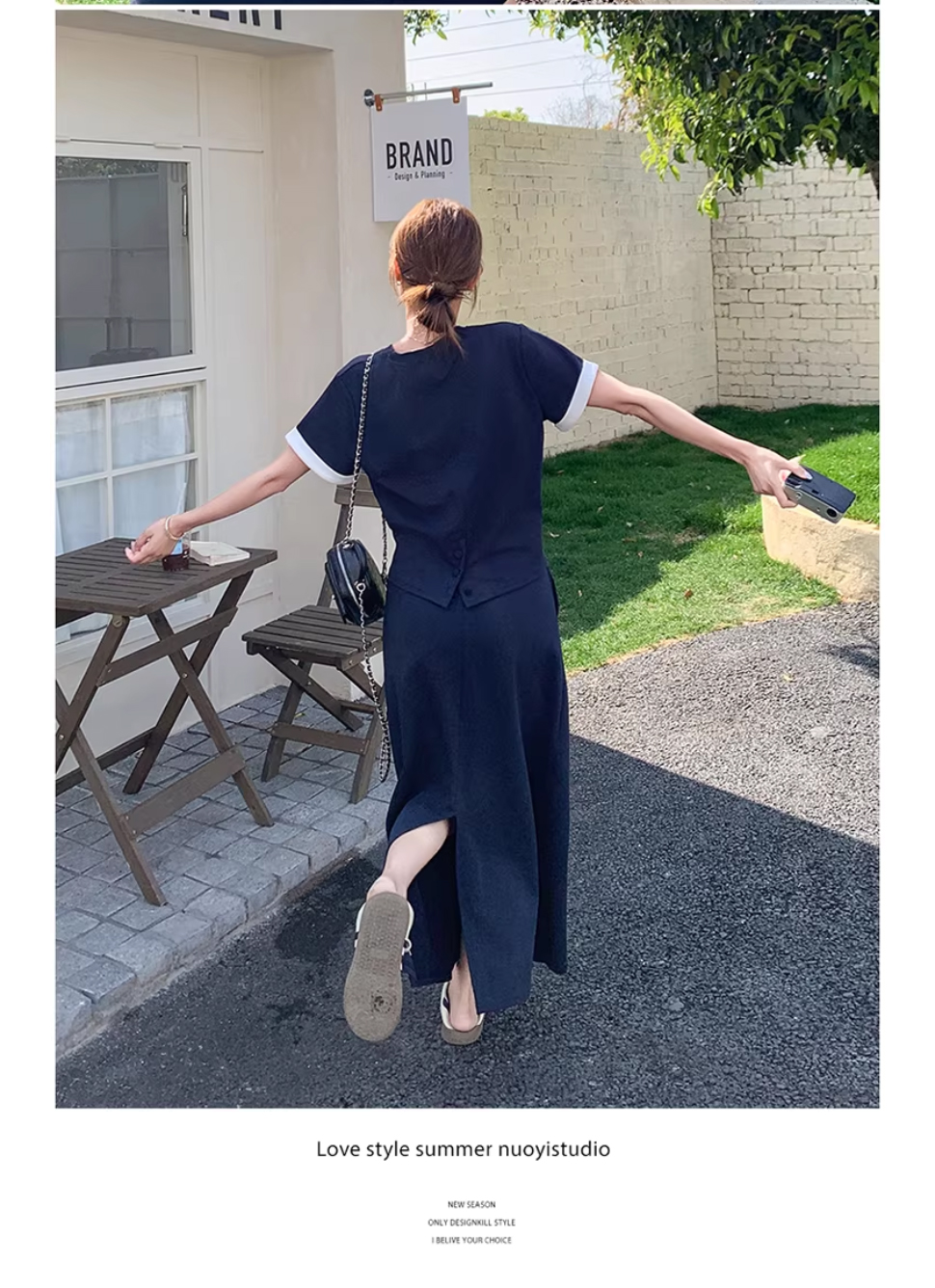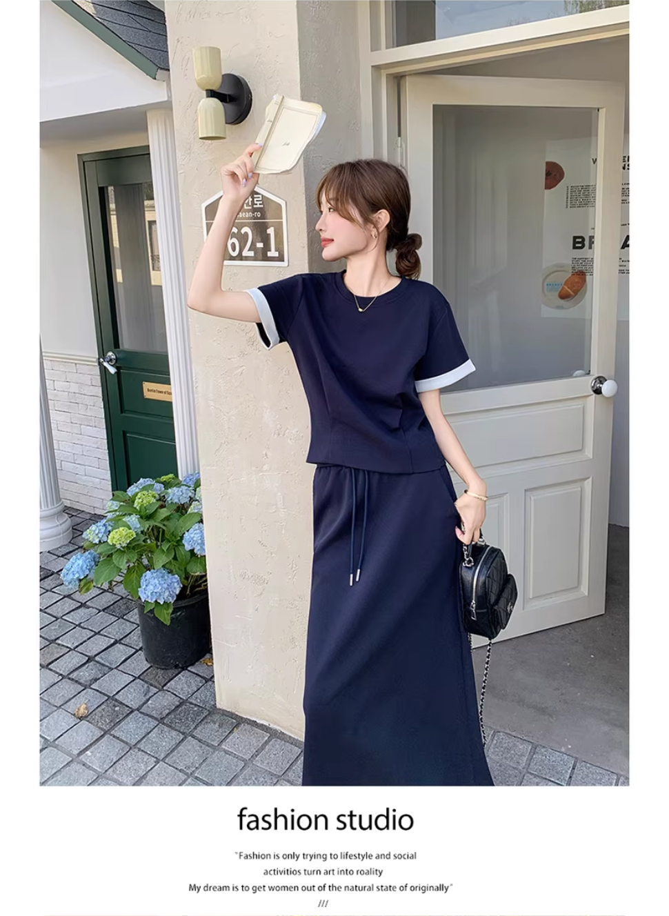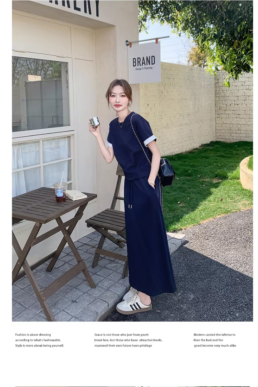 해군 캐주얼 반팔 티셔츠 세트 드레스 여성 여름 2026 년 새로운 슈퍼 화재 반신 스커트 투피스 세트