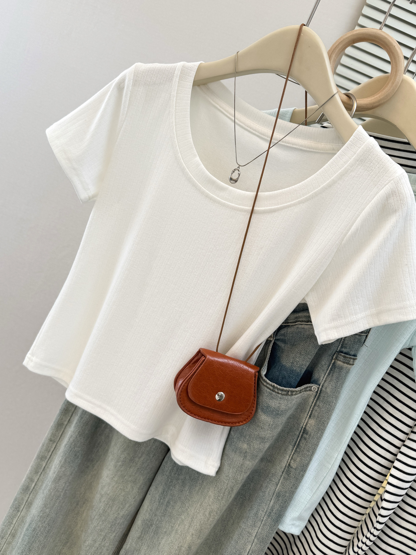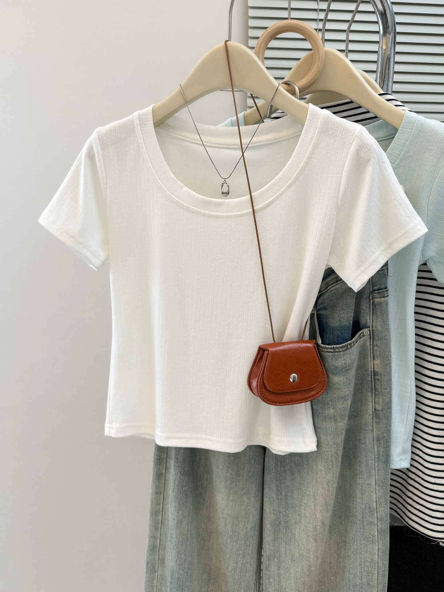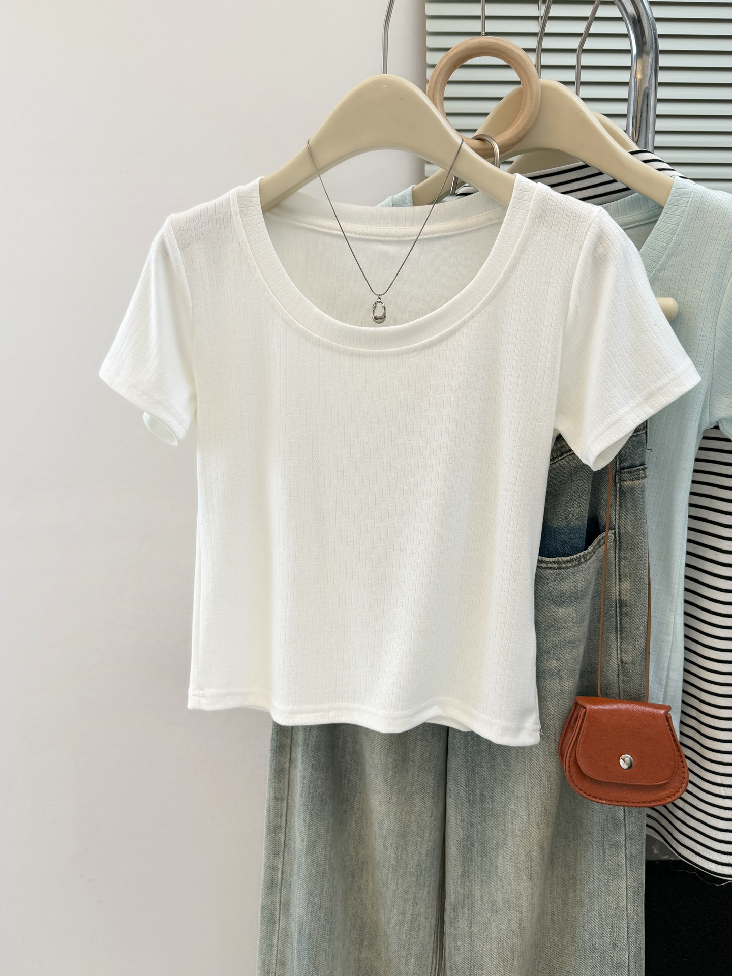 실사 작은 키 쇼트 스타일 반팔 티셔츠 여성 여름 새로운 몸매 가꾸기 한국 스타일 인사이드 가져 가라. 기본 셔츠 긍정적 인 어깨 u 칼라 맨위