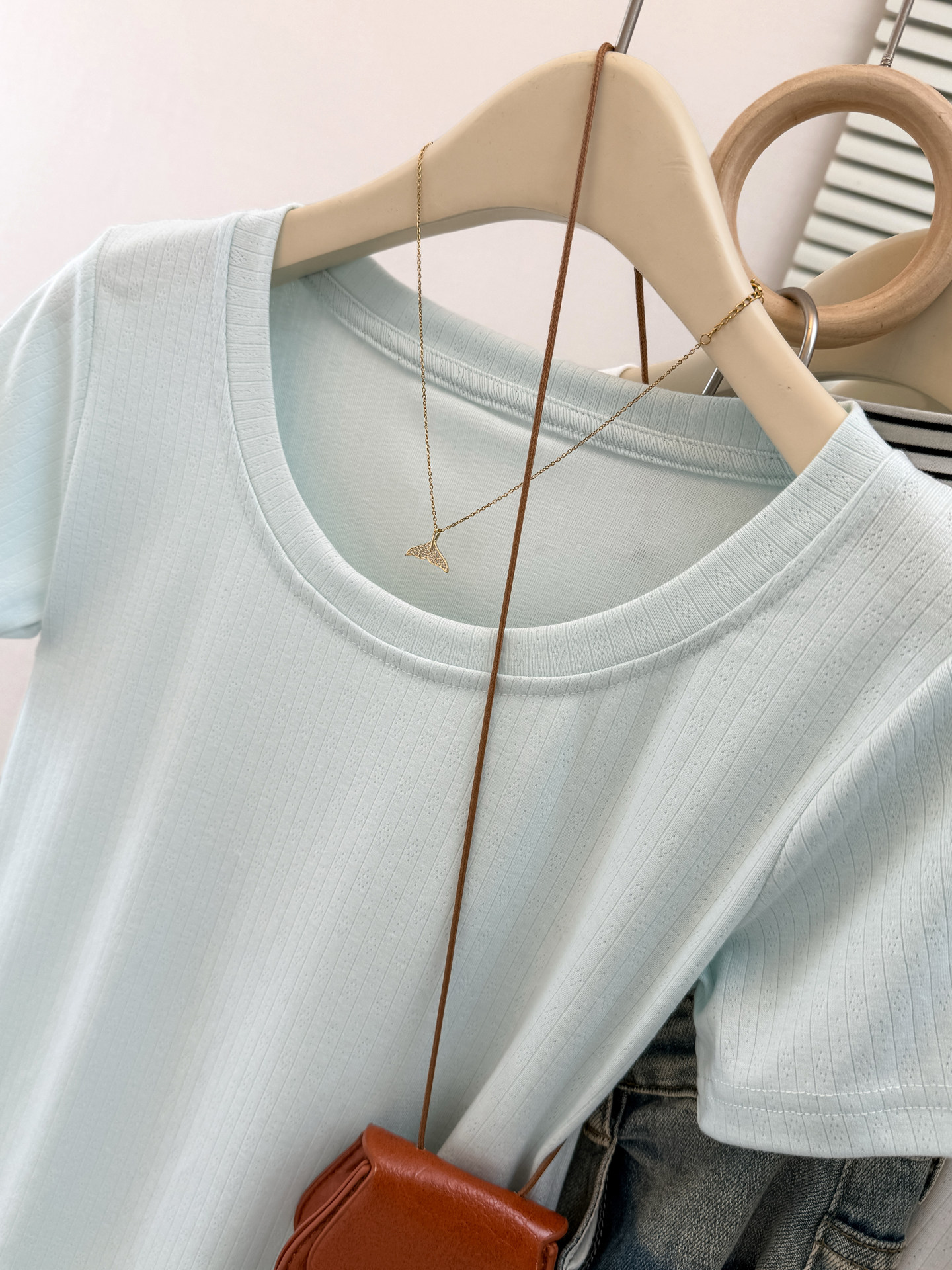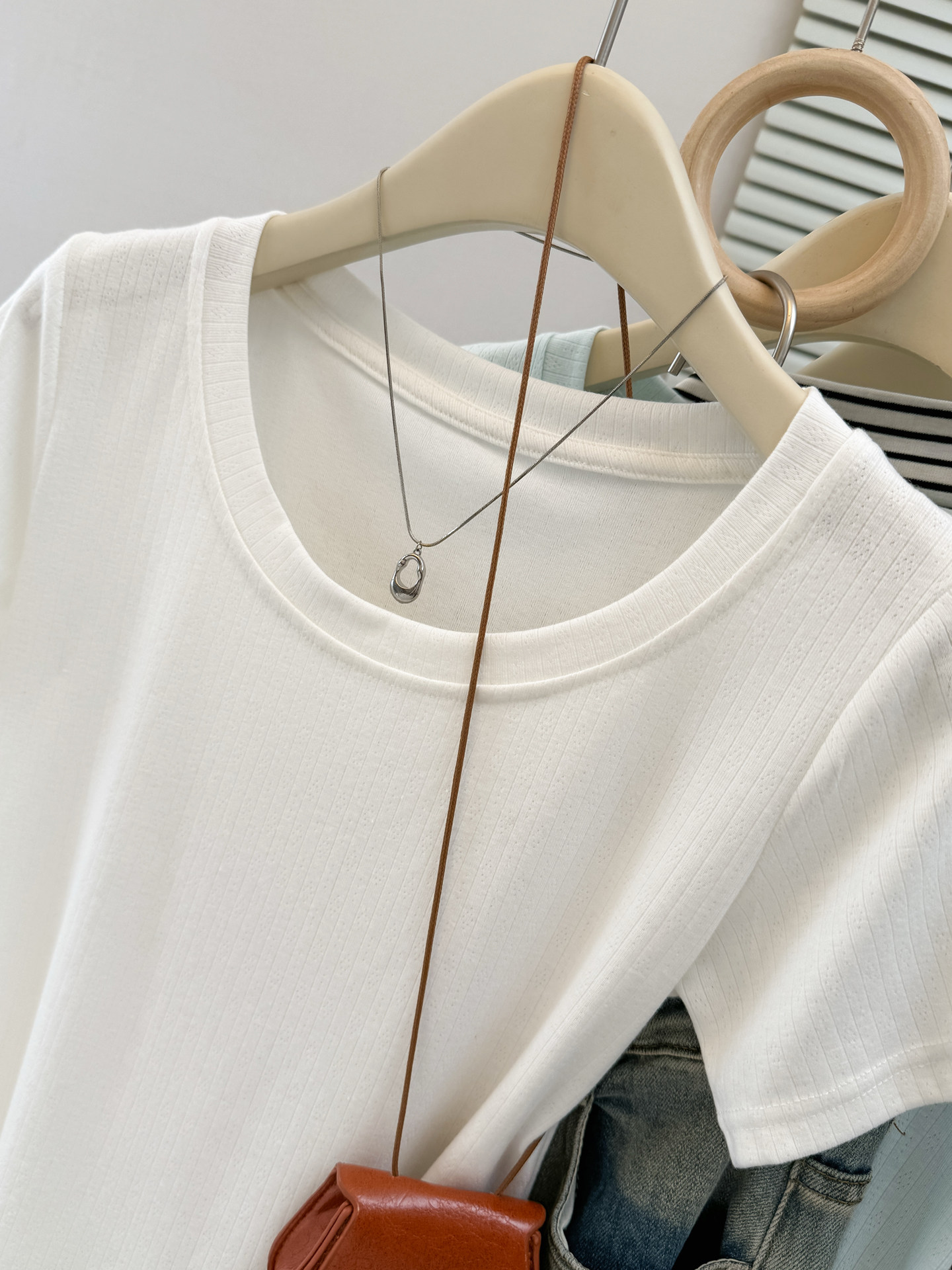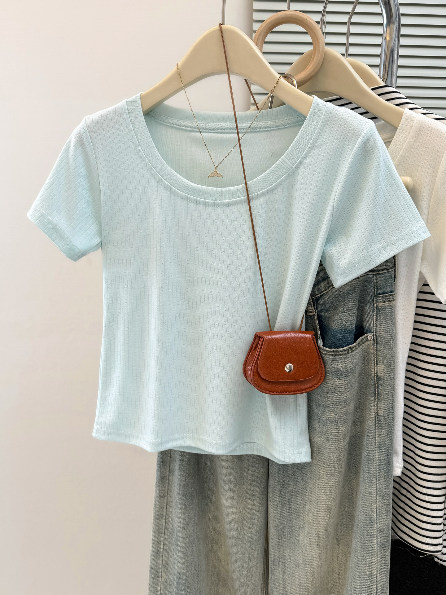 실사 작은 키 쇼트 스타일 반팔 티셔츠 여성 여름 새로운 몸매 가꾸기 한국 스타일 인사이드 가져 가라. 기본 셔츠 긍정적 인 어깨 u 칼라 맨위