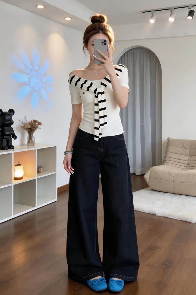 한 바람 chic 전체 집합 여름 ootd 착용 가져 가라. 오프숄더 맨위 와이드 레그 팬츠 어린이 초여름 아름다운 캐주얼 세트