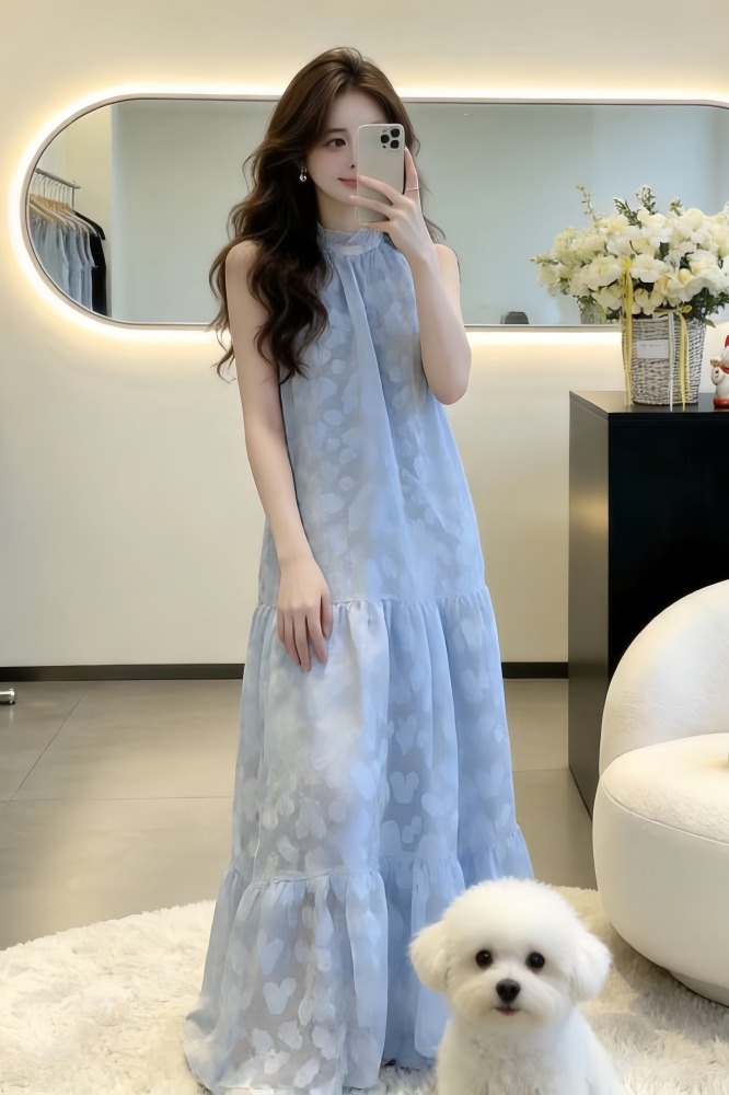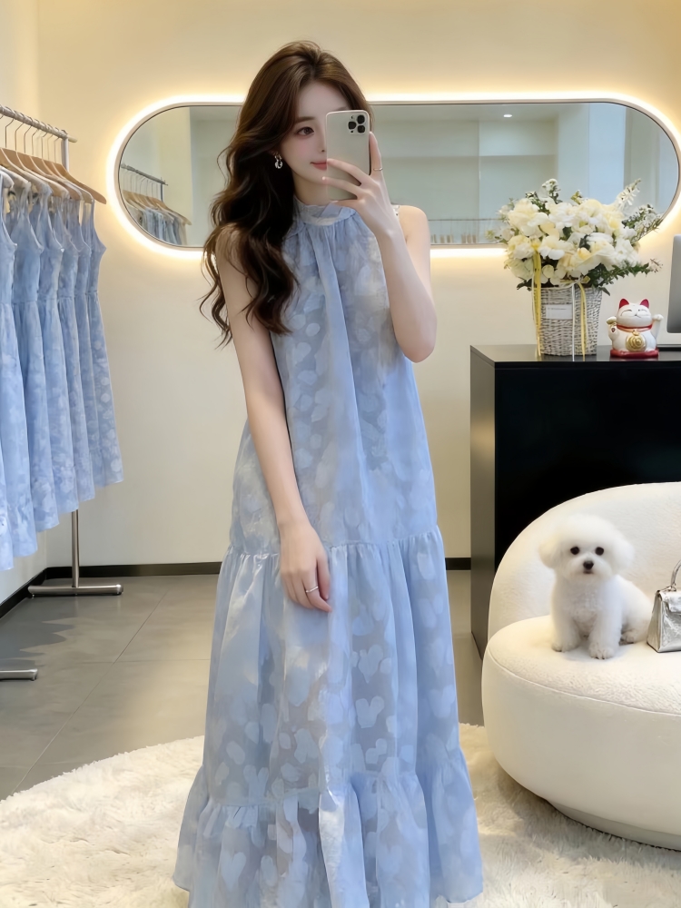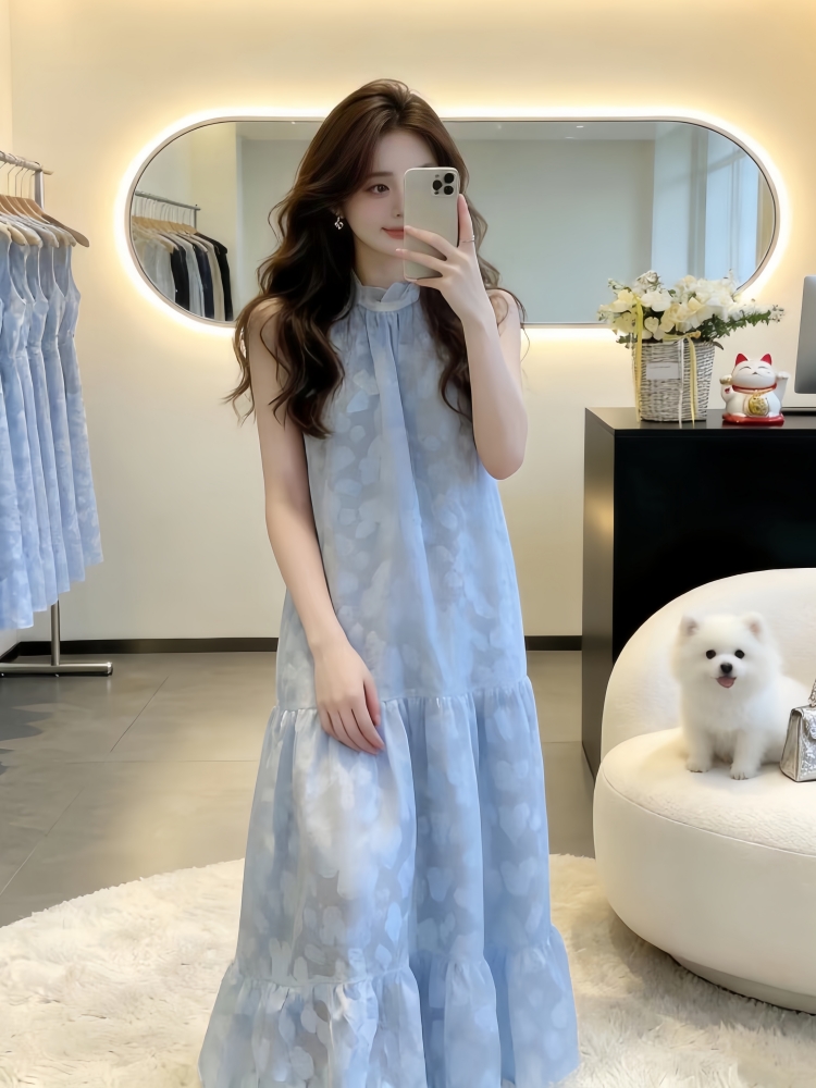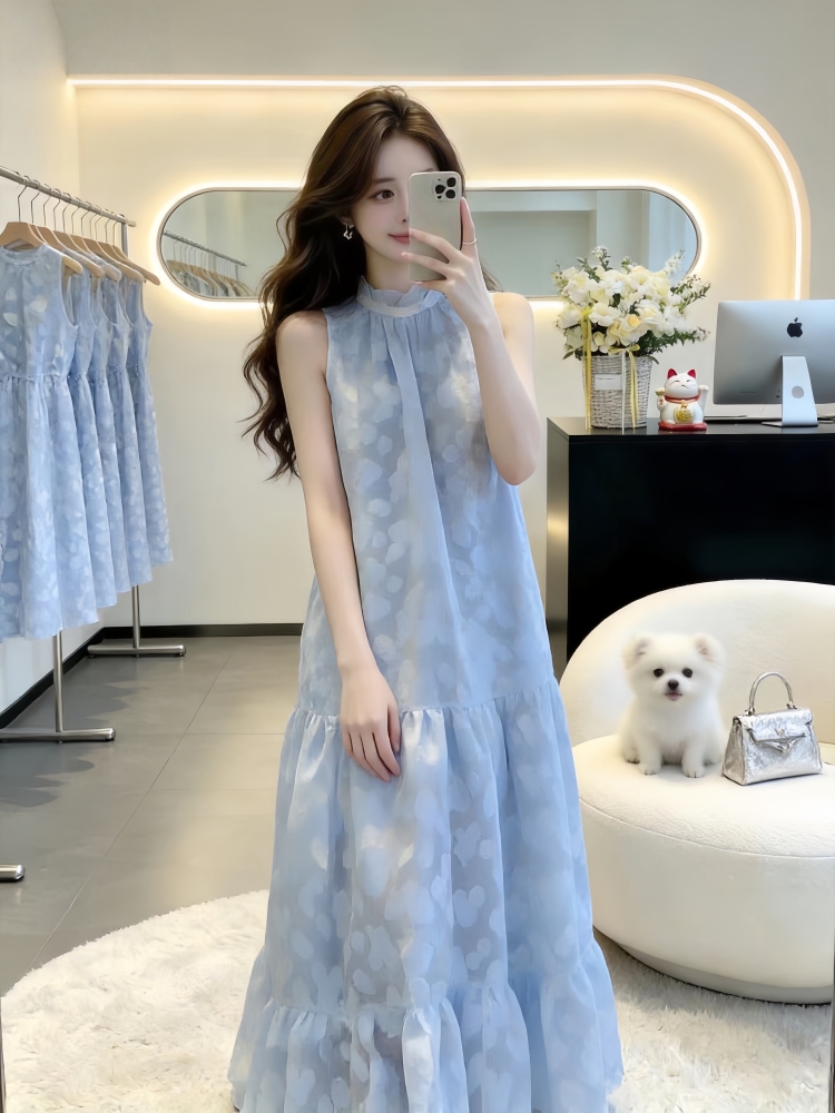 휴가 바람 파란색 행침 목 쉬폰 여성 드레스 2026 여름 새로운 Chic 민소매 A라인 스커트 품격 치마