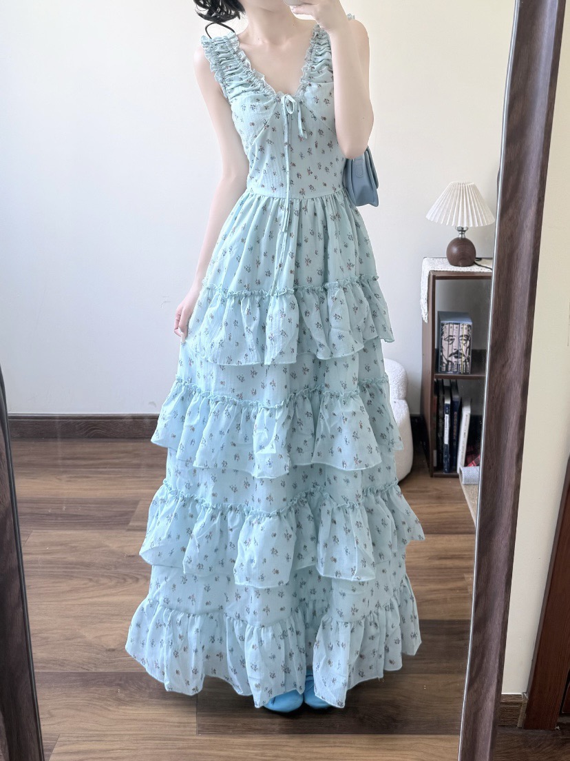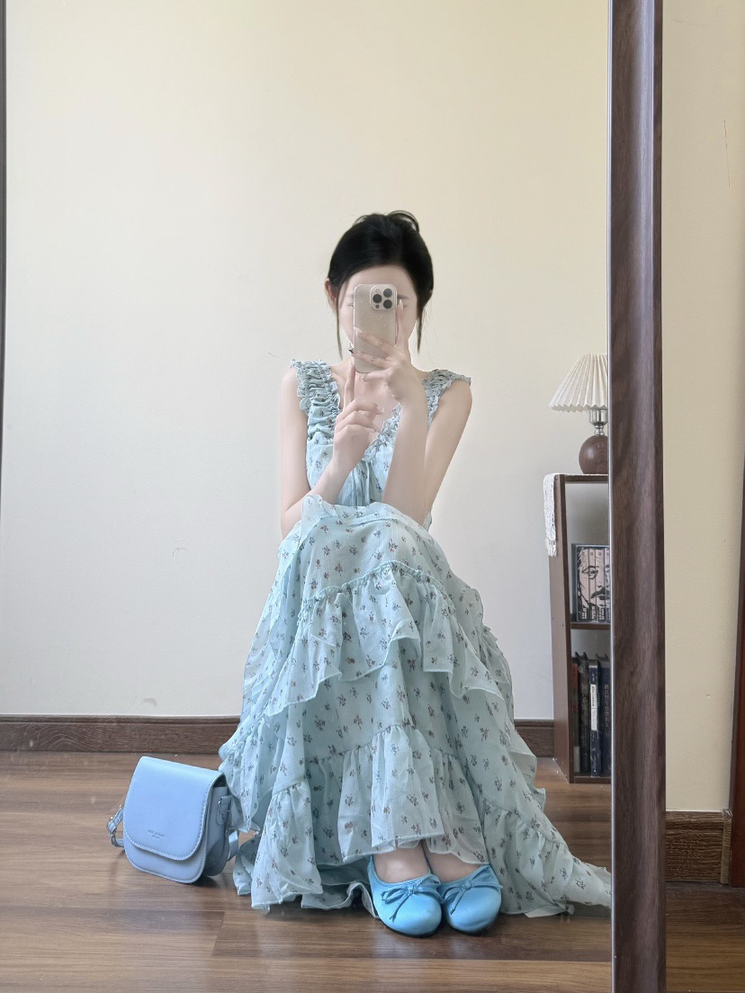 프랑스식 아름다운 프릴 꽃무늬 슬립 여성 드레스 여름 해변가 휴가 품격 몸매 가꾸기 타이트 스커트 길다 치마