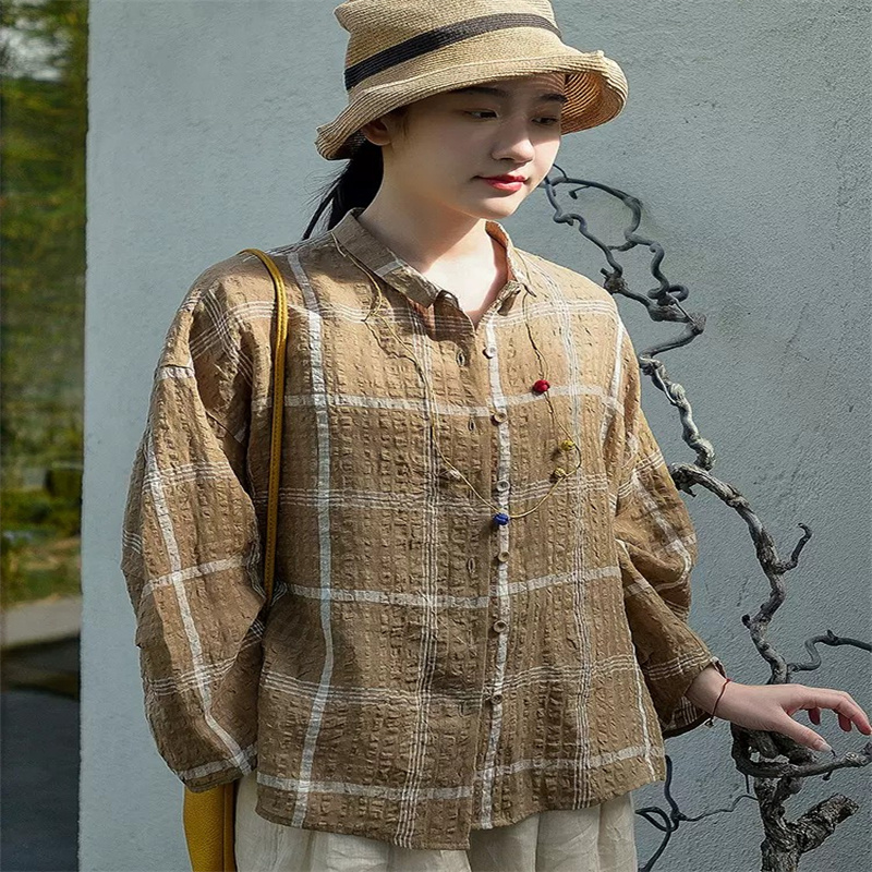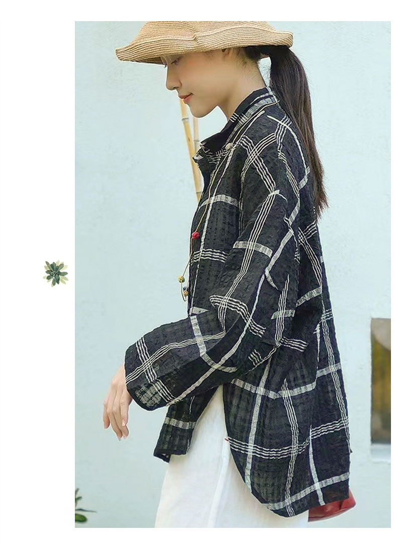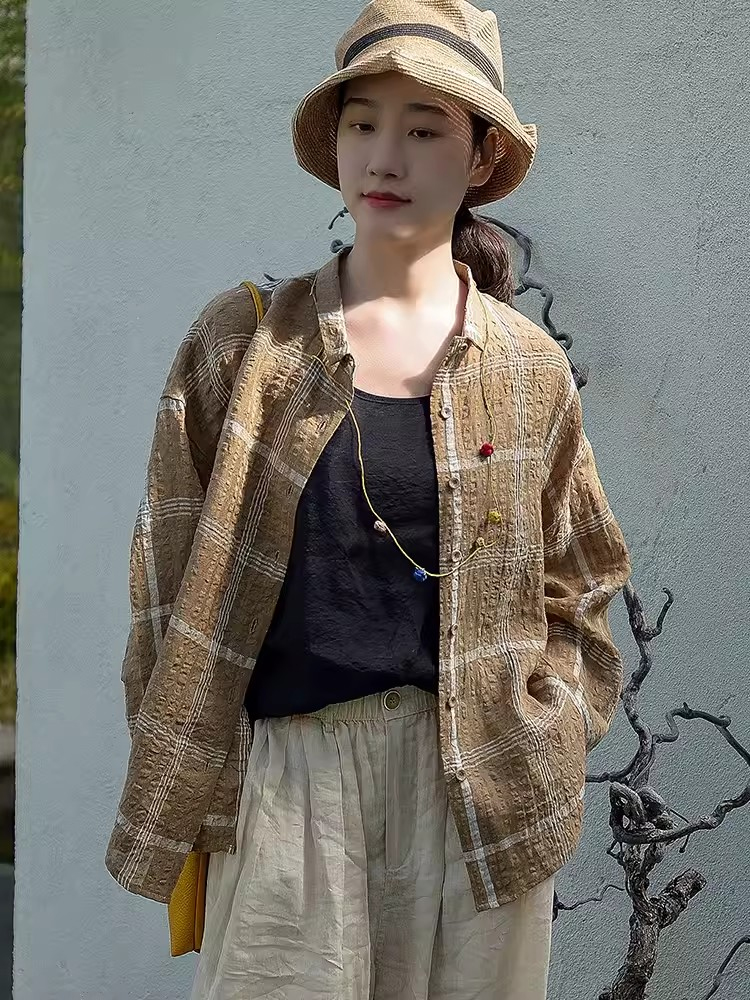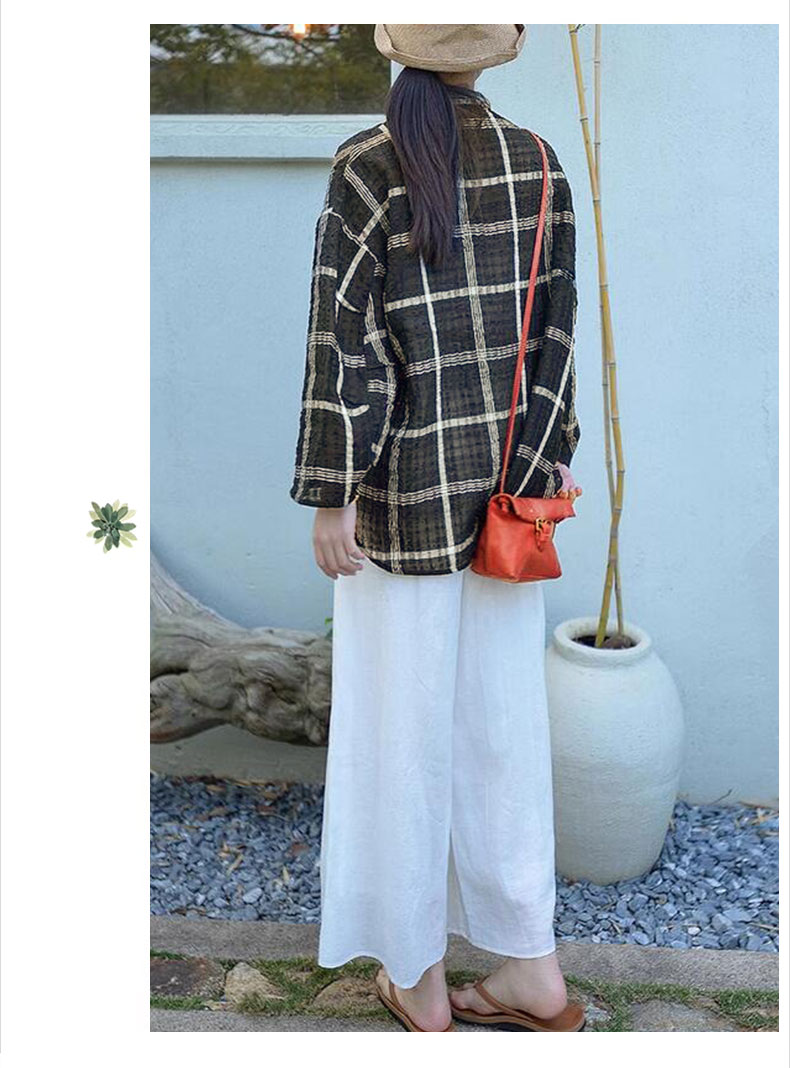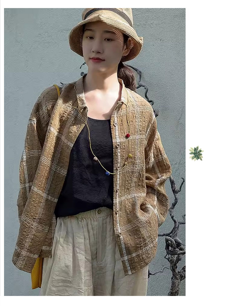 캐주얼 문예 체크무늬 루즈핏 질감 면 린넨 셔츠 느긋한 바람 피터 팬 칼라 긴팔 얇고 가벼운 오픈 가디건