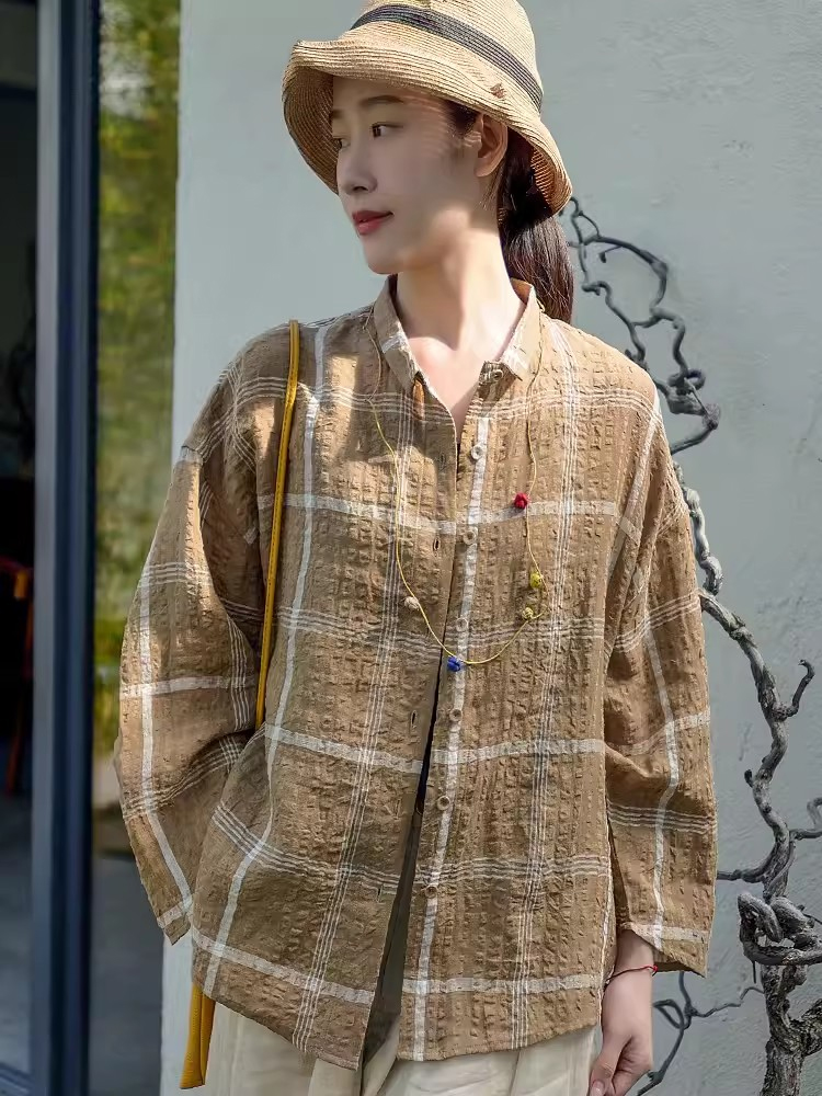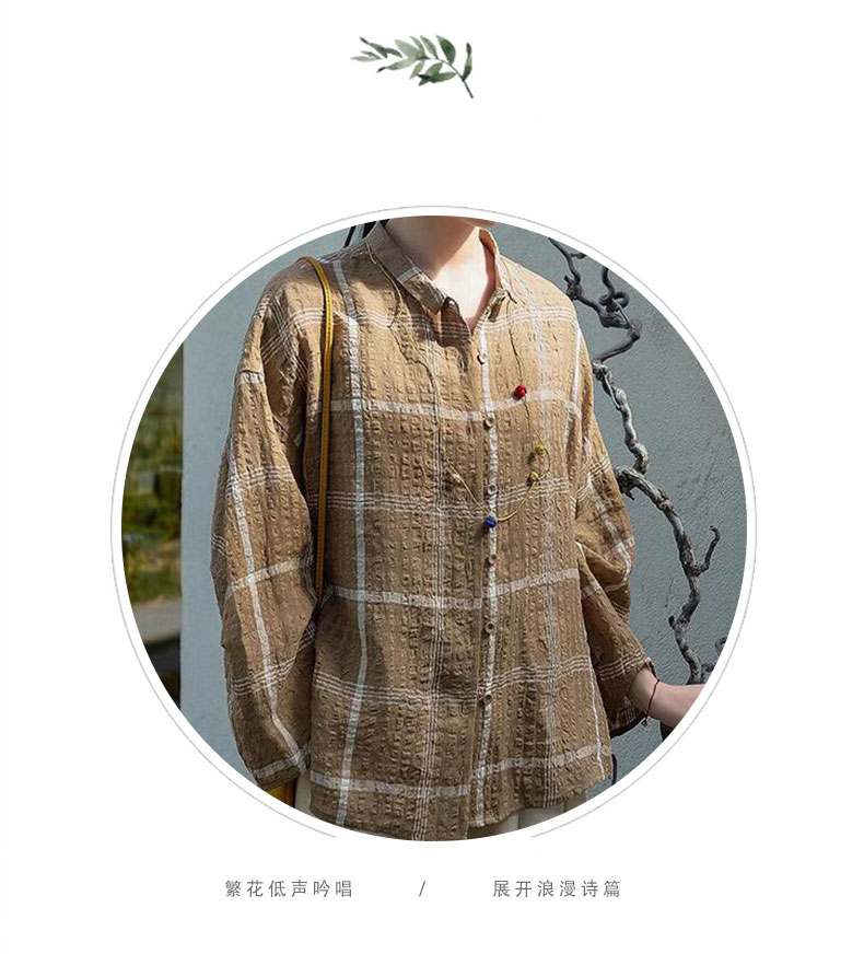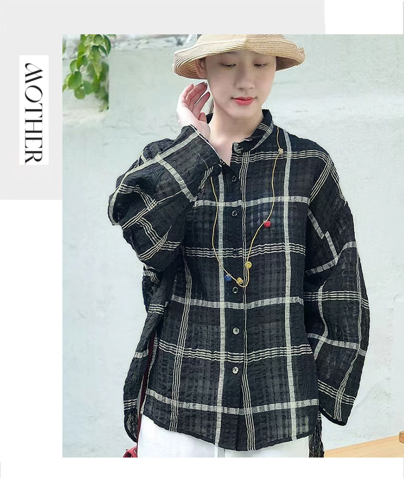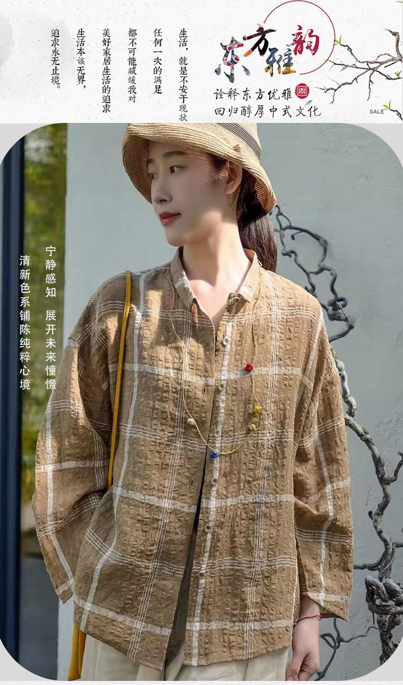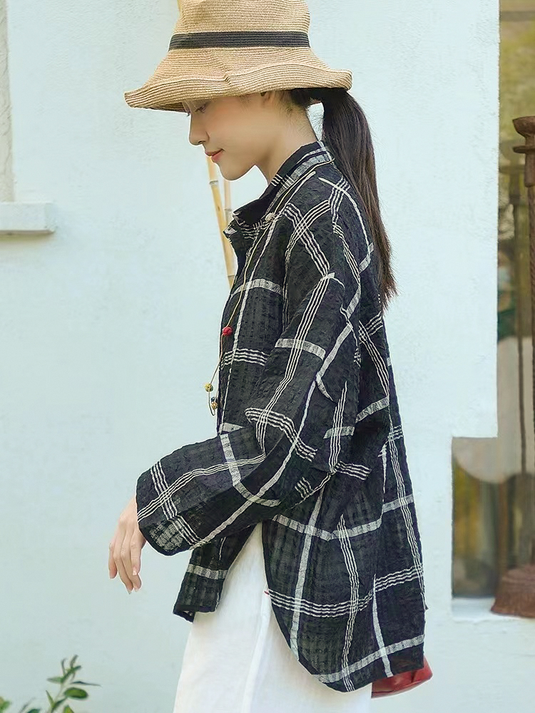 캐주얼 문예 체크무늬 루즈핏 질감 면 린넨 셔츠 느긋한 바람 피터 팬 칼라 긴팔 얇고 가벼운 오픈 가디건