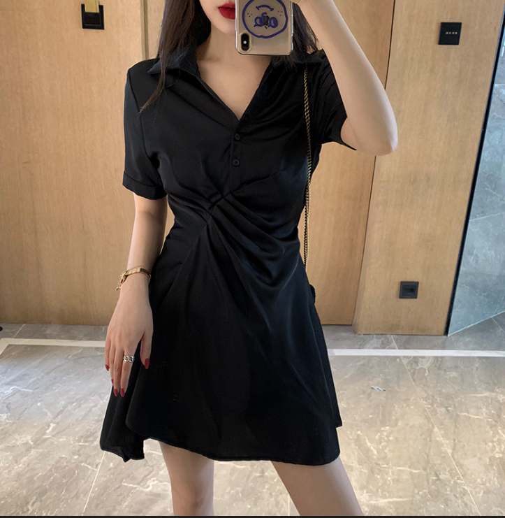 실사 거품 소매 작은 검은 드레스 빅 사이즈 해군 칼라 드레스 지방 mm 허리 수축 슬림해 보이는 A라인 스커트