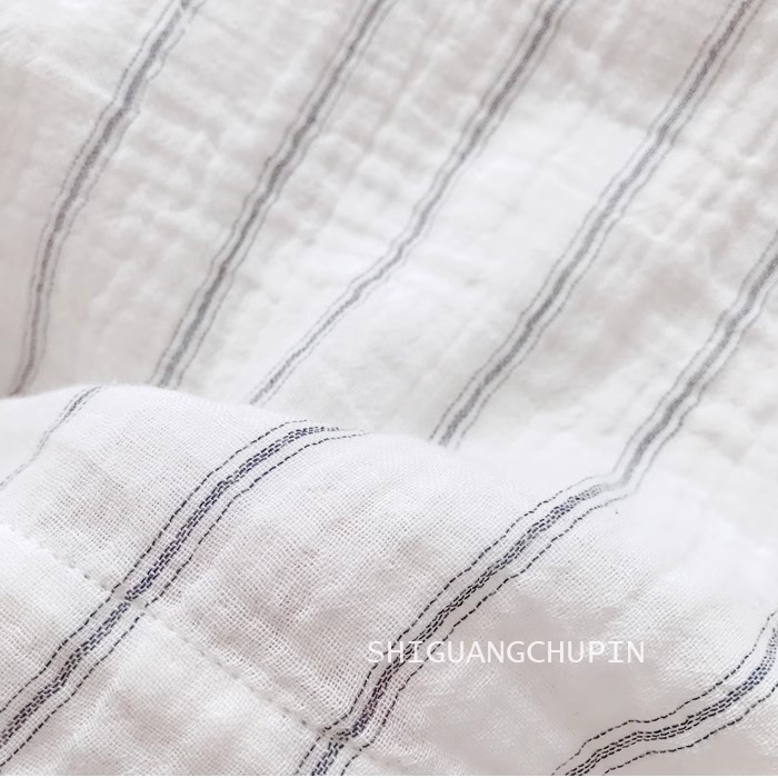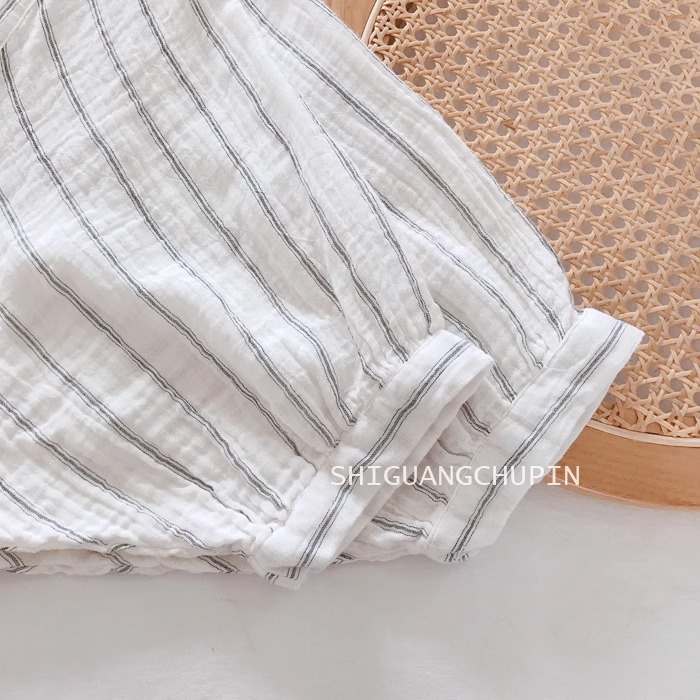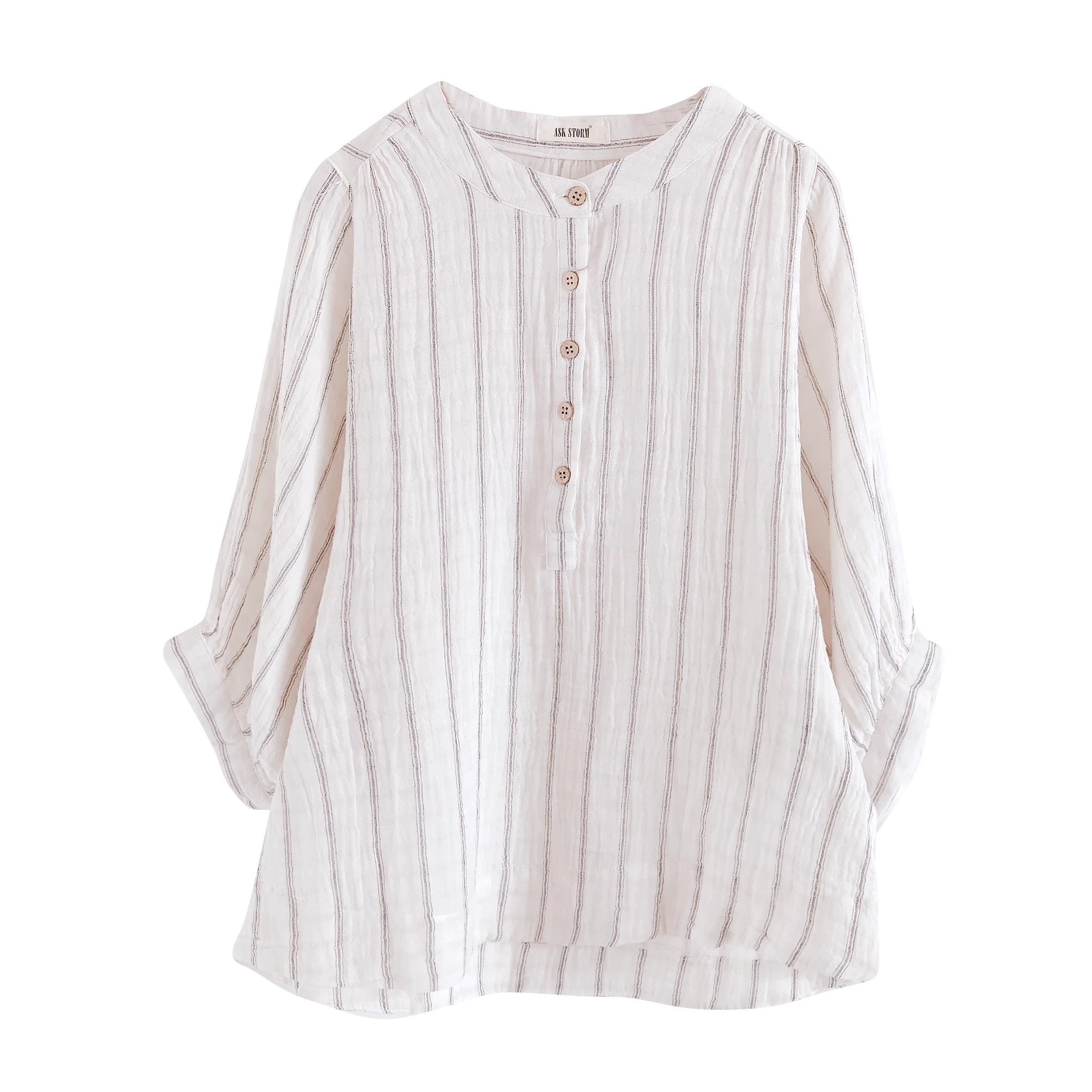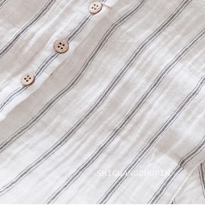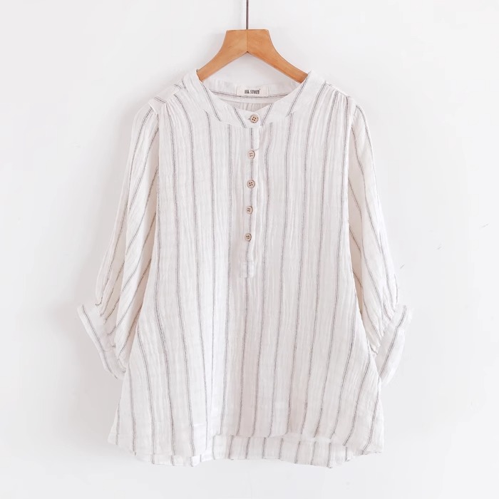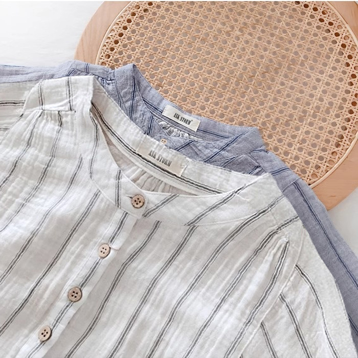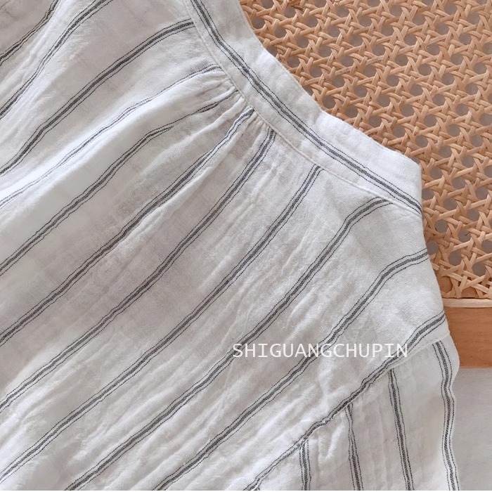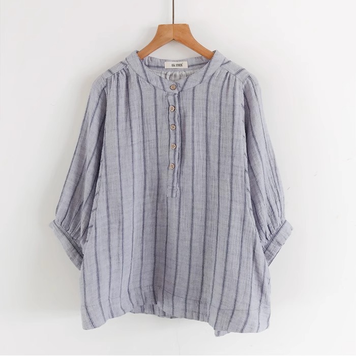일식 문예 면사 맨위 작은 셔츠 자연 질감 주름 센스 미니멀리즘 세로 줄무늬 루즈핏 배트윙 소매 여성 셔츠