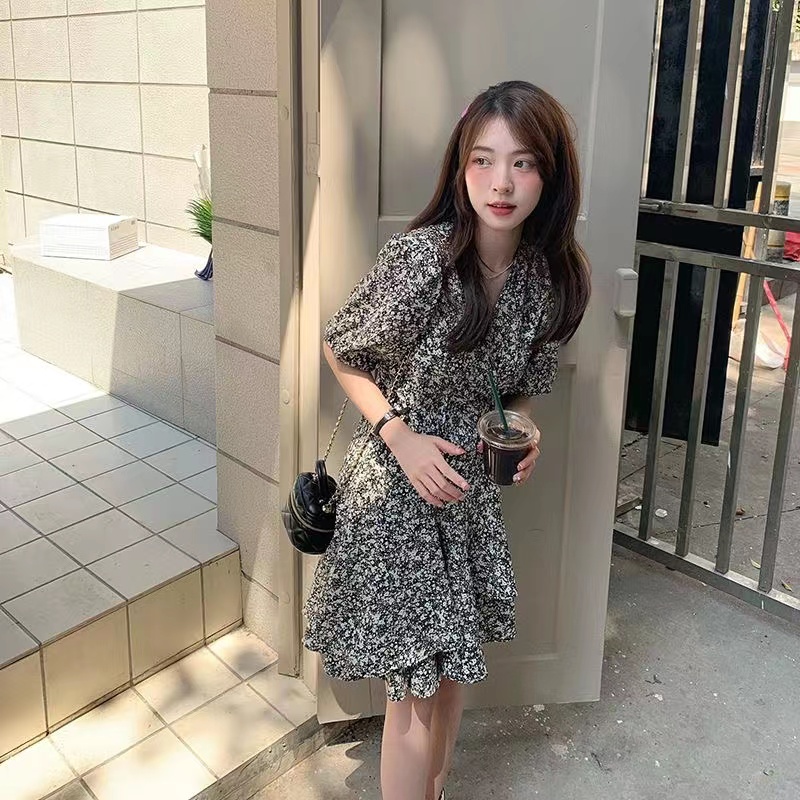 실사 여름 드레스 새로운 한국 스타일 빅 사이즈 여성 의류 허리 수축 V넥 거품 소매 작은 대중 드레스 m-4xl200 근