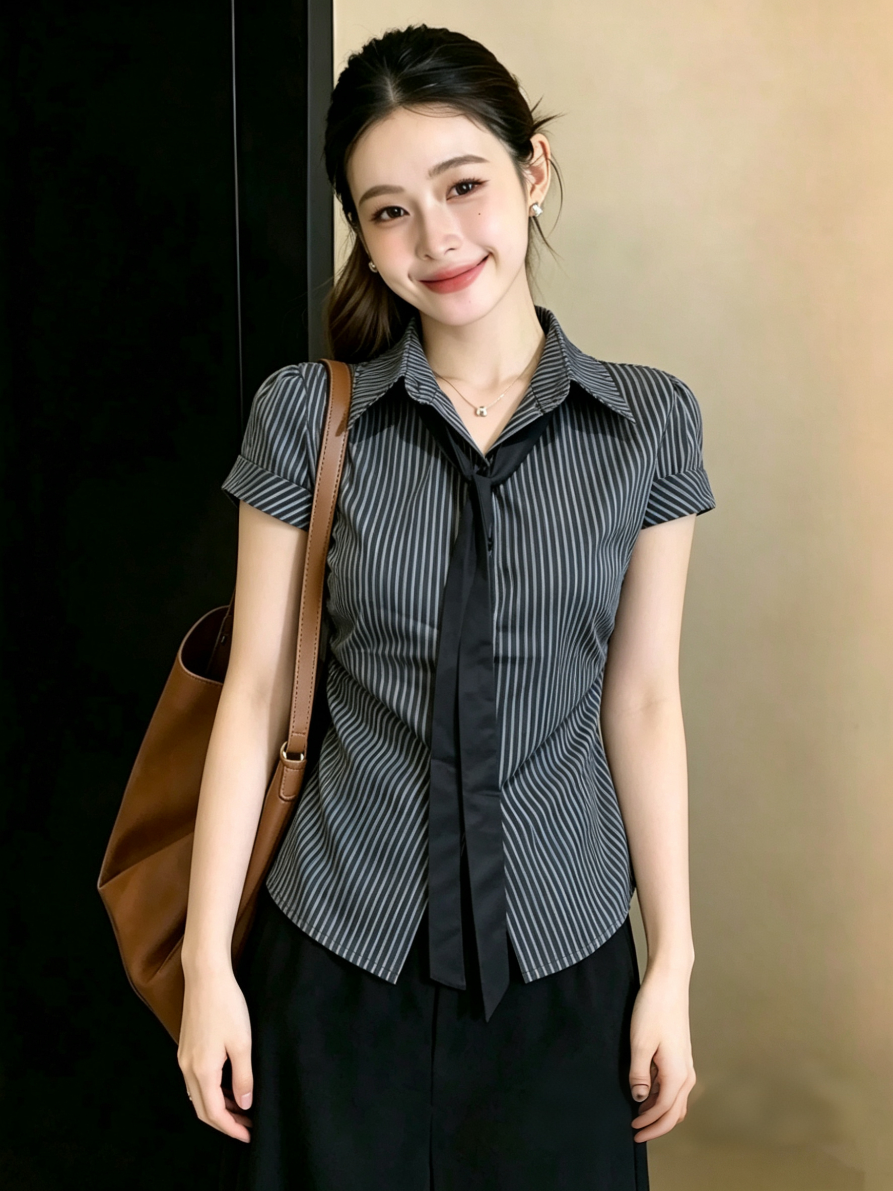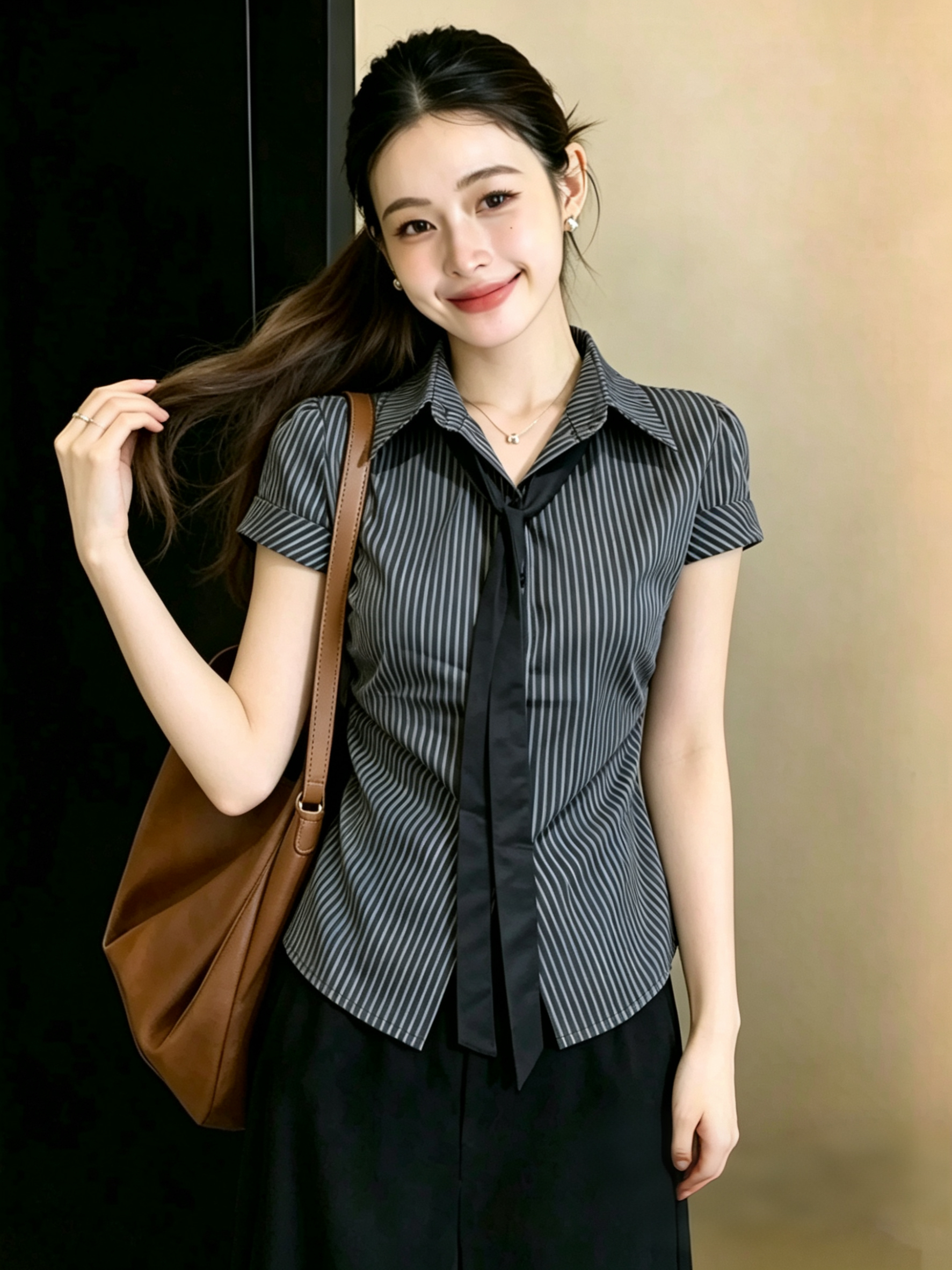 있음 선적 빅 사이즈 아메리칸 레트로 순수한 욕망 바람 스트라이프 반팔 여성 셔츠 디자인 센스 꼬집기 허리 슬림해 보이는 맨위