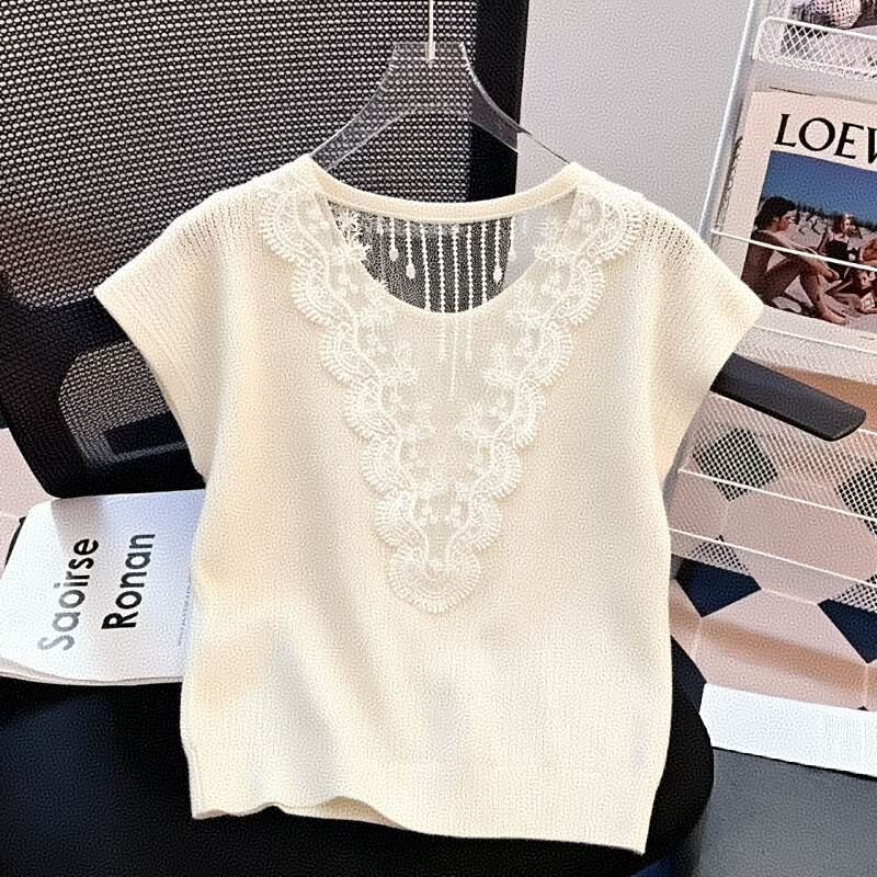 한 부서 레이스 조각 페이크 레이어드 니트 스웨터 여성 프릴 디자인 센스 몸매 가꾸기 슬림해 보이는 반팔 맨위 여름