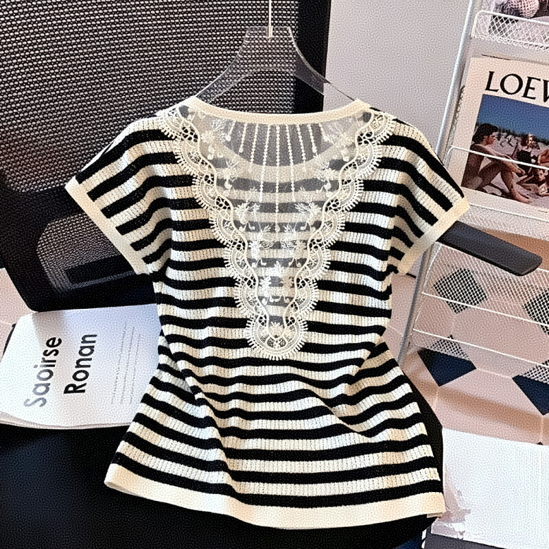 뒤로 홀로우 아웃 레이스 조각 스트라이프 니트 스웨터 여성 여름 새로운 디자인 센스 작은 심장 기계 기본 셔츠 맨위 얇은