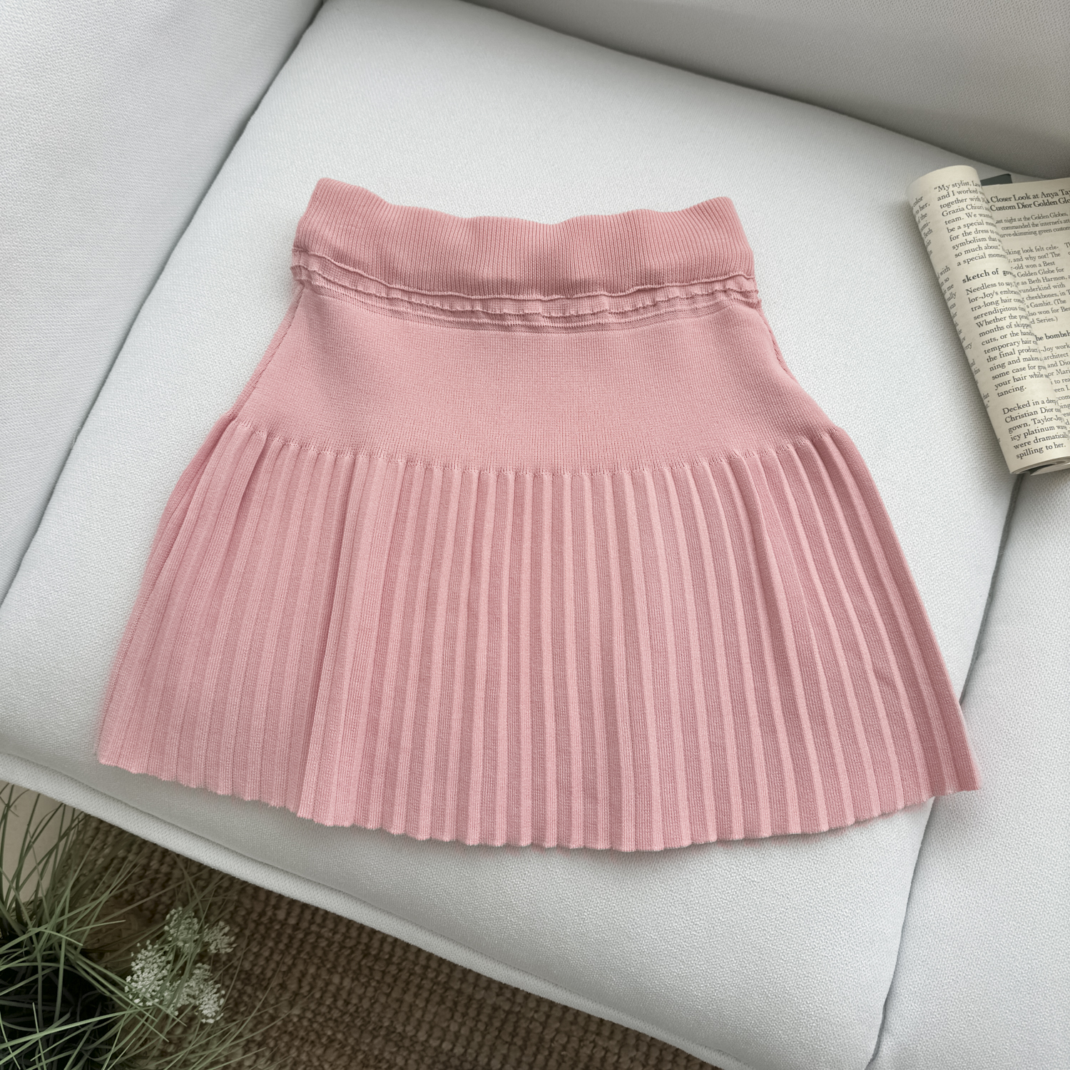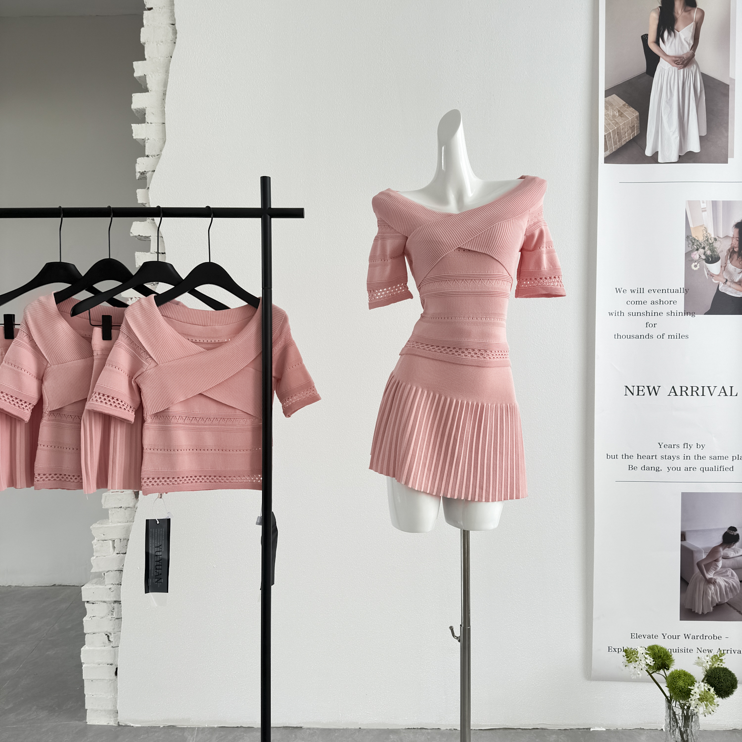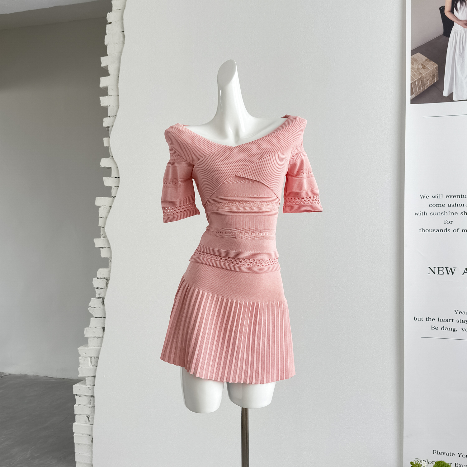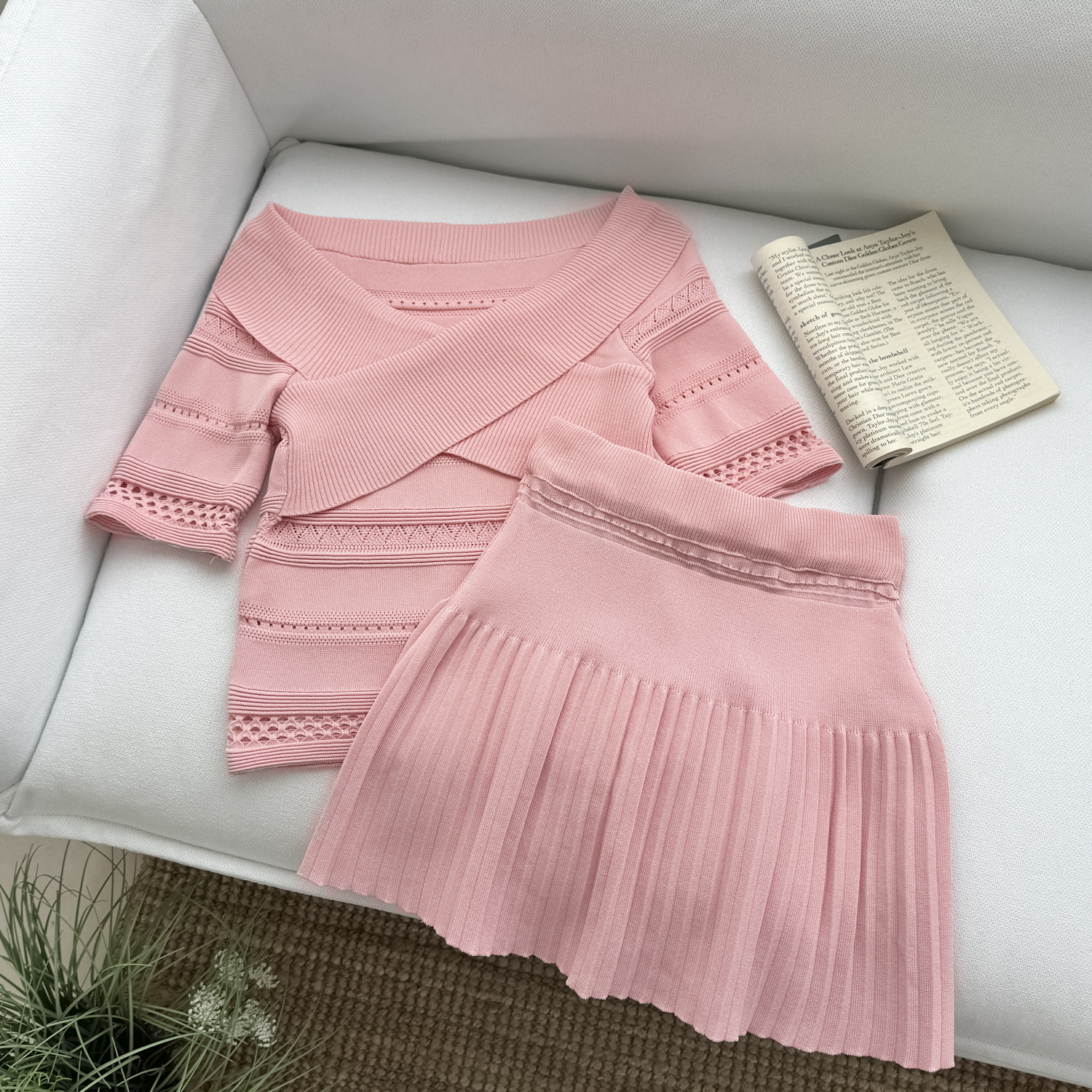 작은 岚 급우 분말 여름 복숭아 십자가 튜브탑 니트 맨위 몸매 가꾸기 플리츠 미니 스커트 세트 두 조각 여성 세트