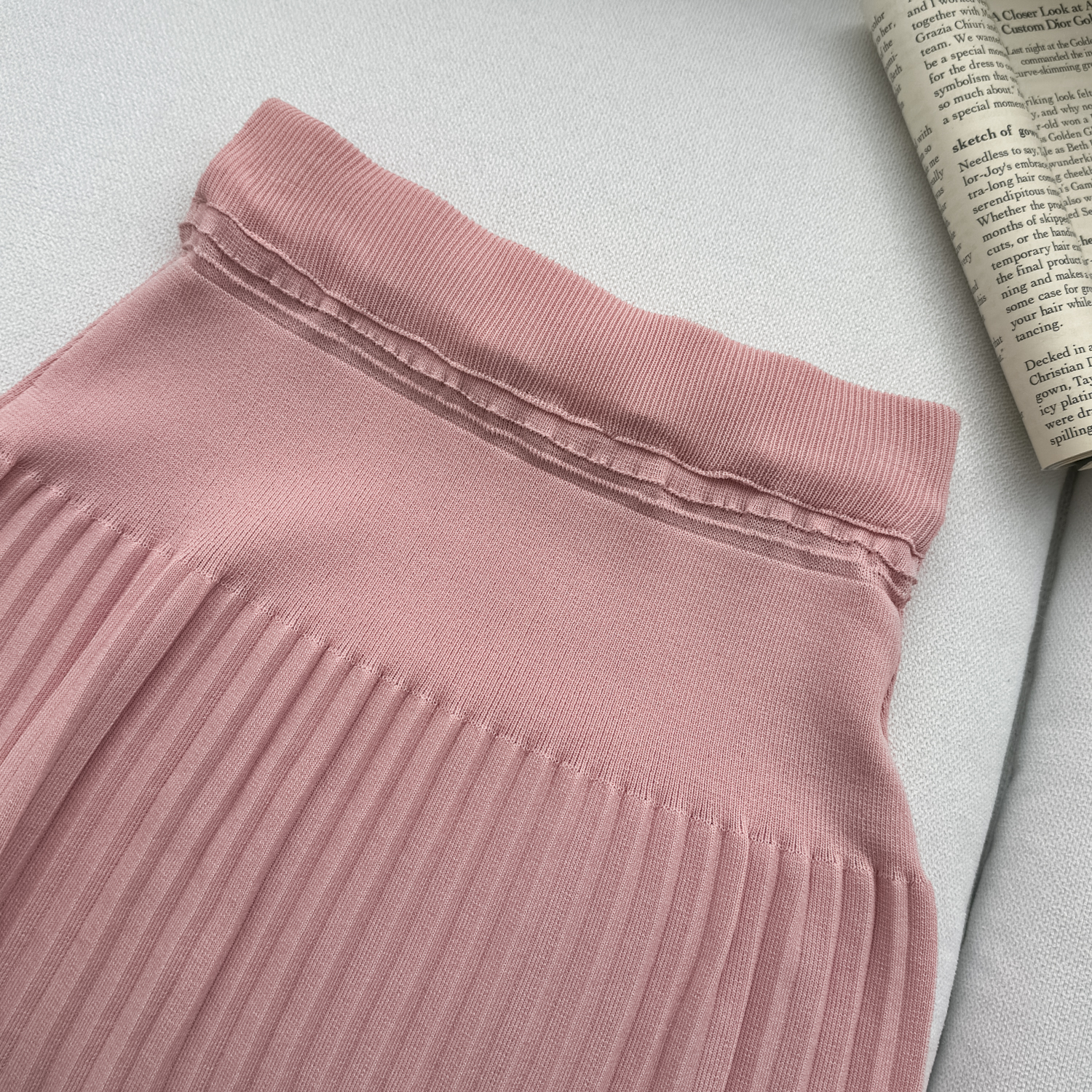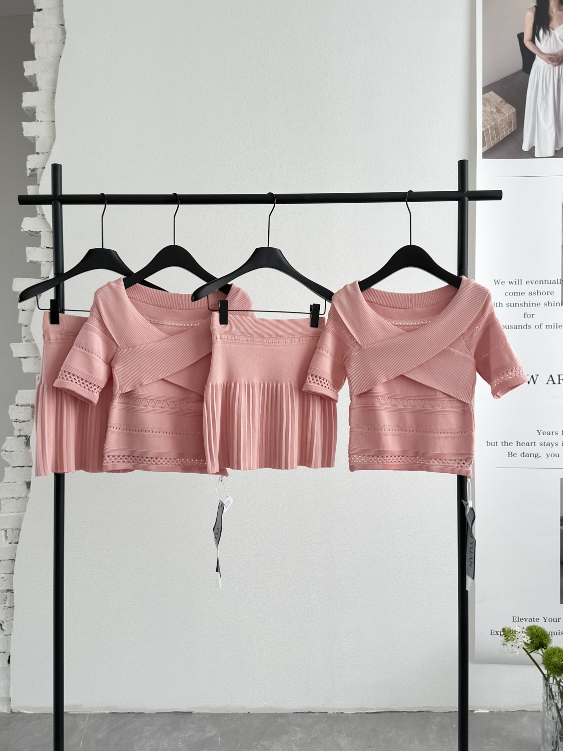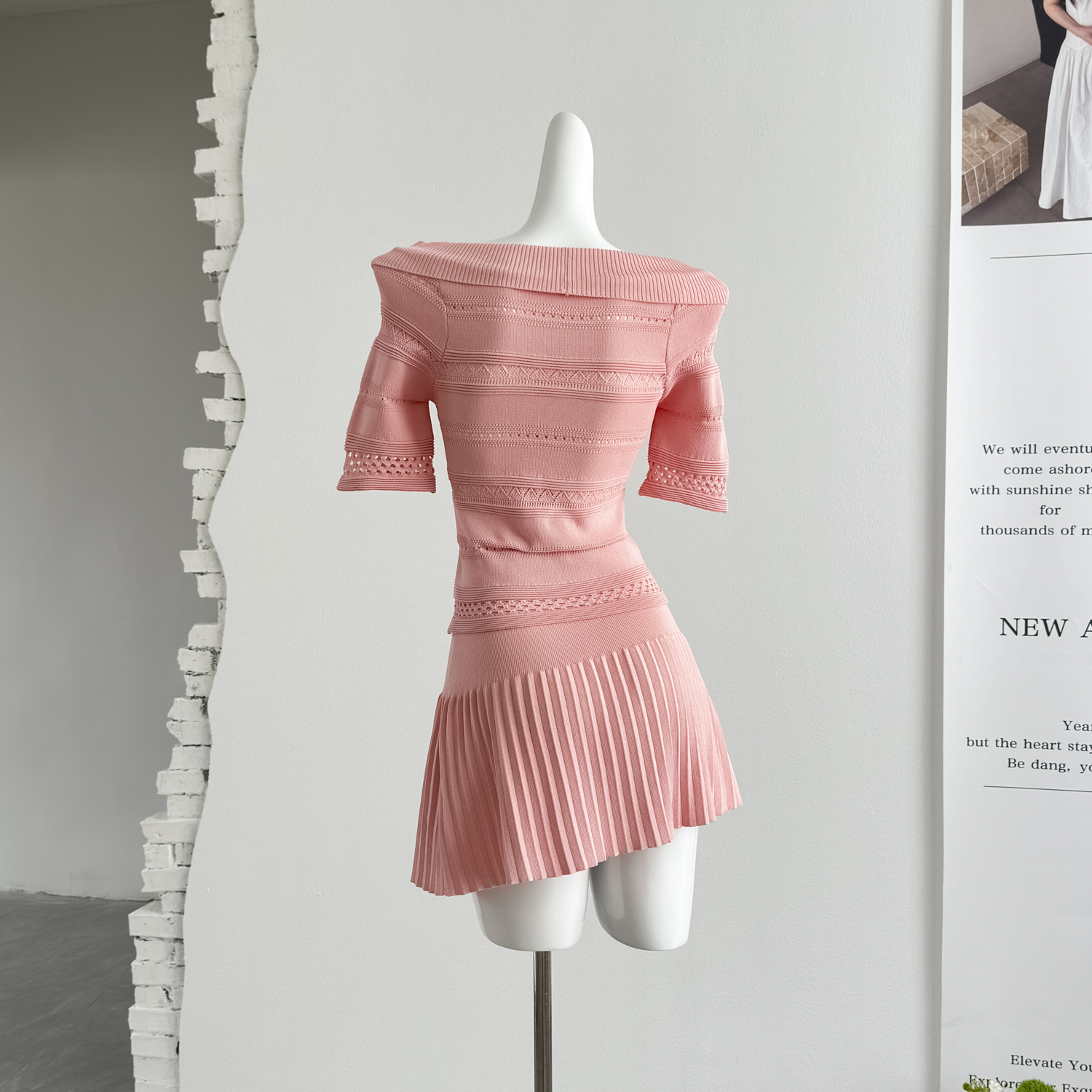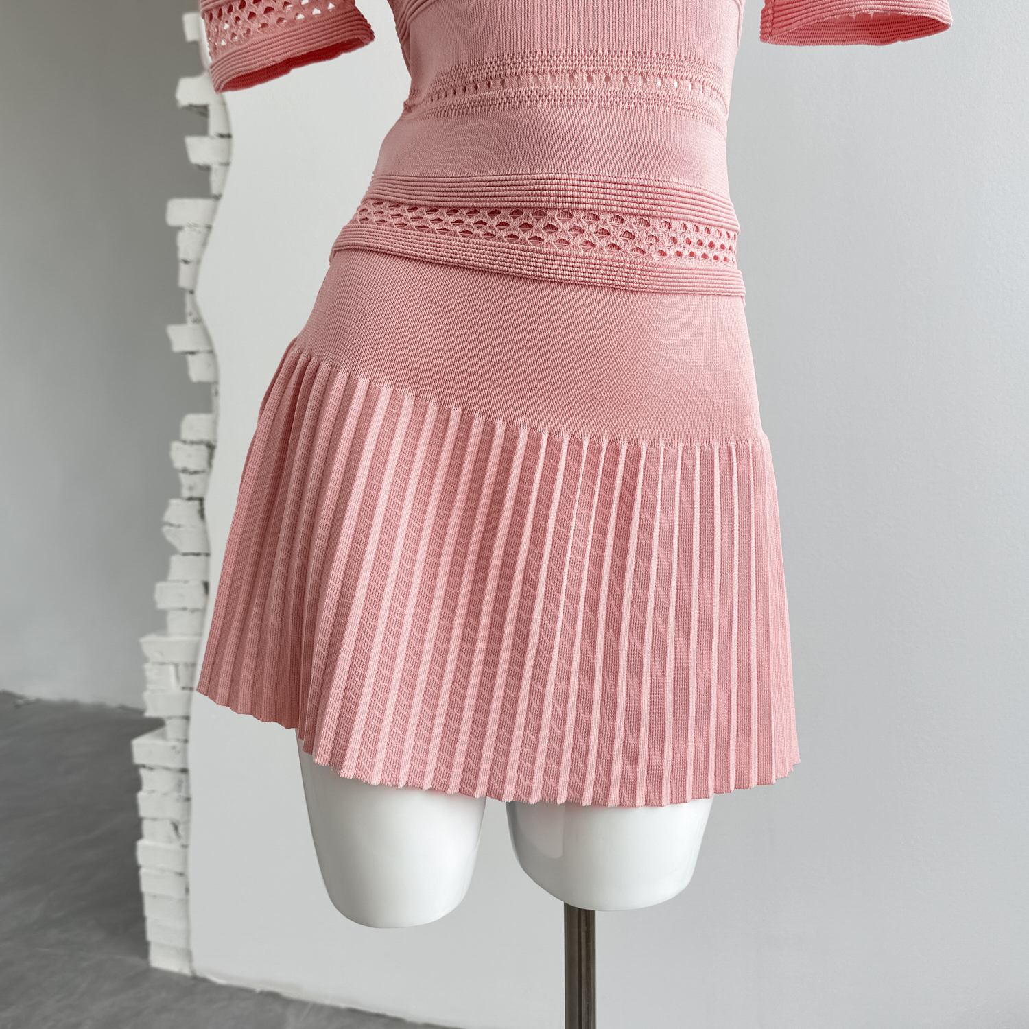 작은 岚 급우 분말 여름 복숭아 십자가 튜브탑 니트 맨위 몸매 가꾸기 플리츠 미니 스커트 세트 두 조각 여성 세트