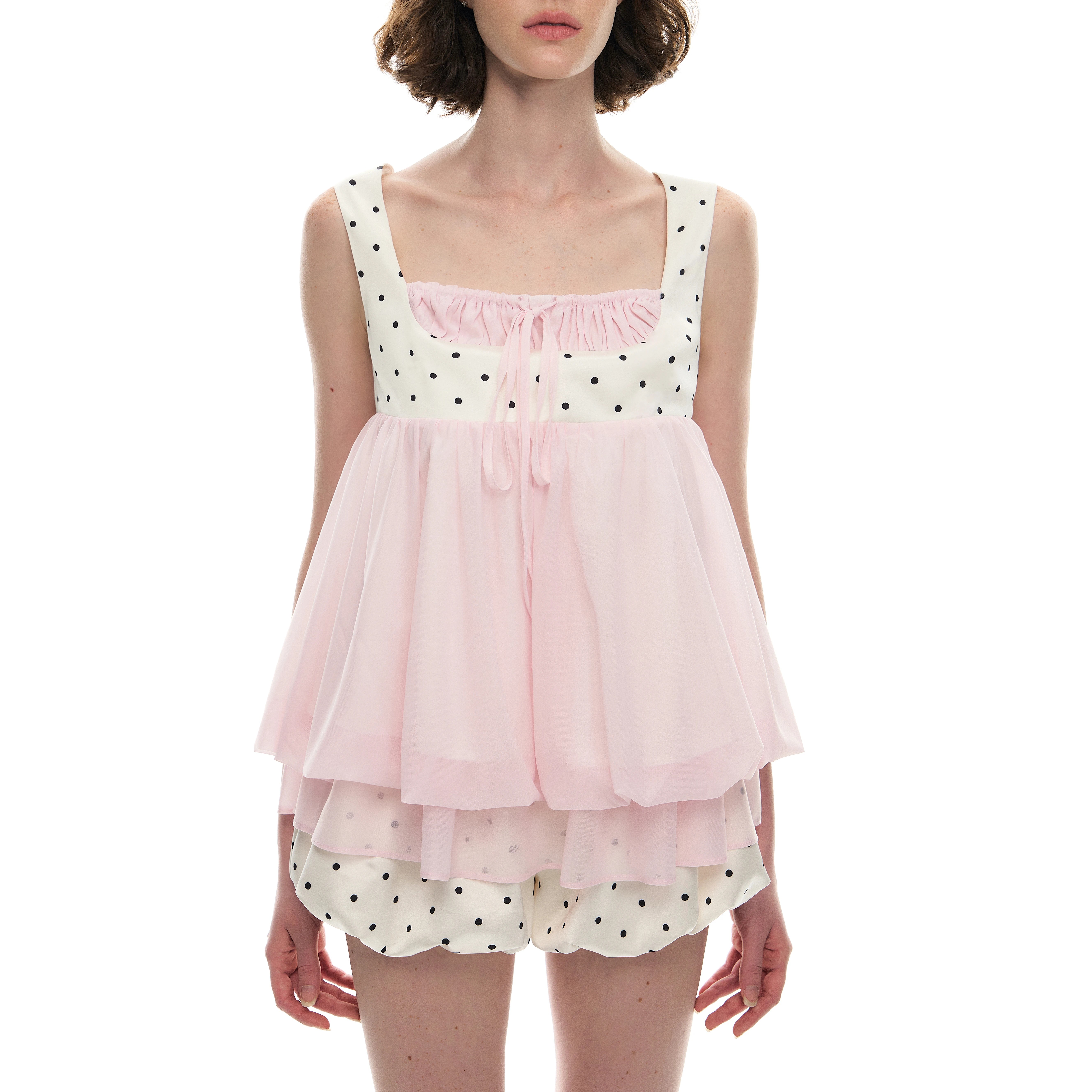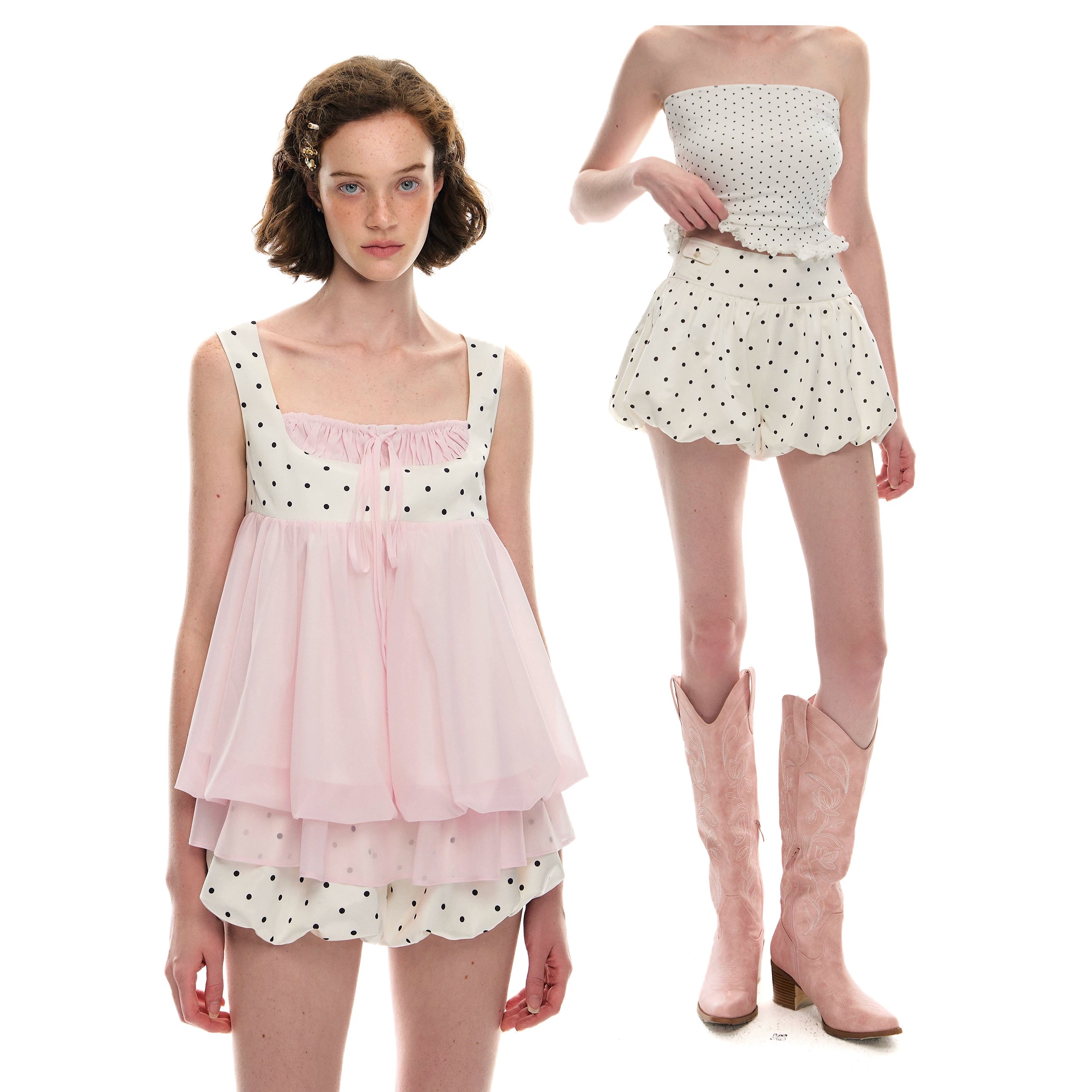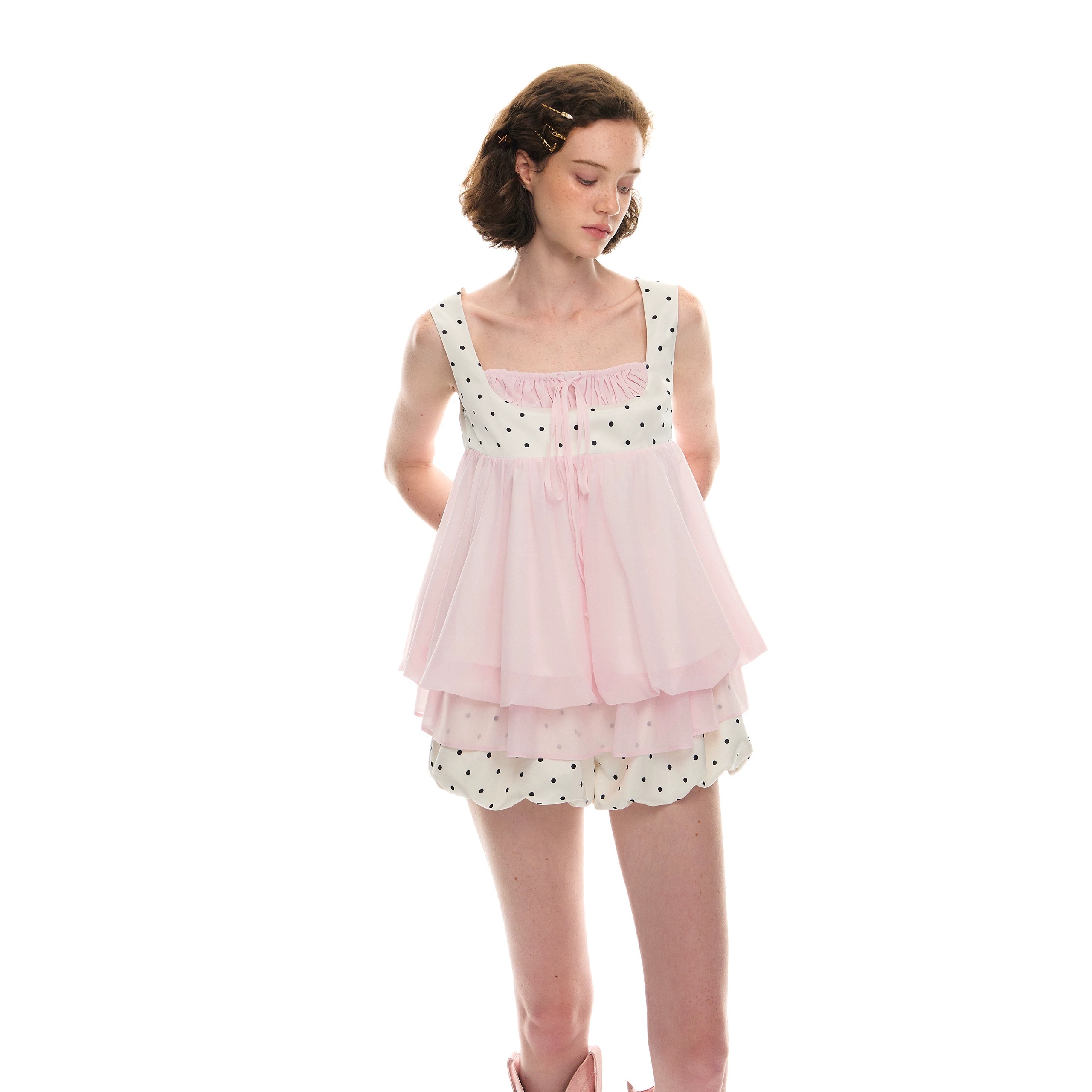 romance nanci 귀여운 doll 센스 꽃밭 조끼 한 마디 민소매 맨위 도트 무늬 치마바지 세트
