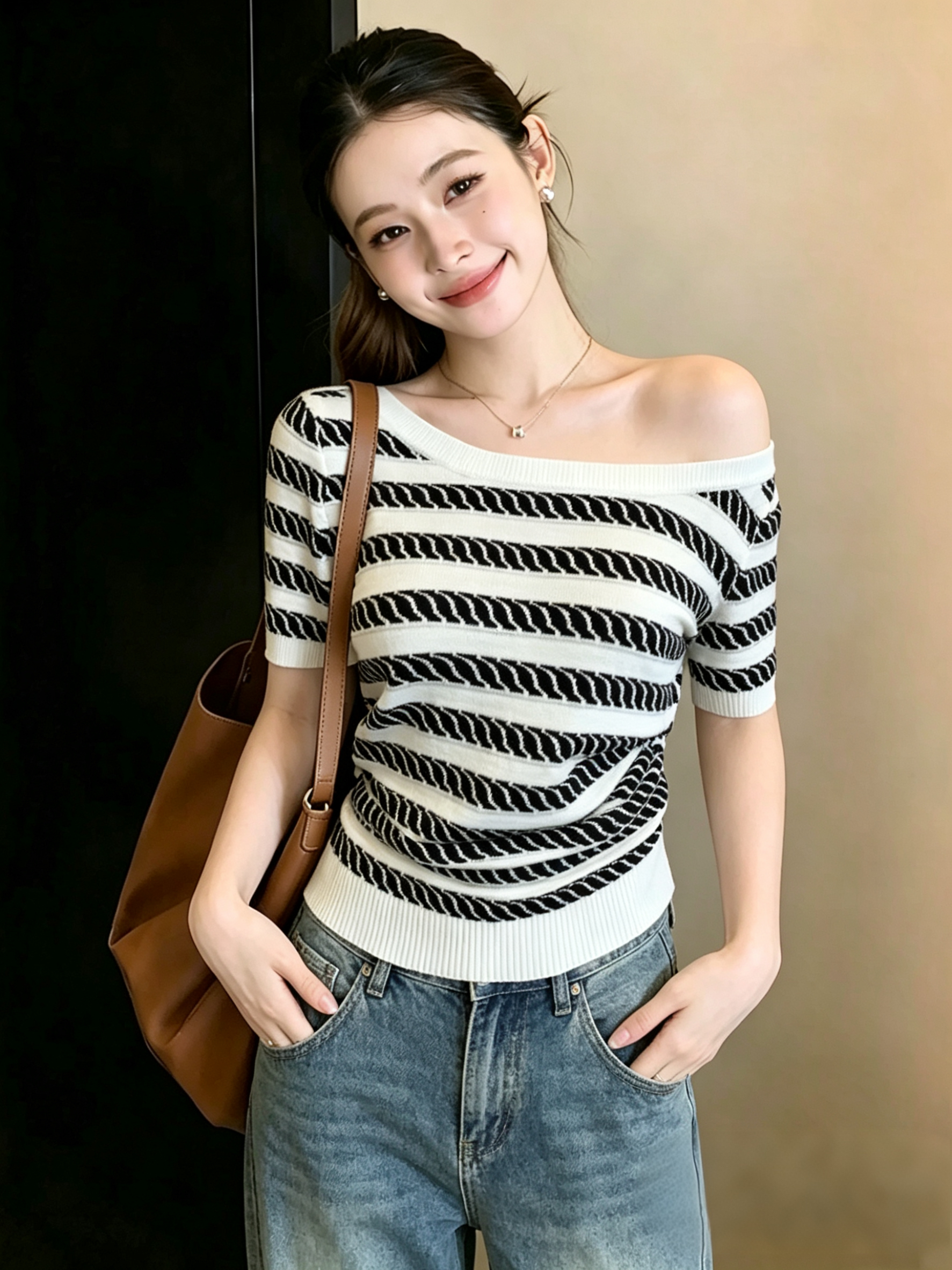 있음 선적 빅 사이즈 출퇴근 바람 비스듬한 어깨 스트라이프 반팔 니트 티셔츠 여성 디자인 센스 다양한 착용 법 슬림해 보이는 맨위