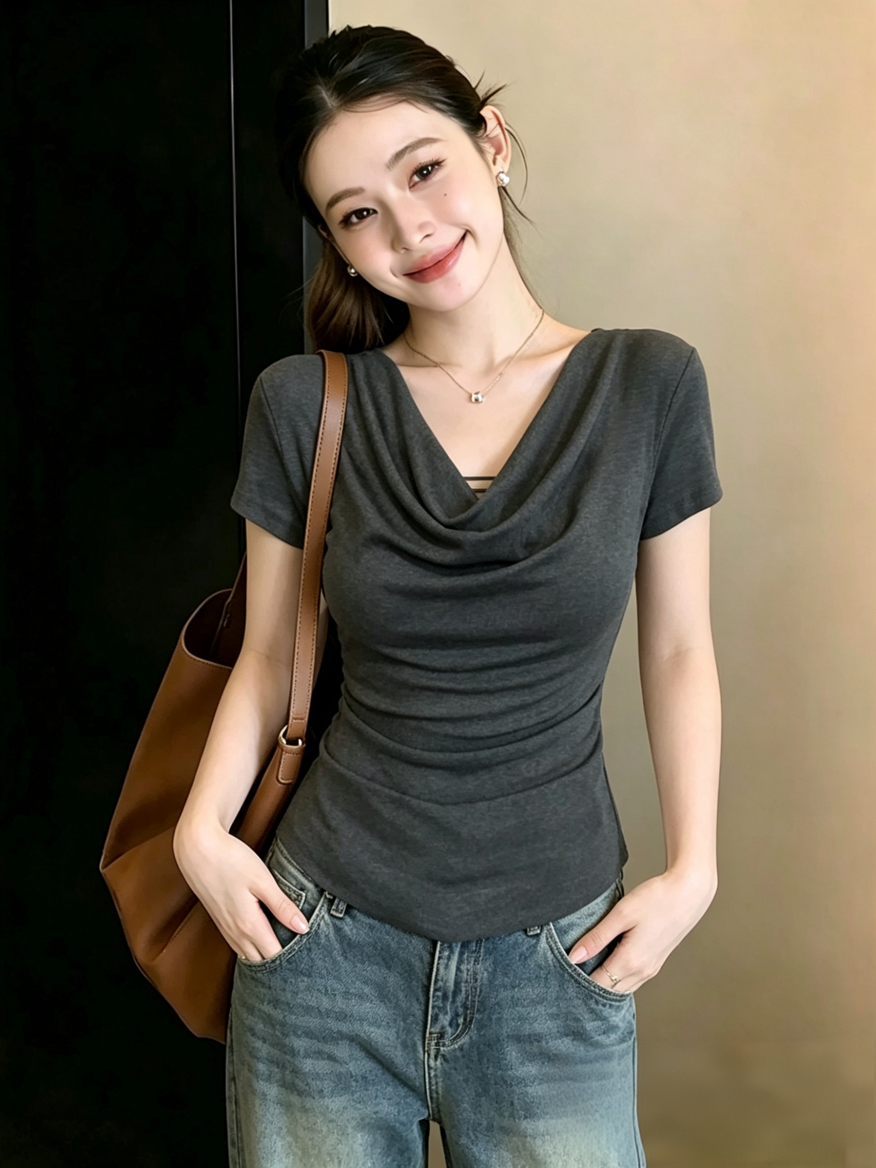 있음 선적 빅 사이즈 순수한 욕망 바람 단추 u 칼라 반팔 니트 티셔츠 디자인 센스 꼬집기 허리 슬림해 보이는 오프숄더 맨위