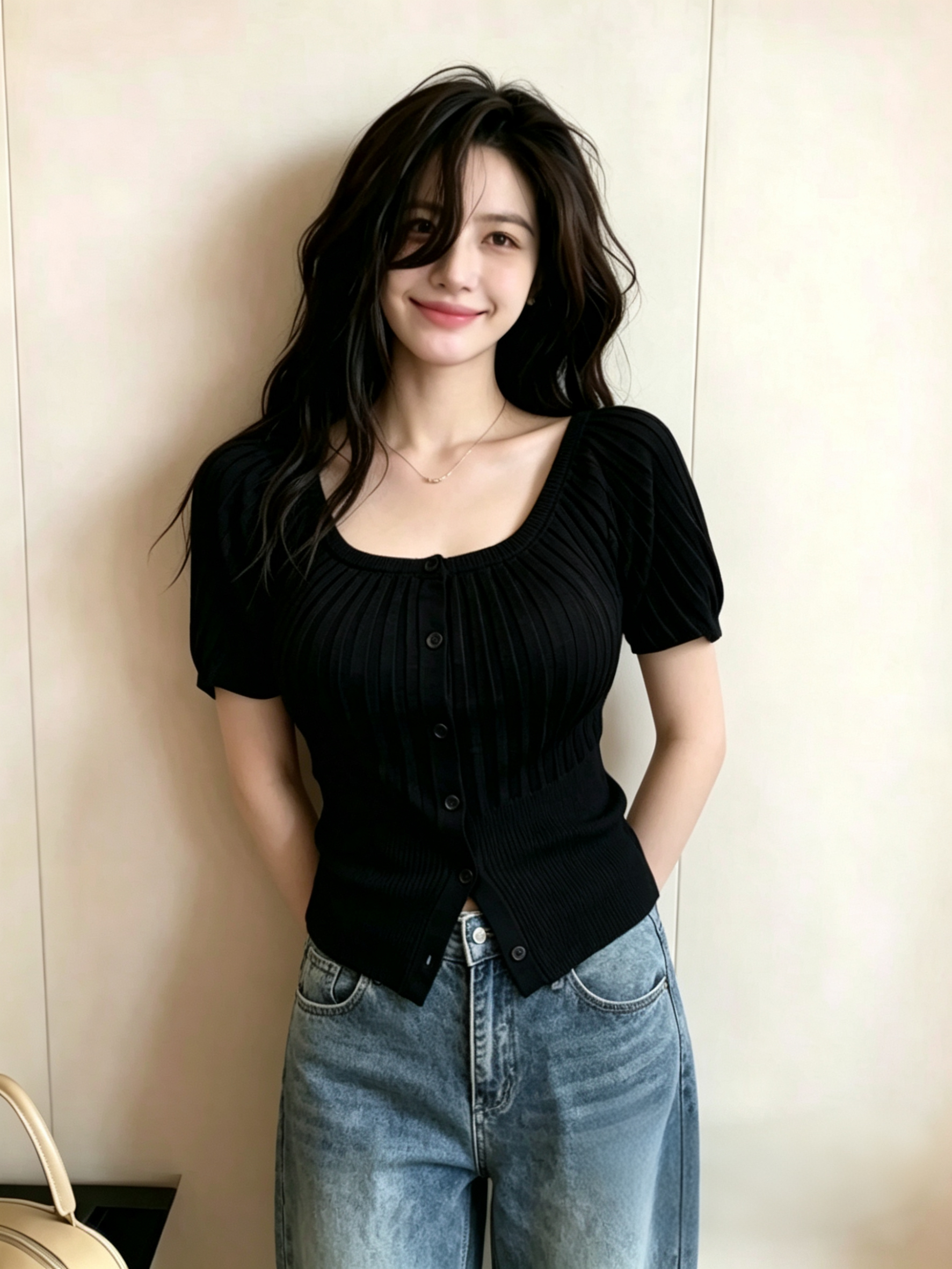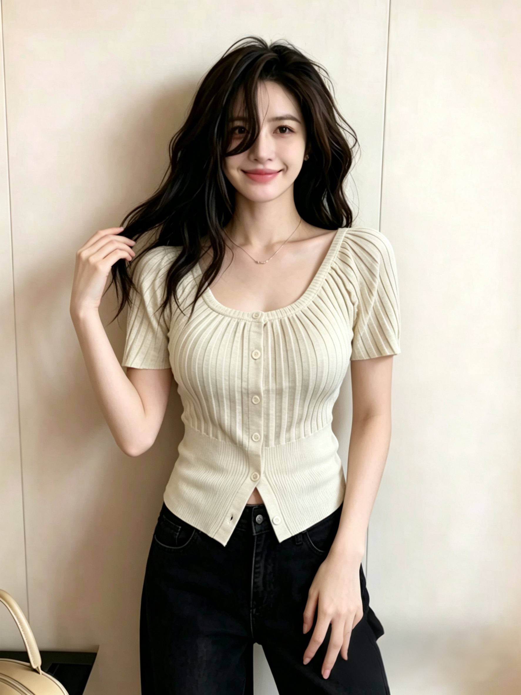 있음 선적 빅 사이즈 순수한 욕망 바람 단추 u 칼라 반팔 니트 티셔츠 디자인 센스 꼬집기 허리 슬림해 보이는 오프숄더 맨위