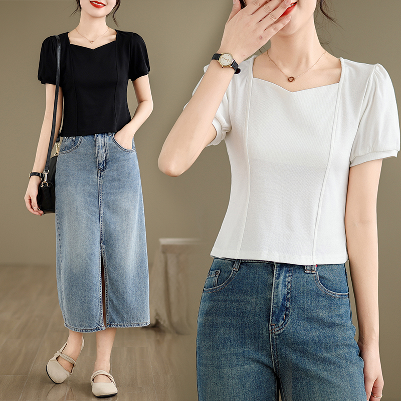 실사 여름 드레스 디자인 센스 Chic 맨위 빅 사이즈 여성 의류 V넥 이슬 쇄골 달콤한 매운맛 반팔 티셔츠 m-4xl200 근