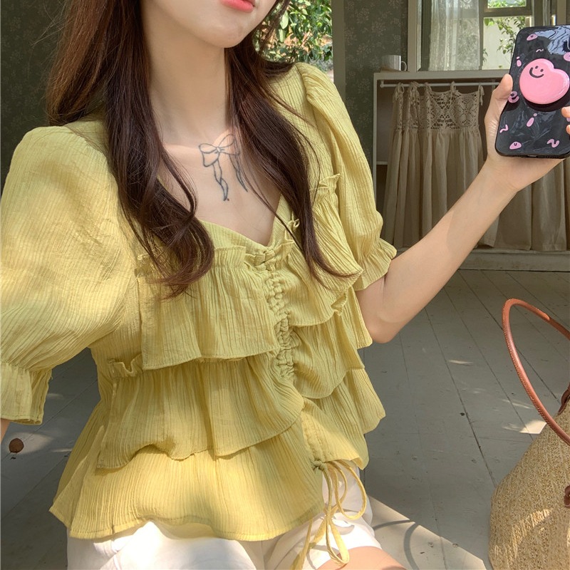 실사 여름 드레스 빅 사이즈 여성 의류 레이스업 인형 셔츠 반팔 셔츠 달콤함 외국 가스 작은 셔츠 프릴 연령 감소 맨위
