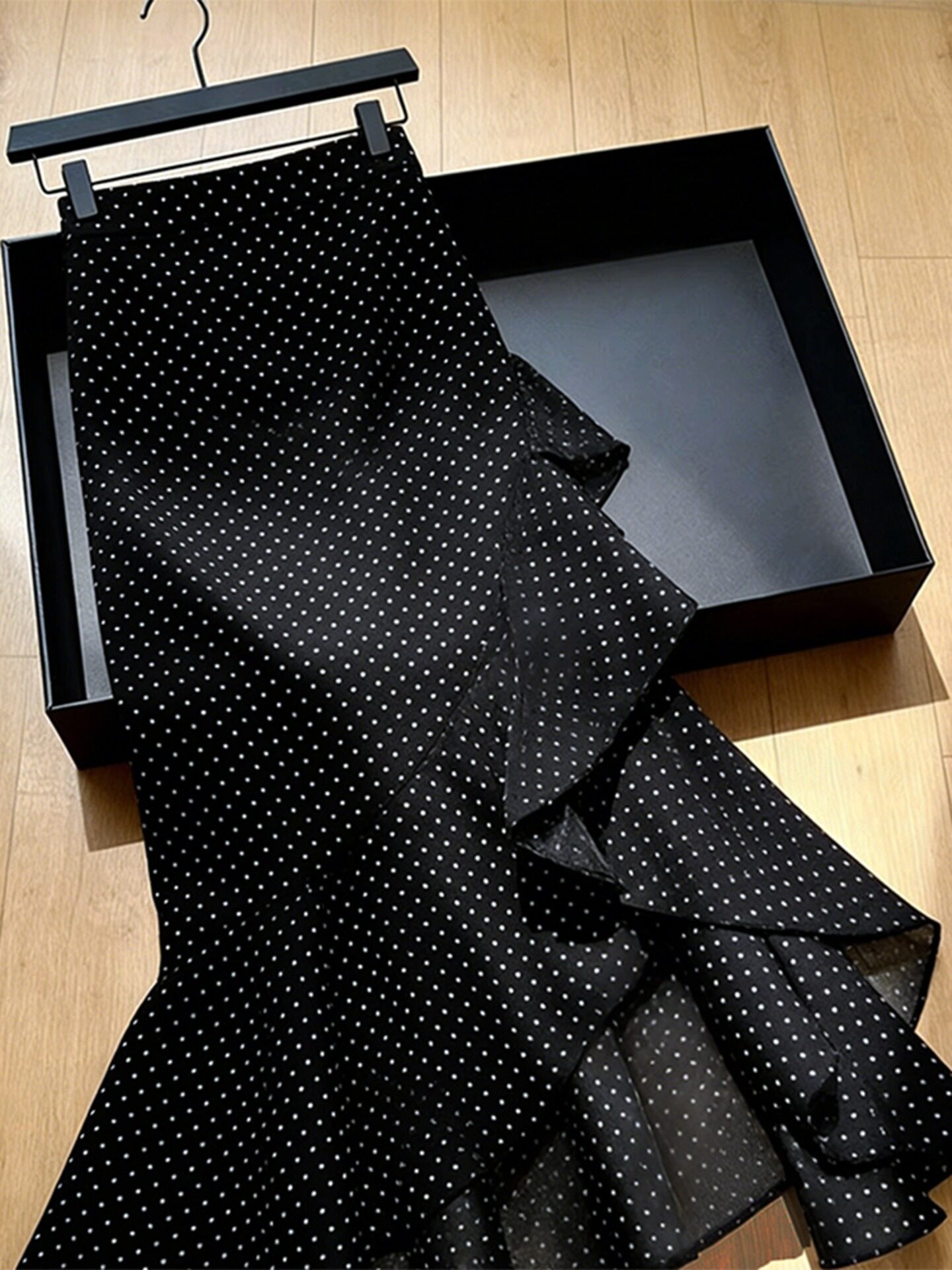 2026 봄 새로운 고급 프랑스식 사소한 고유 한 디자인 센스 프릴 불규칙 검정색 도트 무늬 반신 스커트