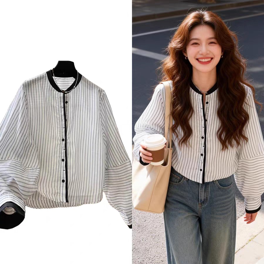 여름 드레스 새로운 고유 한 슈퍼 잘 생긴 맨위 라운드 넥 랜턴 긴팔 스트라이프 셔츠 고급 센스 한 부서 품격 작은 셔츠