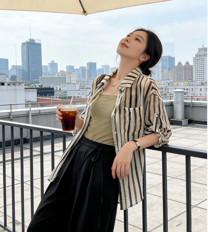 여름 드레스 새로운 빅 사이즈 스트라이프 셔츠 디자인 센스 작은 대중 맨위 남자 친구 바람 루즈핏 긴팔 셔츠 오픈 가디건