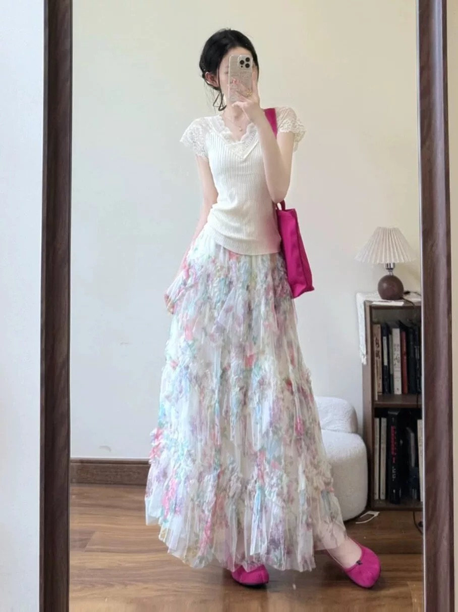 프랑스식 세트 드레스 여성 여름 부드러운 품격 V넥 레이스 조각 반팔 티셔츠 꽃무늬 반신 치마 투피스 세트