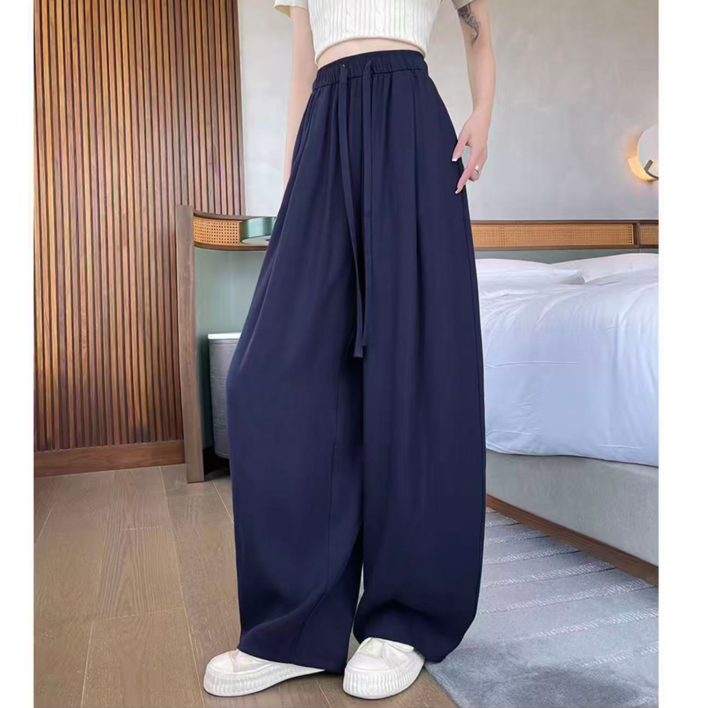 해군 주간 실크 아마 바지 여성 여름 얇은 스타일 빅 사이즈 루즈핏 도루 센스 작은 키 면 린넨 와이드 레그 팬츠 어린이