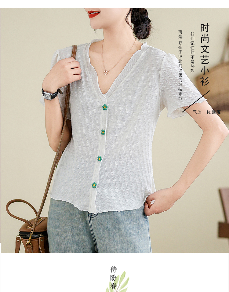 여름 드레스 새로운 디자인 섹션 V넥 플리츠 작은 날다 소매 맨위 여성 고급 센스 어깨 민소매 셔츠