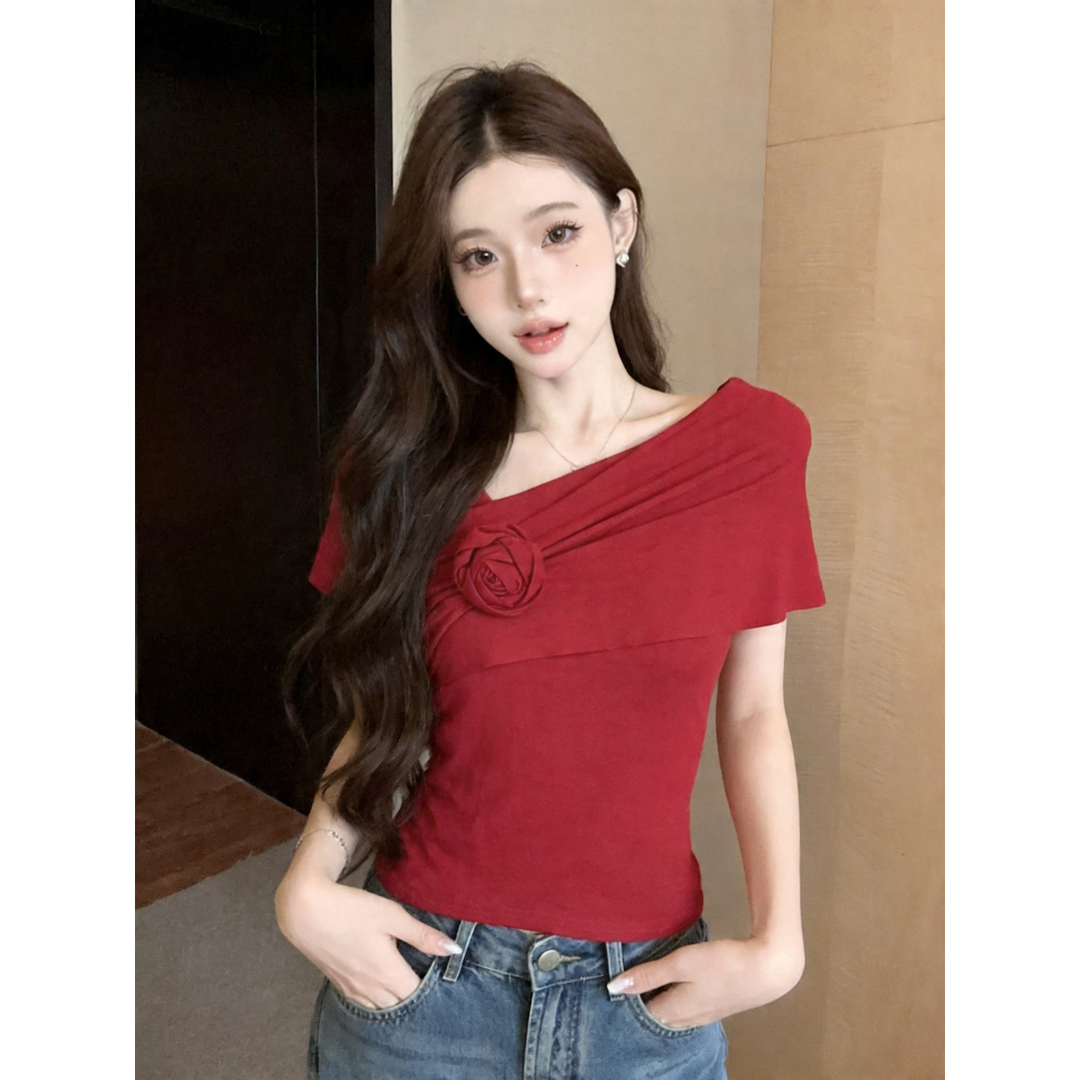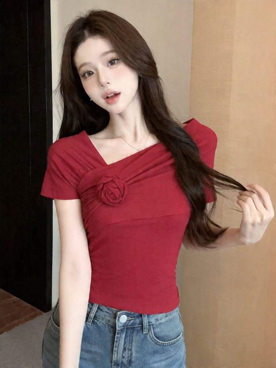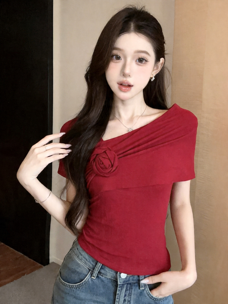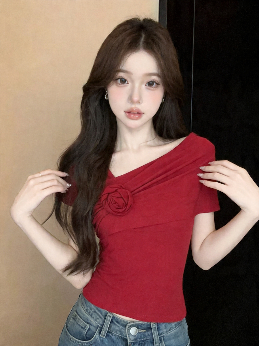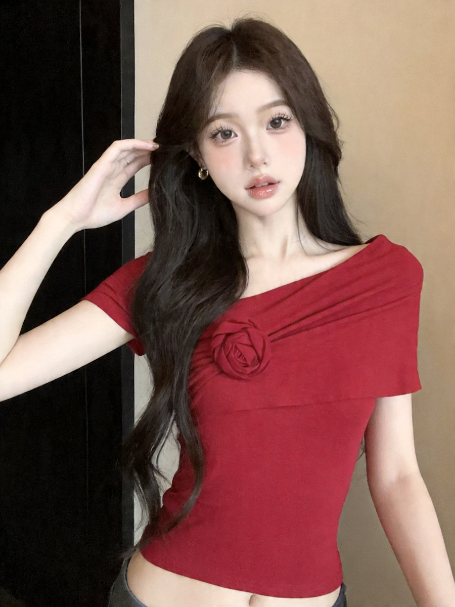 실사 오프숄더 꽃 디자인 센스 작은 대중 오프숄더 티셔츠 여성 여름 섹시함 몸매 가꾸기 순수한 욕망 쇼트 스타일 맨위