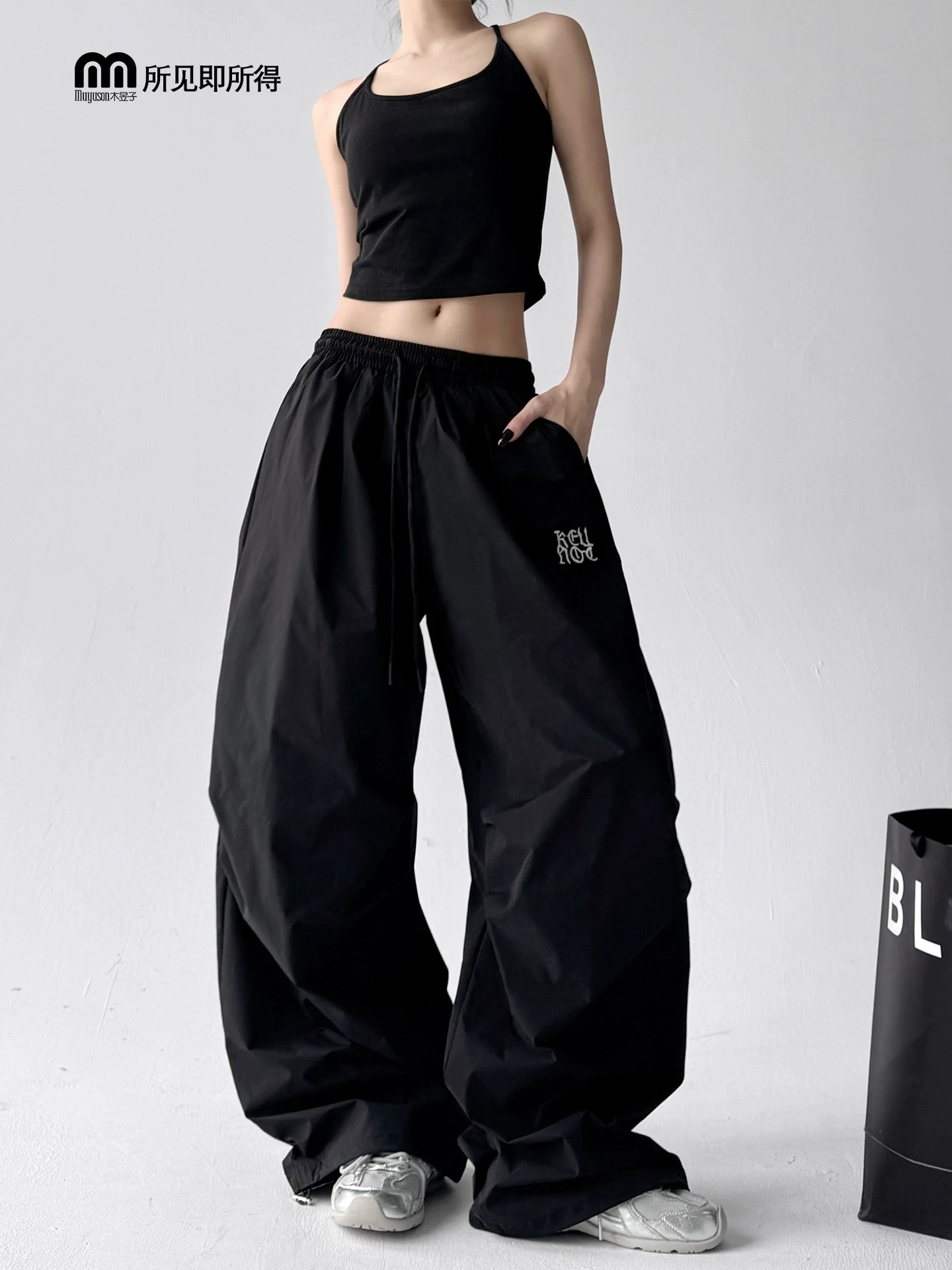 좋은 품질 원본 올린 사람 : 에디션 재미있는 자수 모통이 칼 워크웨어 팬츠 여성 여름 주름 와이드 레그 팬츠 재즈 춤추기 긴 바지