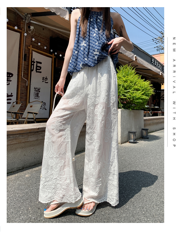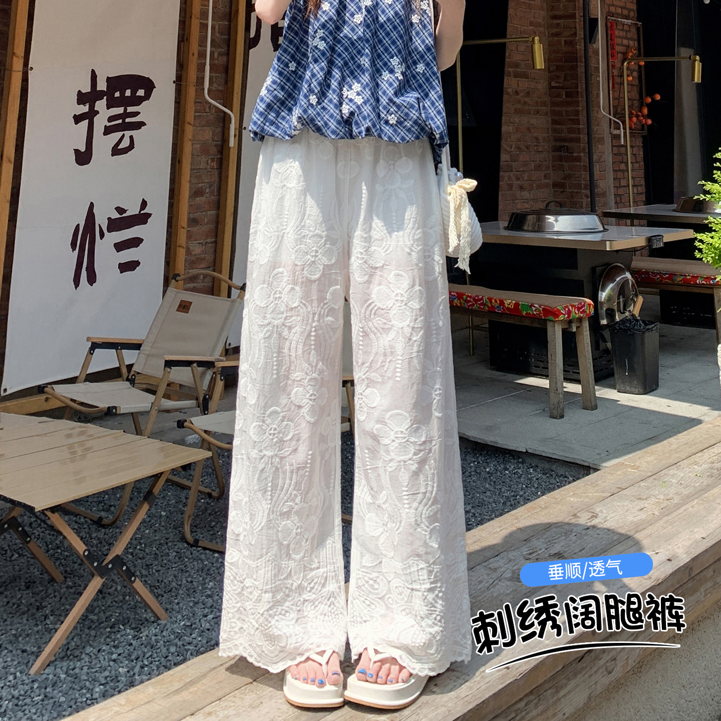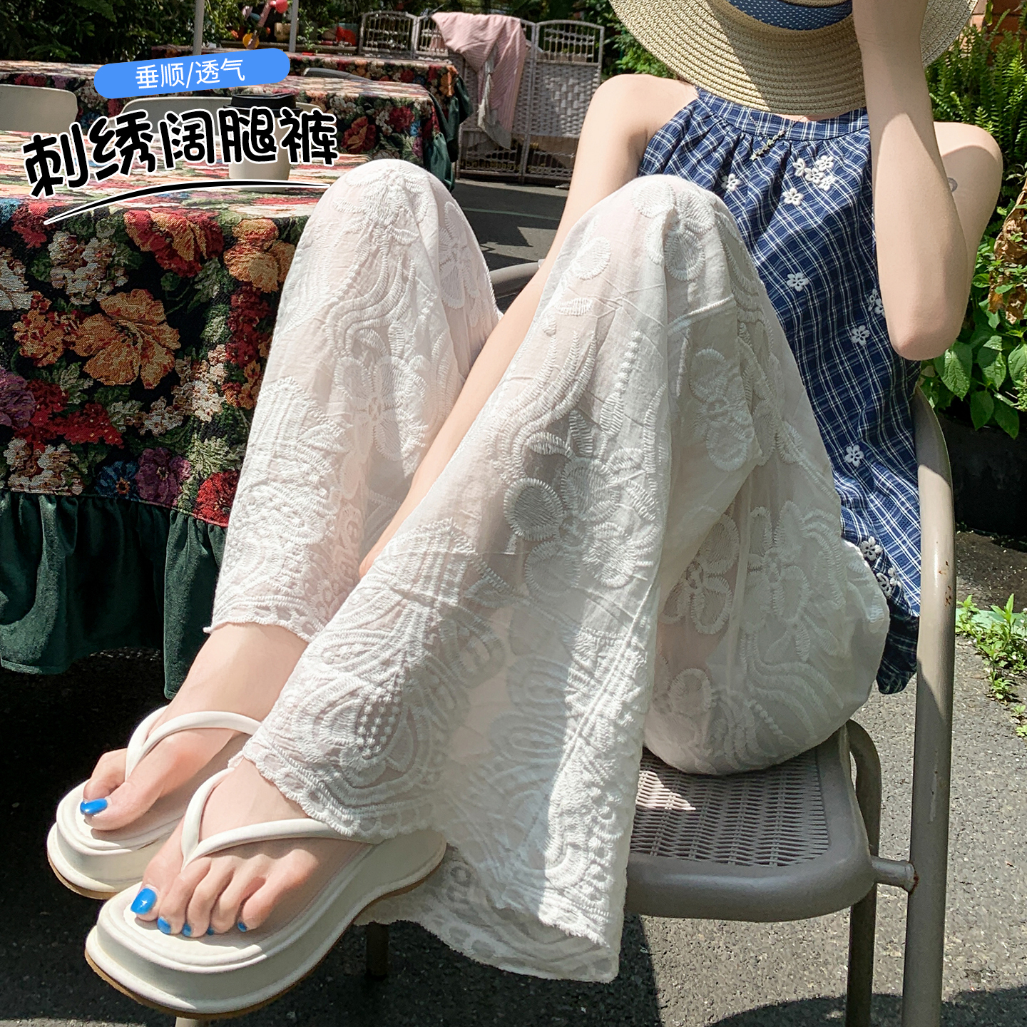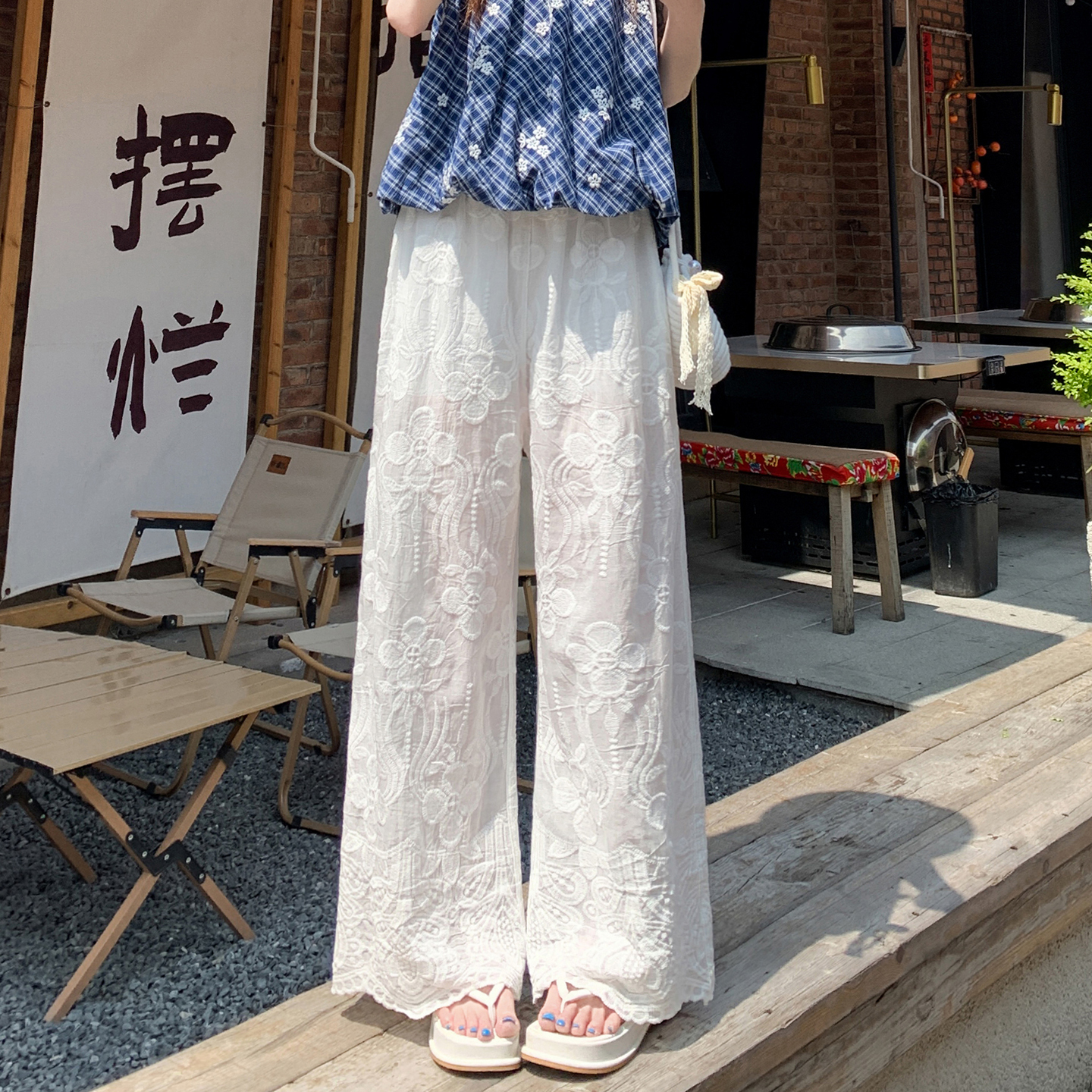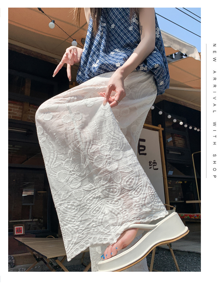 실사 화이트 홀로우 아웃 레이스 자카드 와이드 레깅스 바지 여름 하이웨이스트 슬림해 보이는 디자인 센스 자수 자수 와이드 레그 팬츠