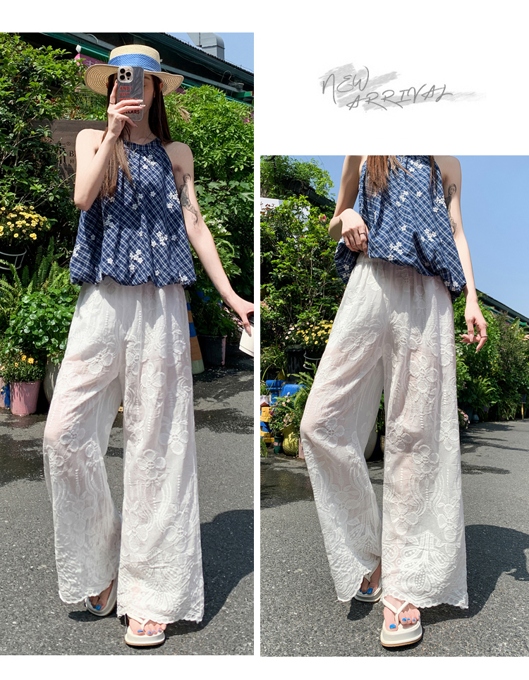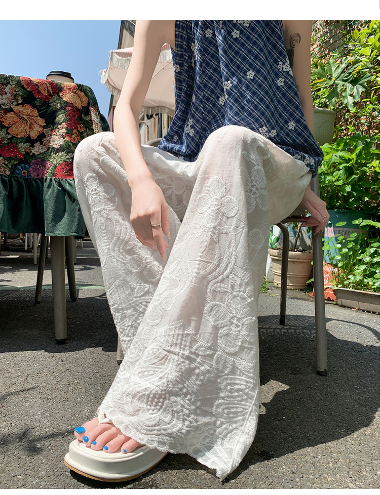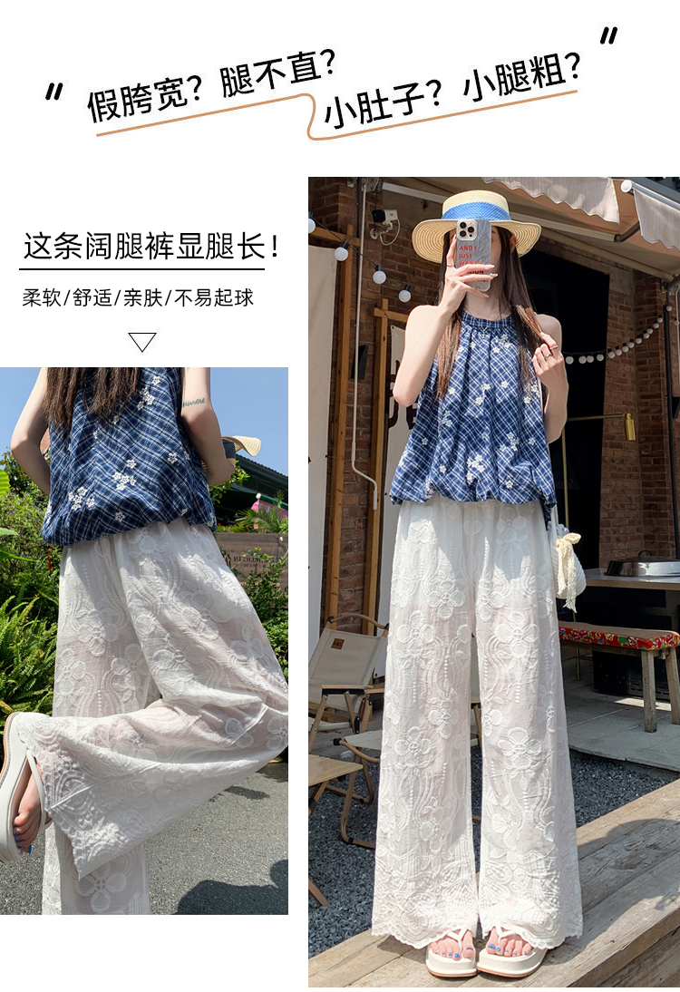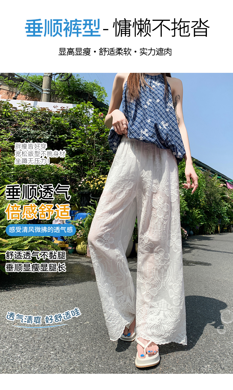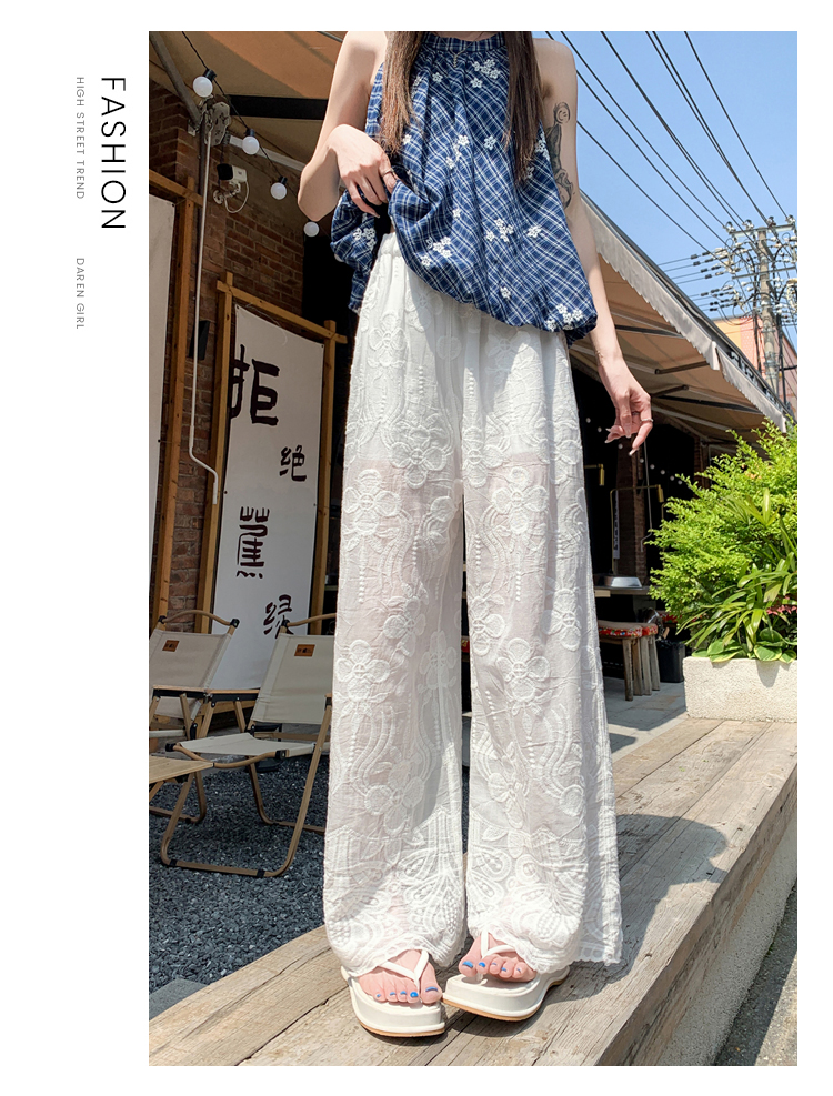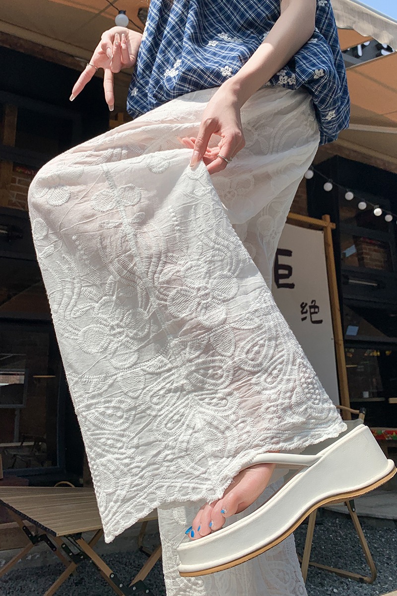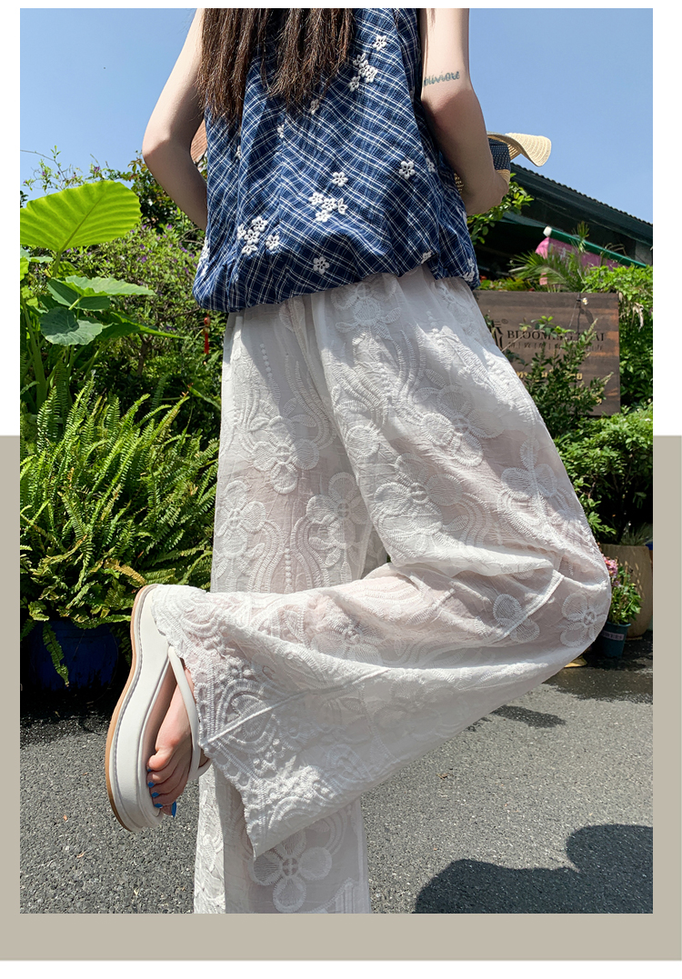 실사 화이트 홀로우 아웃 레이스 자카드 와이드 레깅스 바지 여름 하이웨이스트 슬림해 보이는 디자인 센스 자수 자수 와이드 레그 팬츠