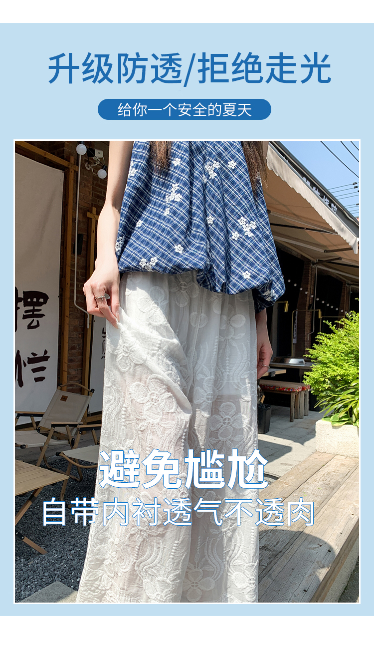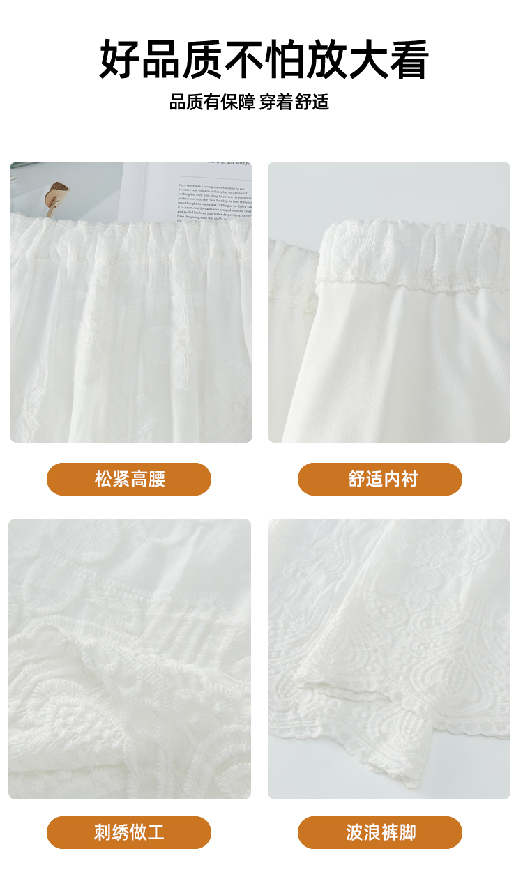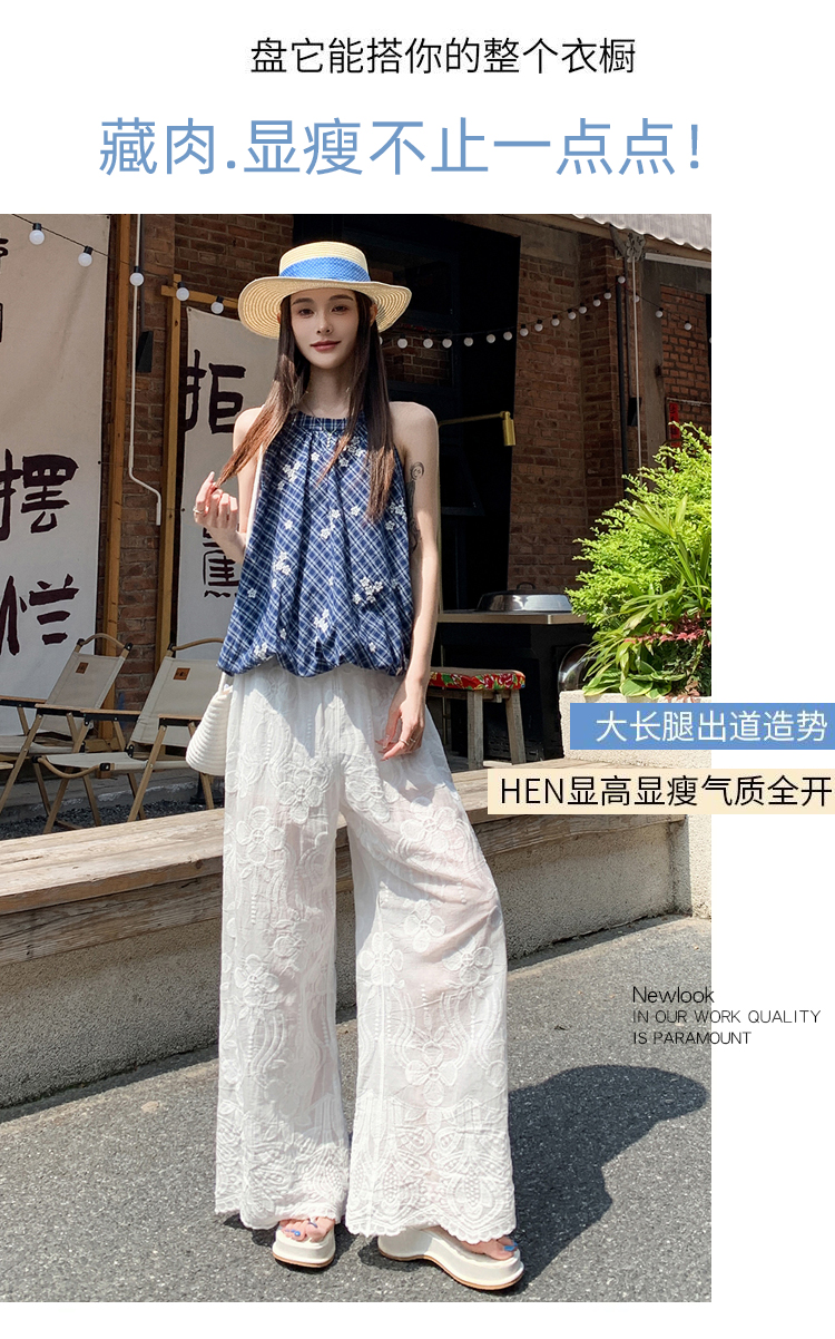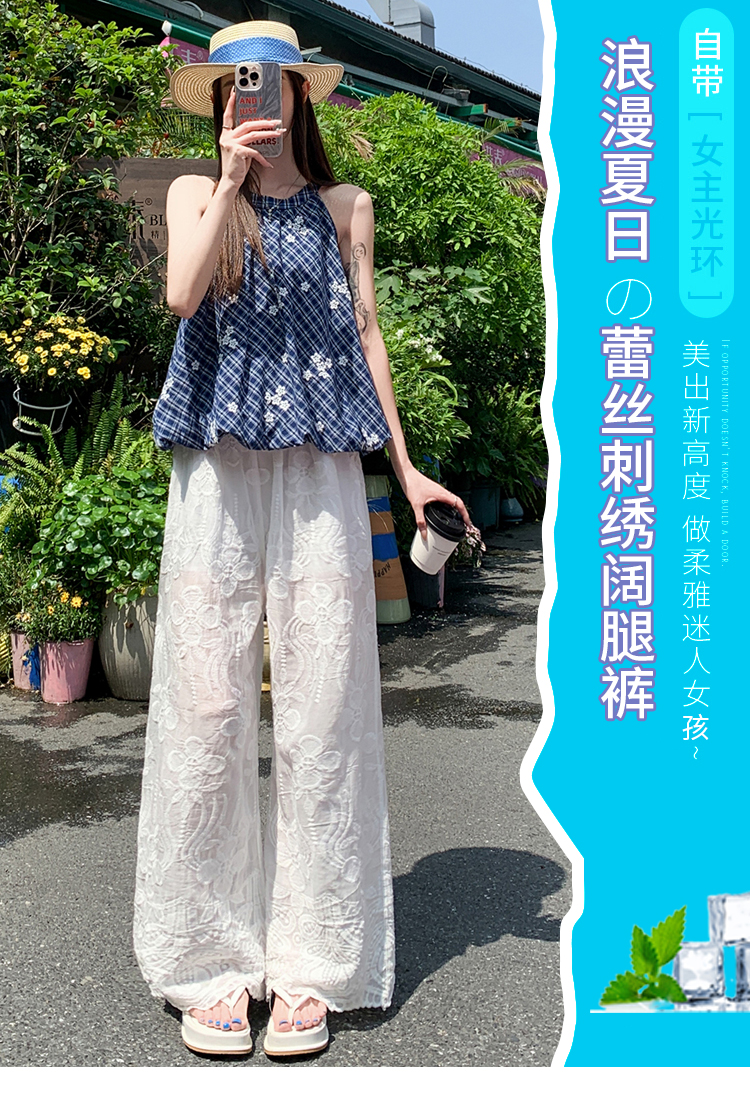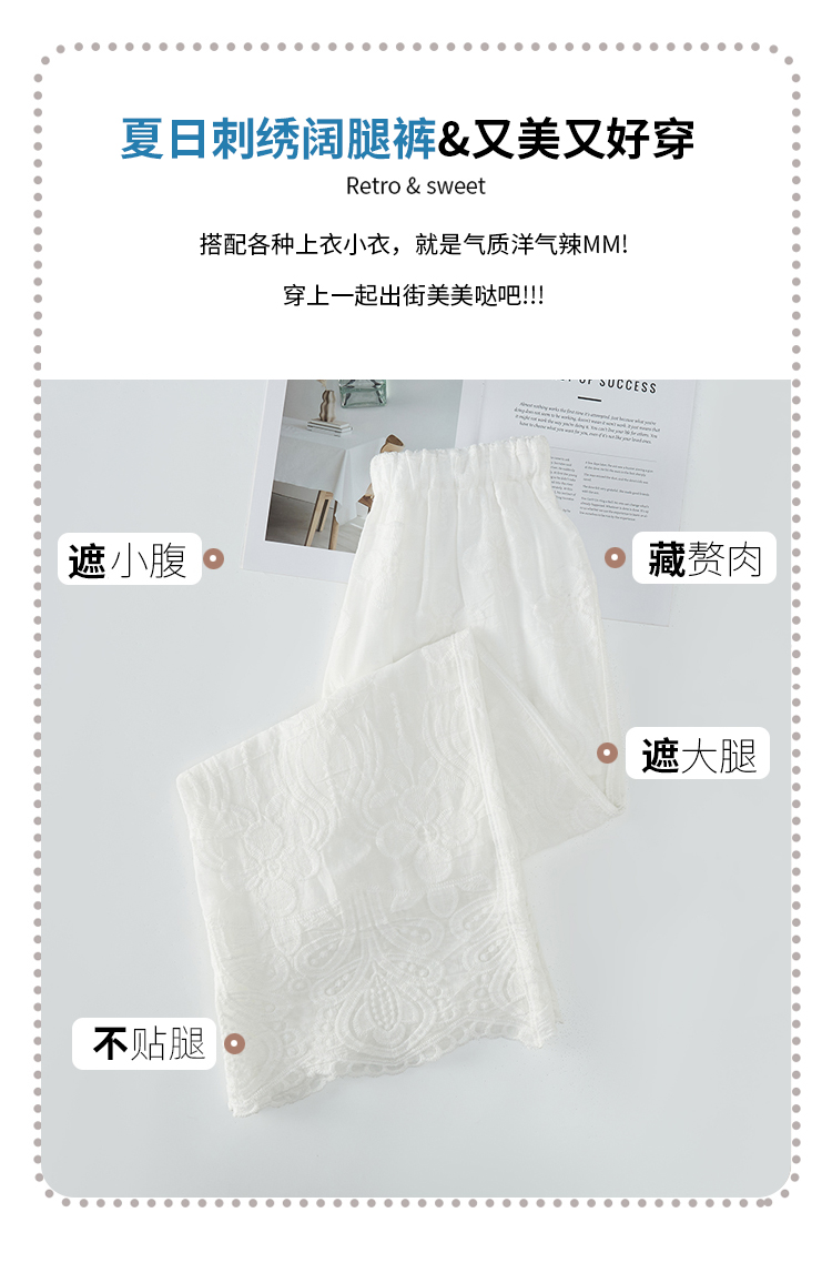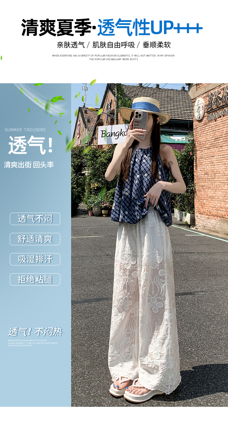 실사 화이트 홀로우 아웃 레이스 자카드 와이드 레깅스 바지 여름 하이웨이스트 슬림해 보이는 디자인 센스 자수 자수 와이드 레그 팬츠