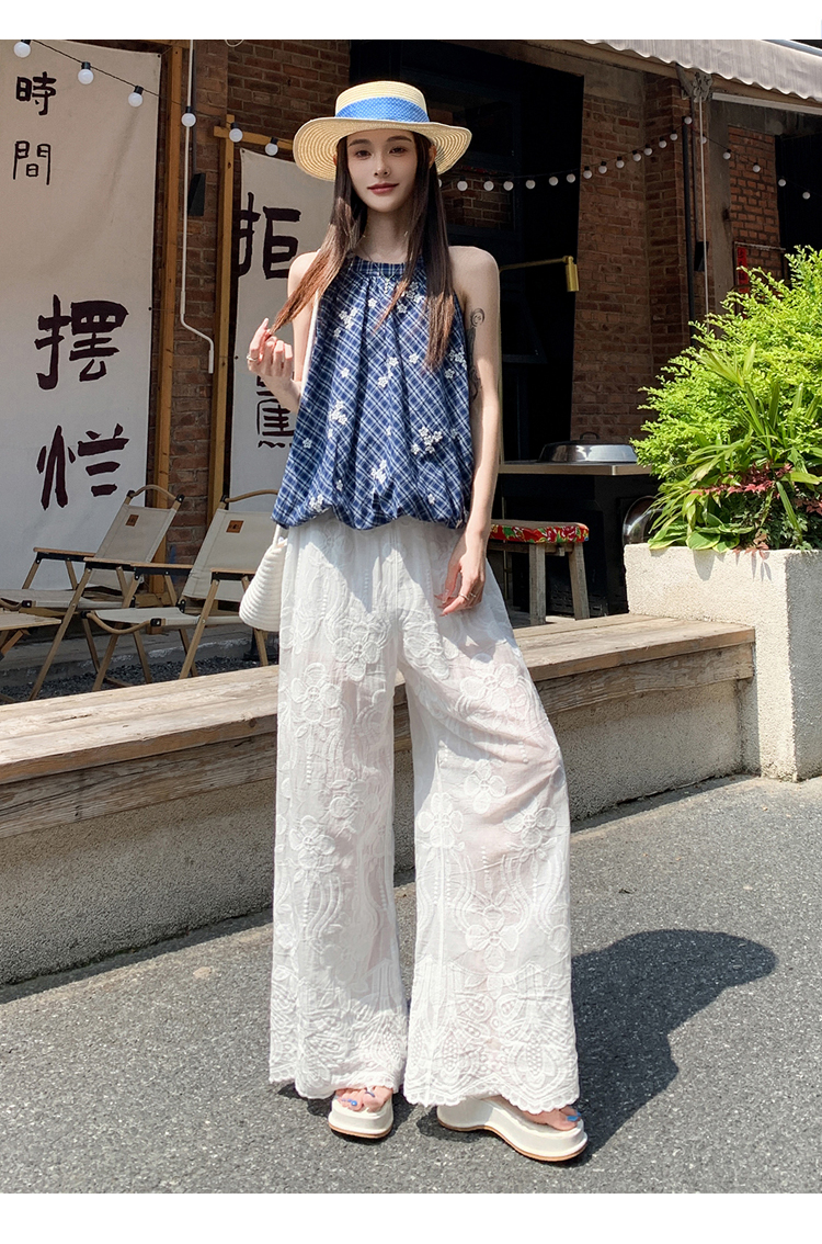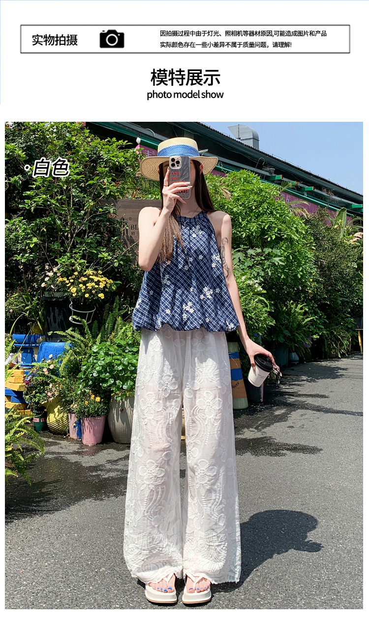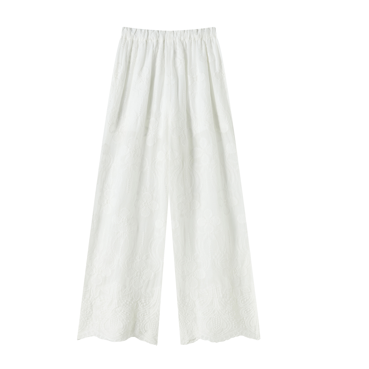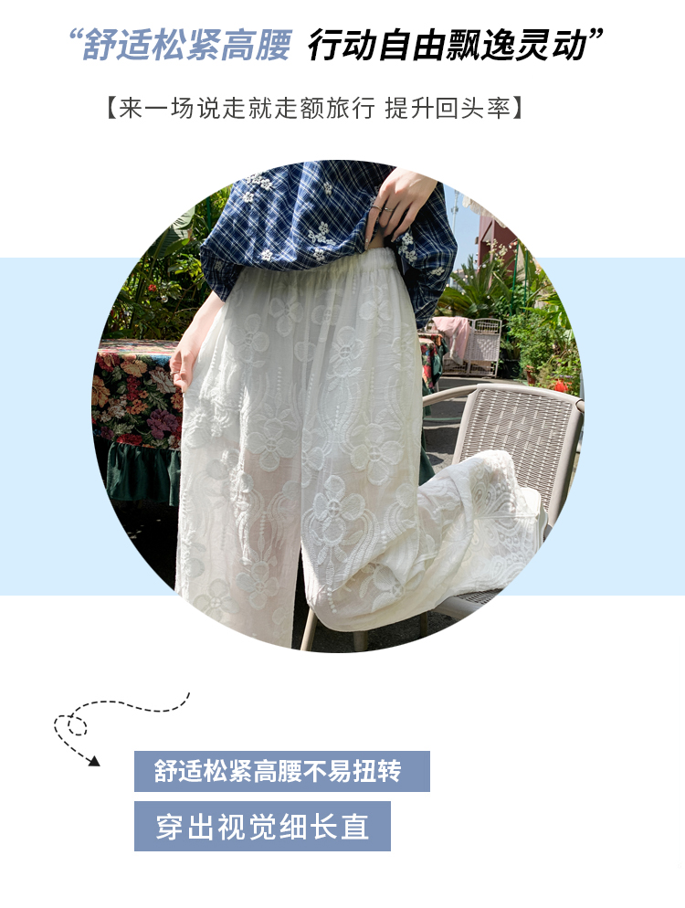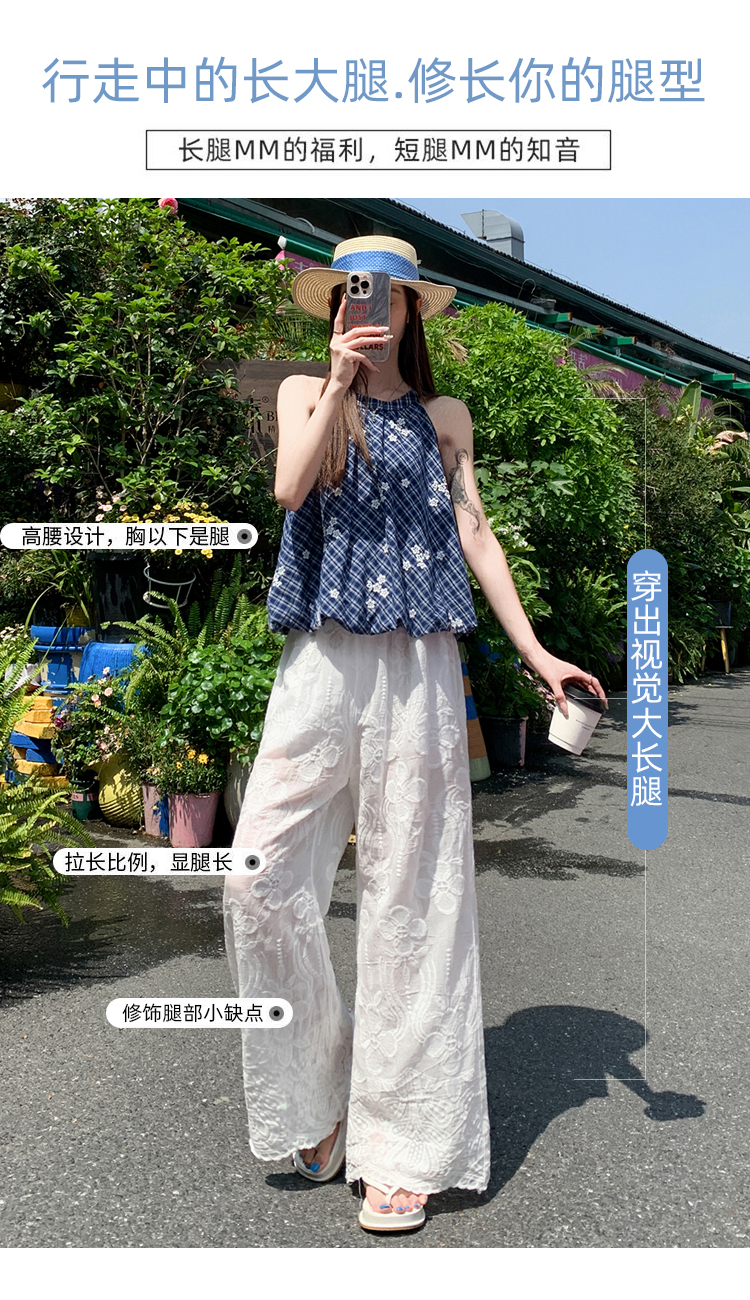 실사 화이트 홀로우 아웃 레이스 자카드 와이드 레깅스 바지 여름 하이웨이스트 슬림해 보이는 디자인 센스 자수 자수 와이드 레그 팬츠
