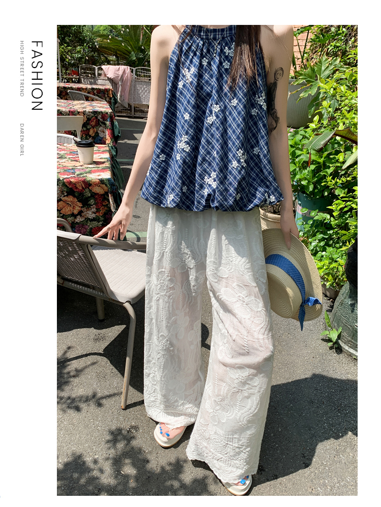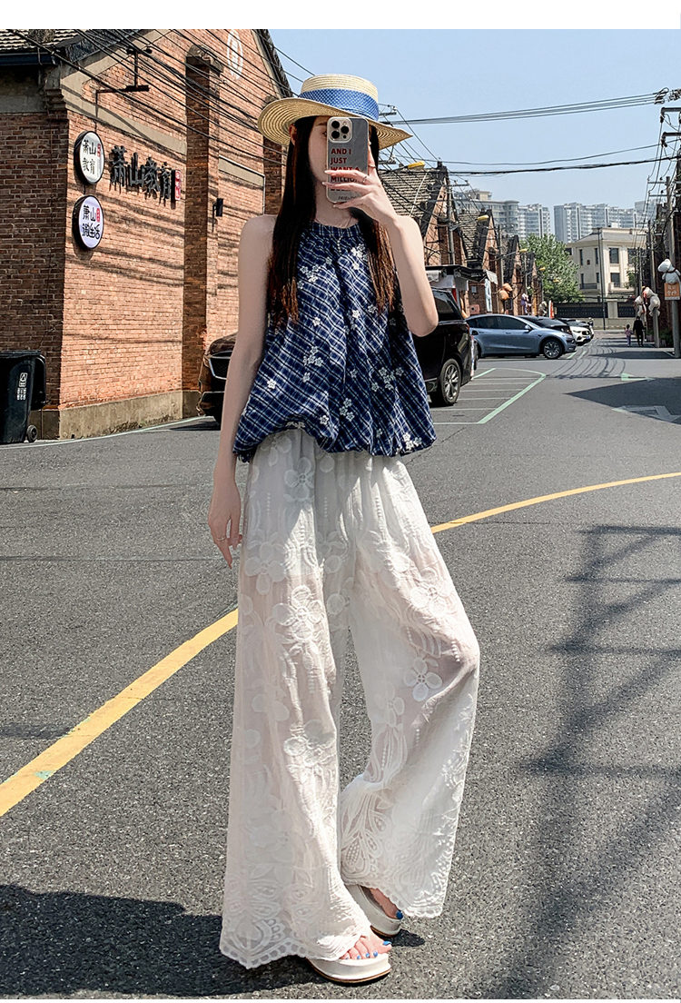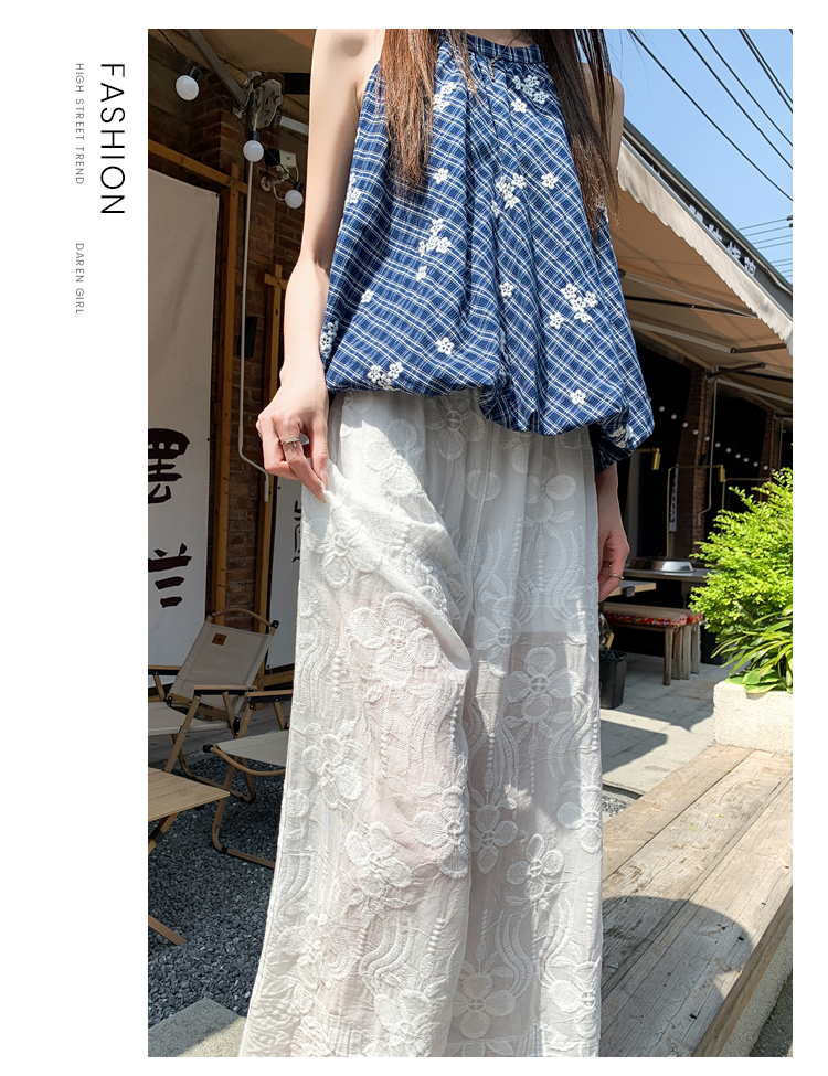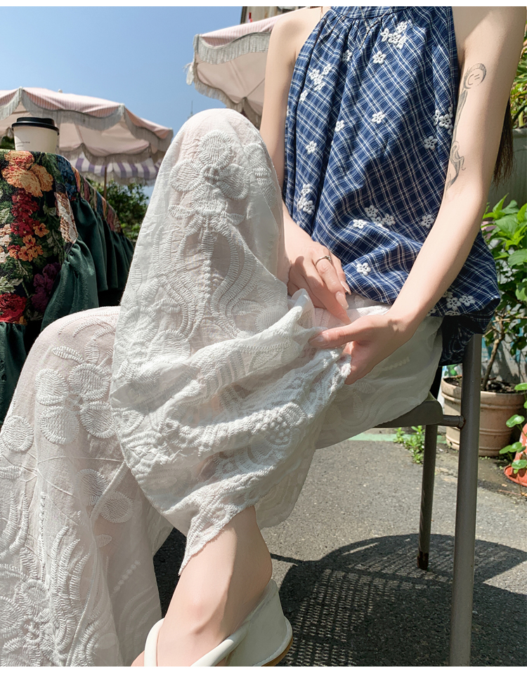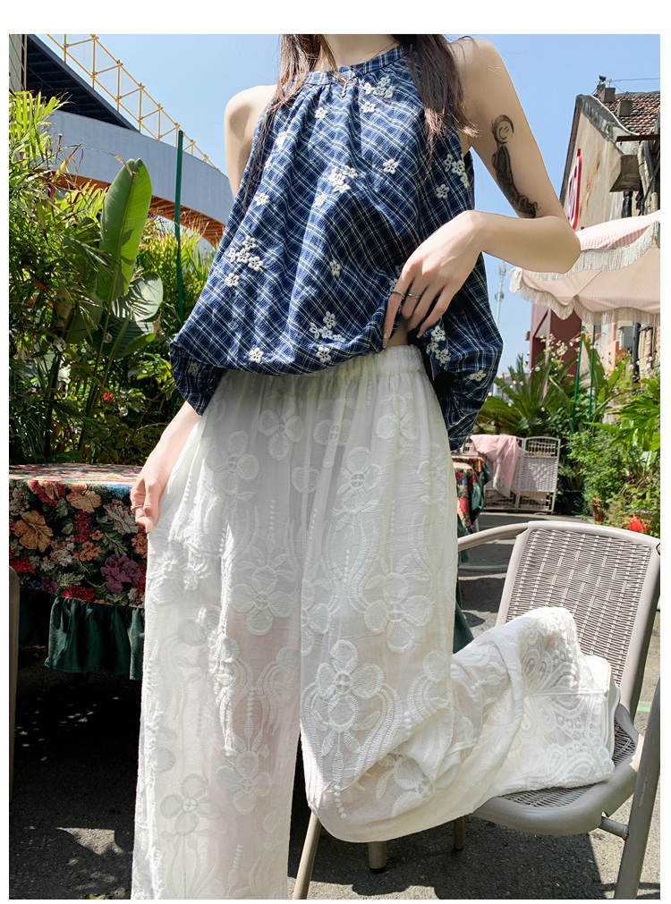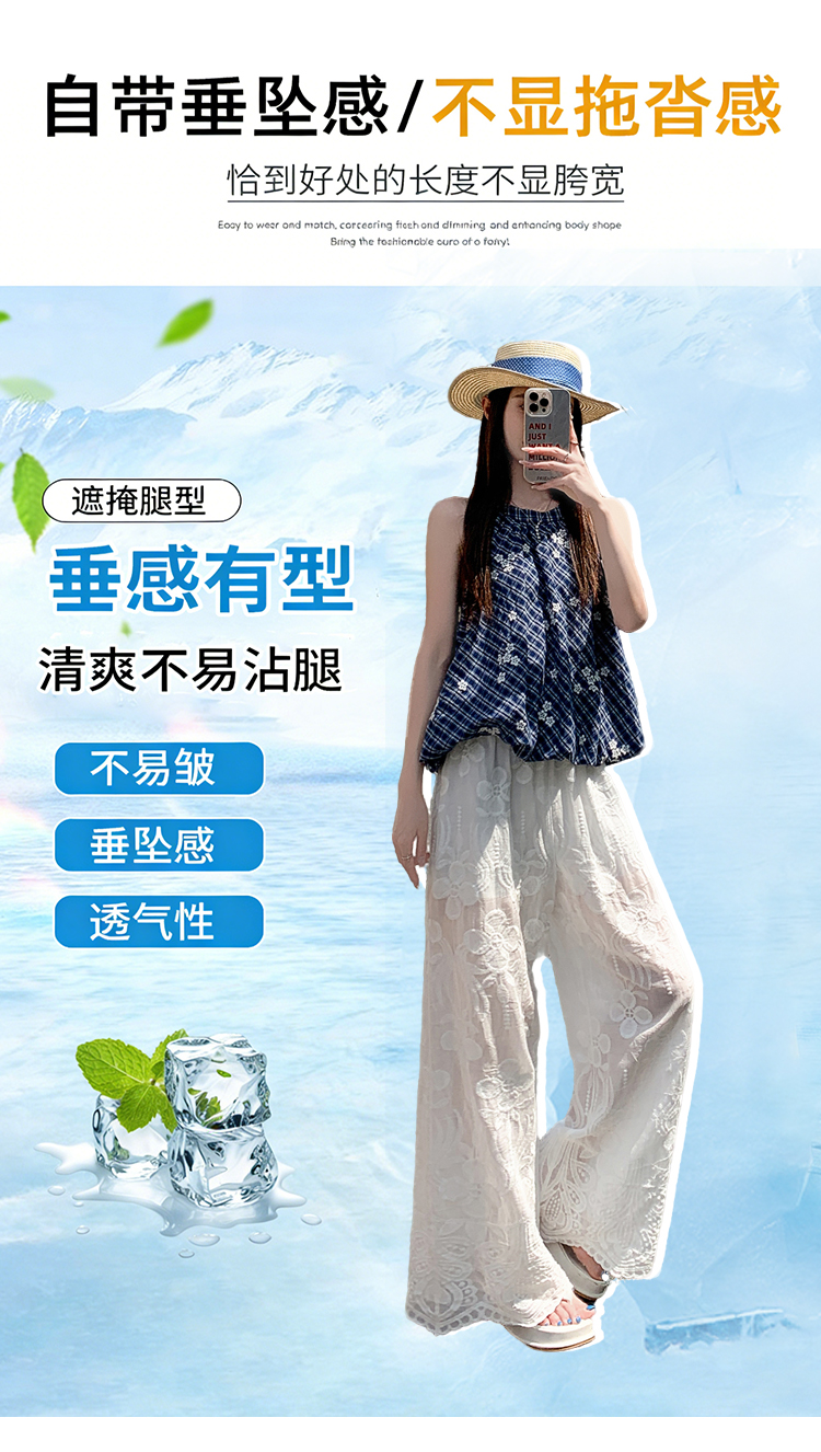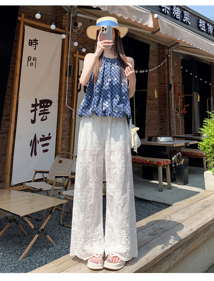 실사 화이트 홀로우 아웃 레이스 자카드 와이드 레깅스 바지 여름 하이웨이스트 슬림해 보이는 디자인 센스 자수 자수 와이드 레그 팬츠