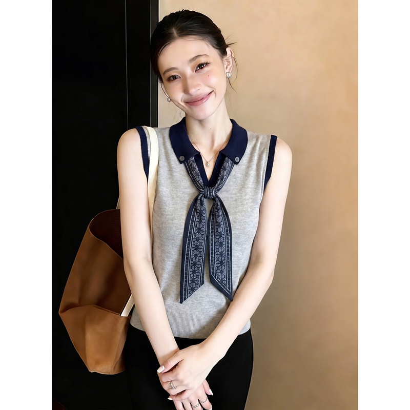 자이언트 잘 생긴 배색 스카프 POLO 칼라 니트 조끼 여성 여름 외출용 2026 새로운 슬림해 보이는 품격 민소매 맨위
