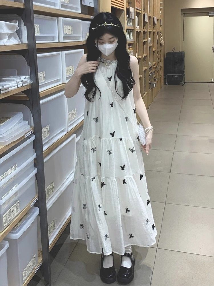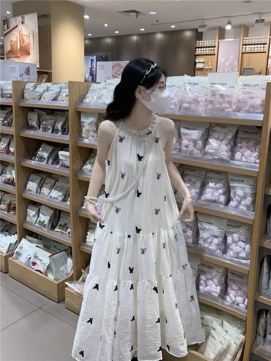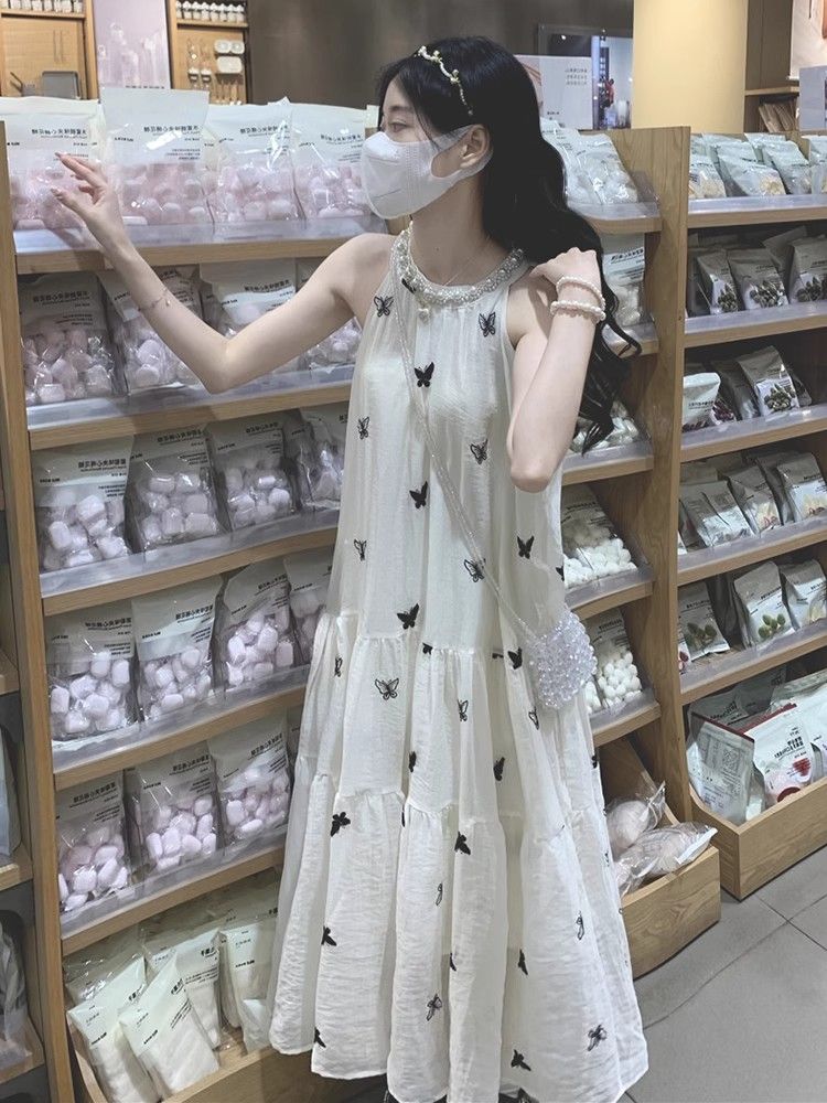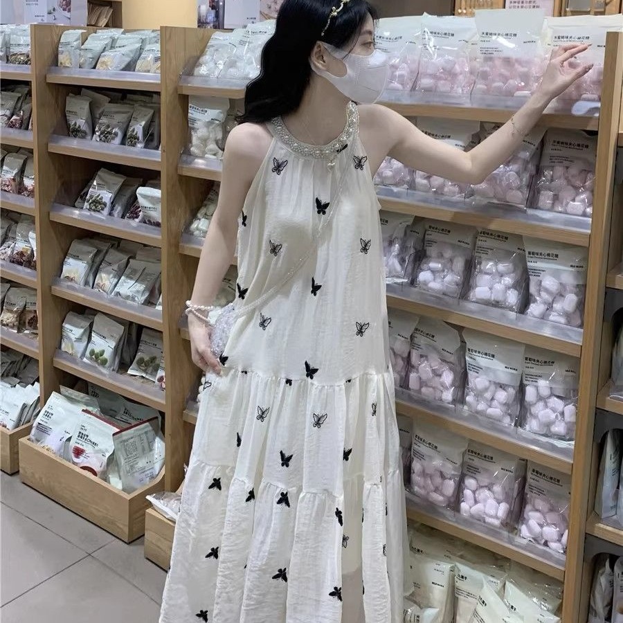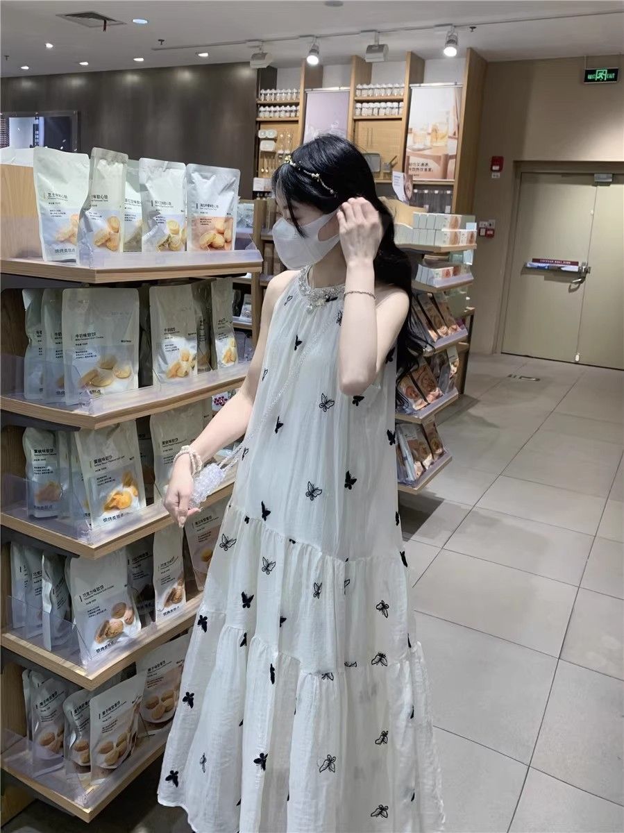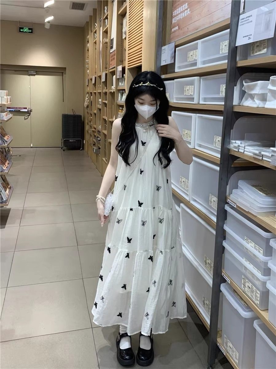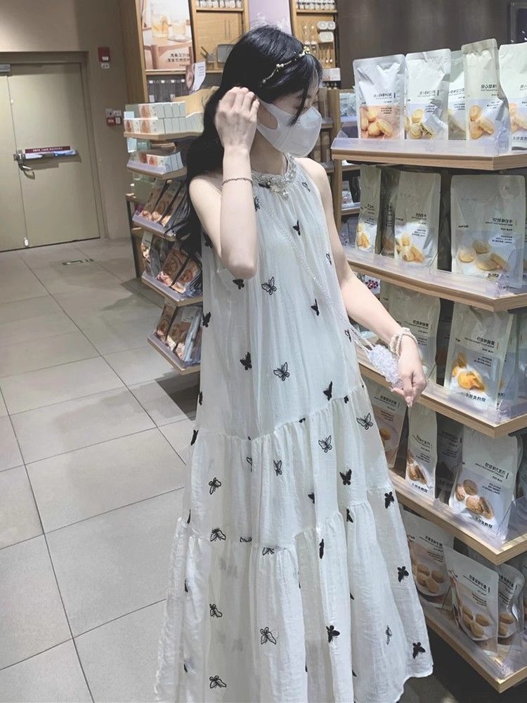수건 자수 스타일 첫사랑 민소매 행침 목 자수 여성 드레스 여름 부드러운 바람 품격 요정 아름다운 롱 스커트