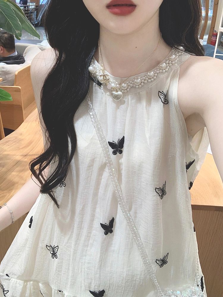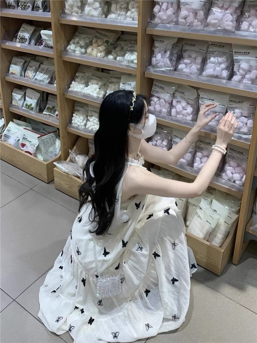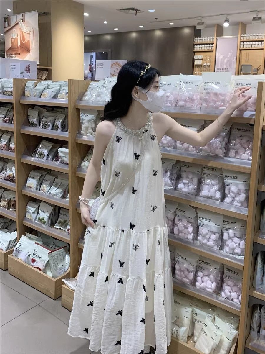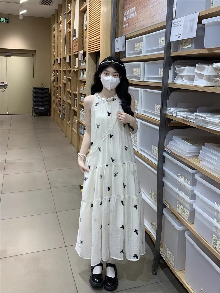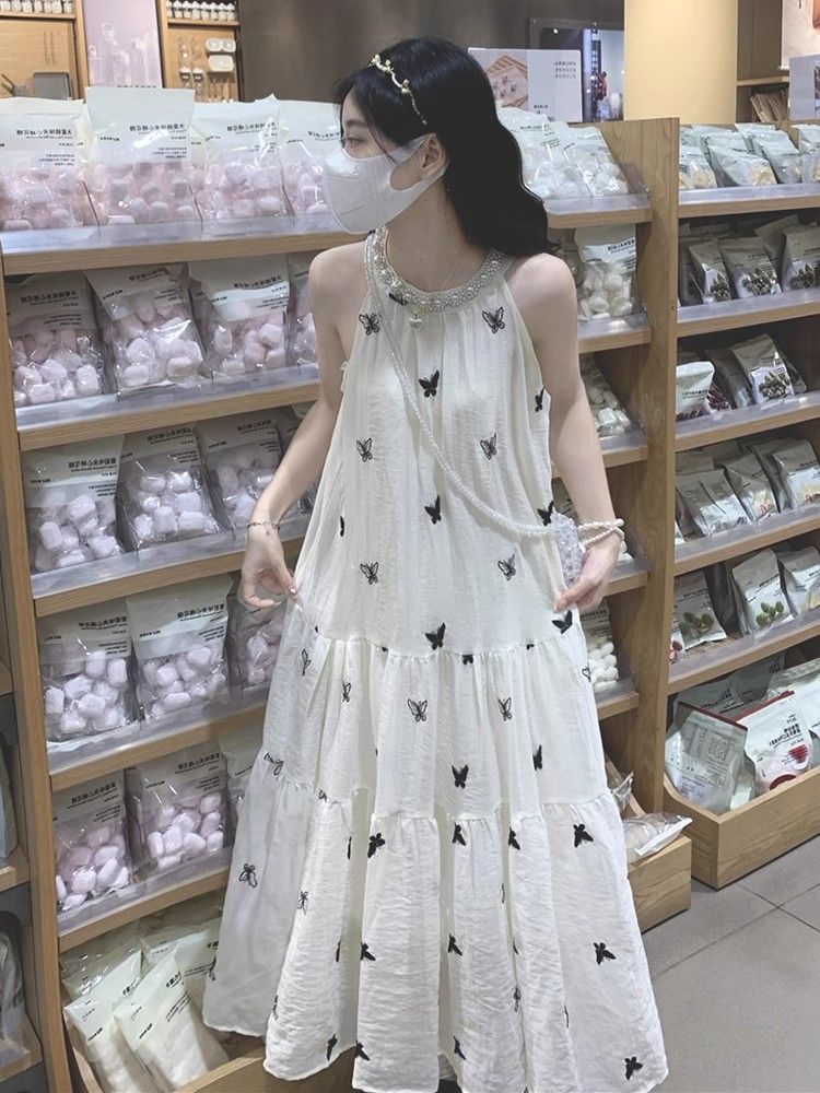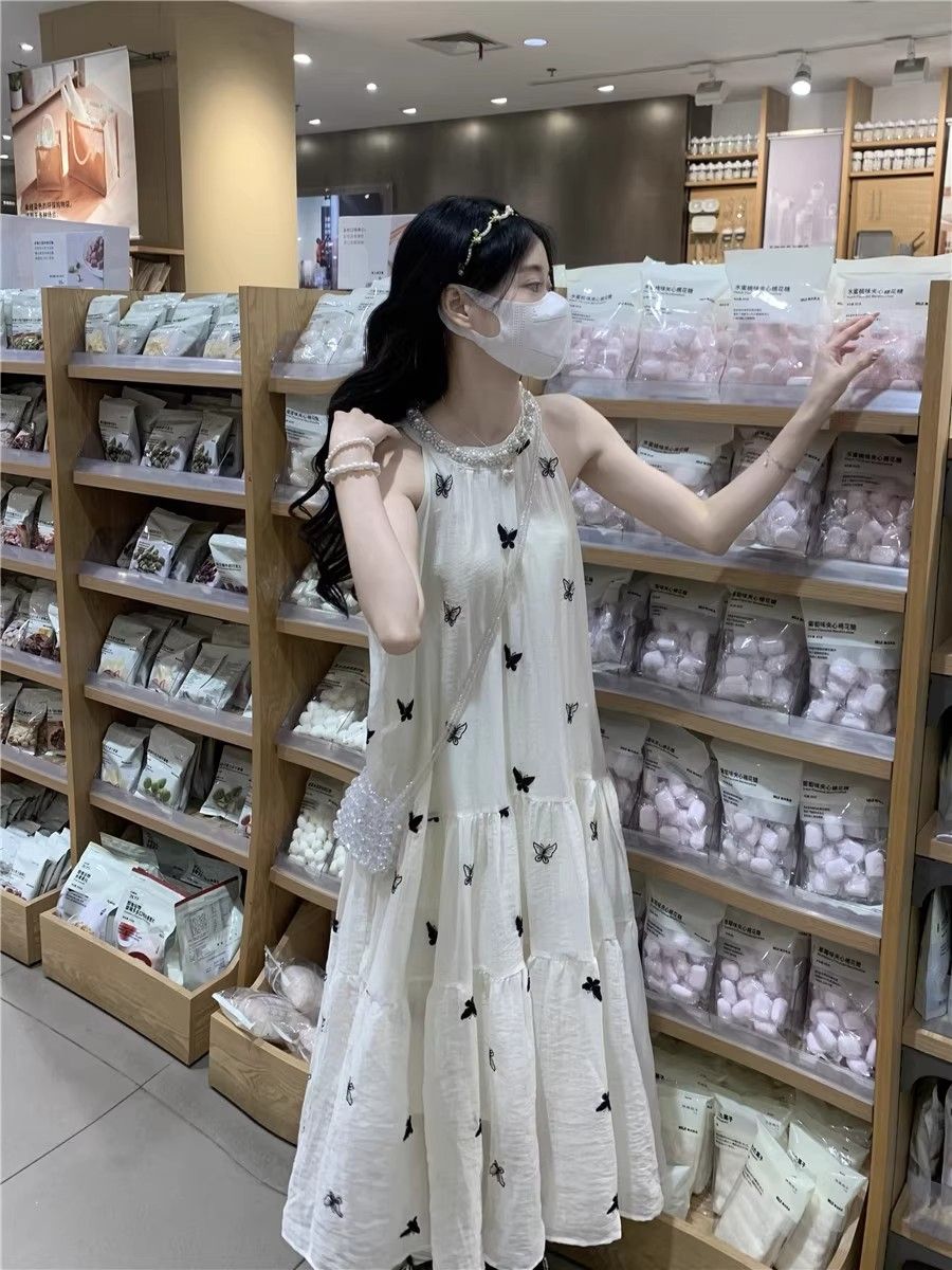 수건 자수 스타일 첫사랑 민소매 행침 목 자수 여성 드레스 여름 부드러운 바람 품격 요정 아름다운 롱 스커트