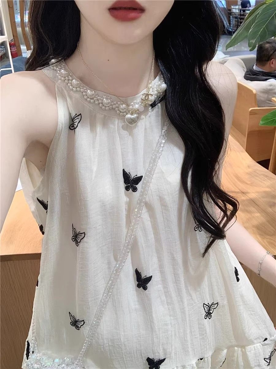 핫걸 V넥 행침 목 비즈 박기 조끼 여성 한 부서 작은 대중 고급 센스 품격 슬림해 보이는 다용도 비틀림 술 맨위