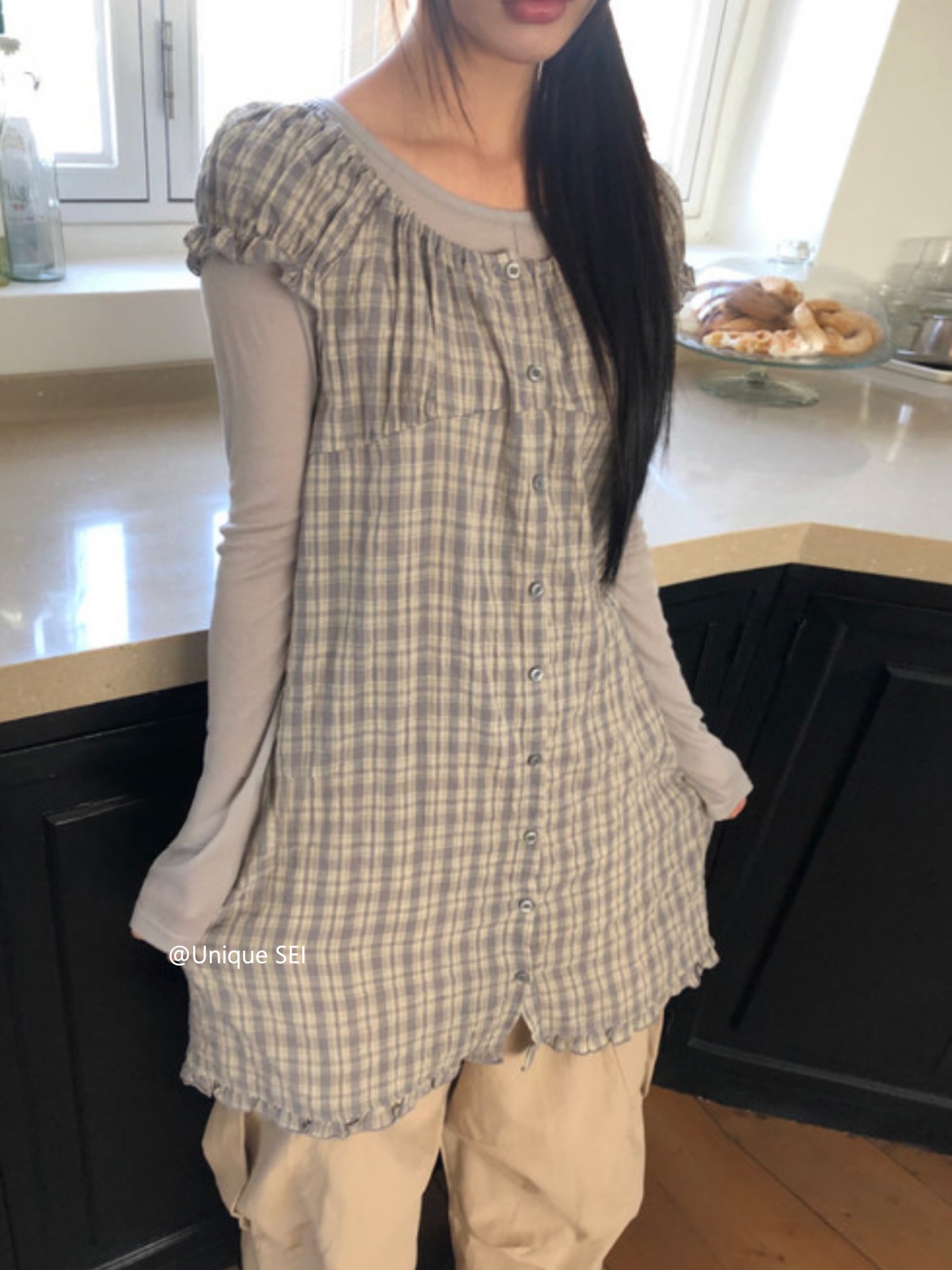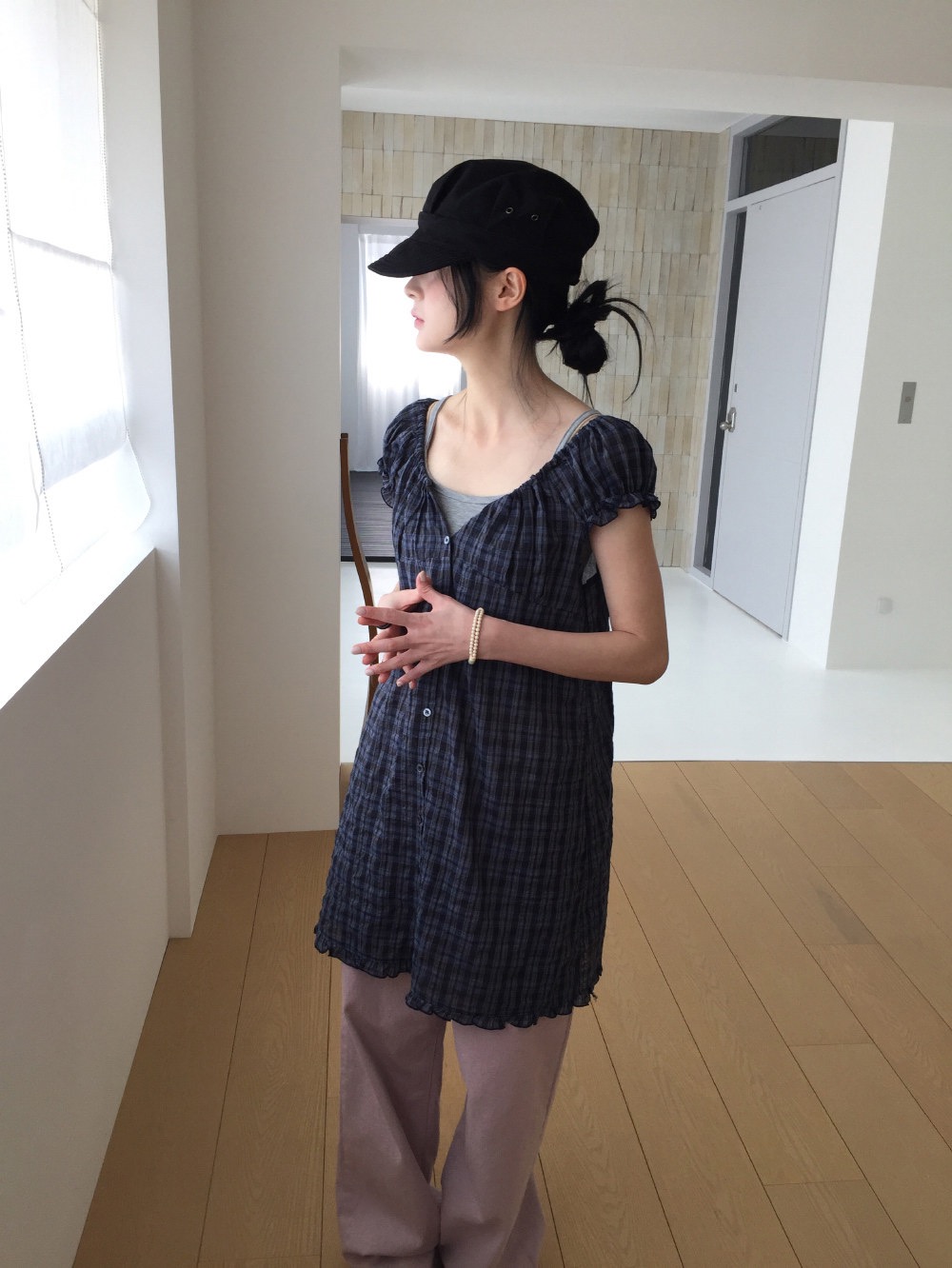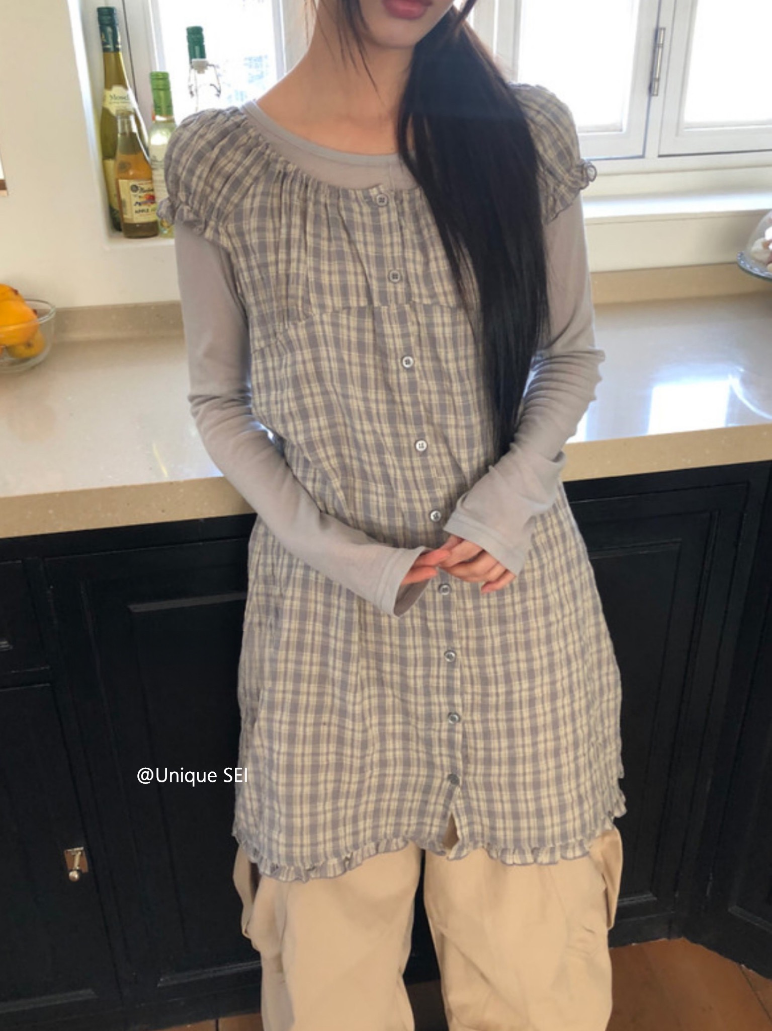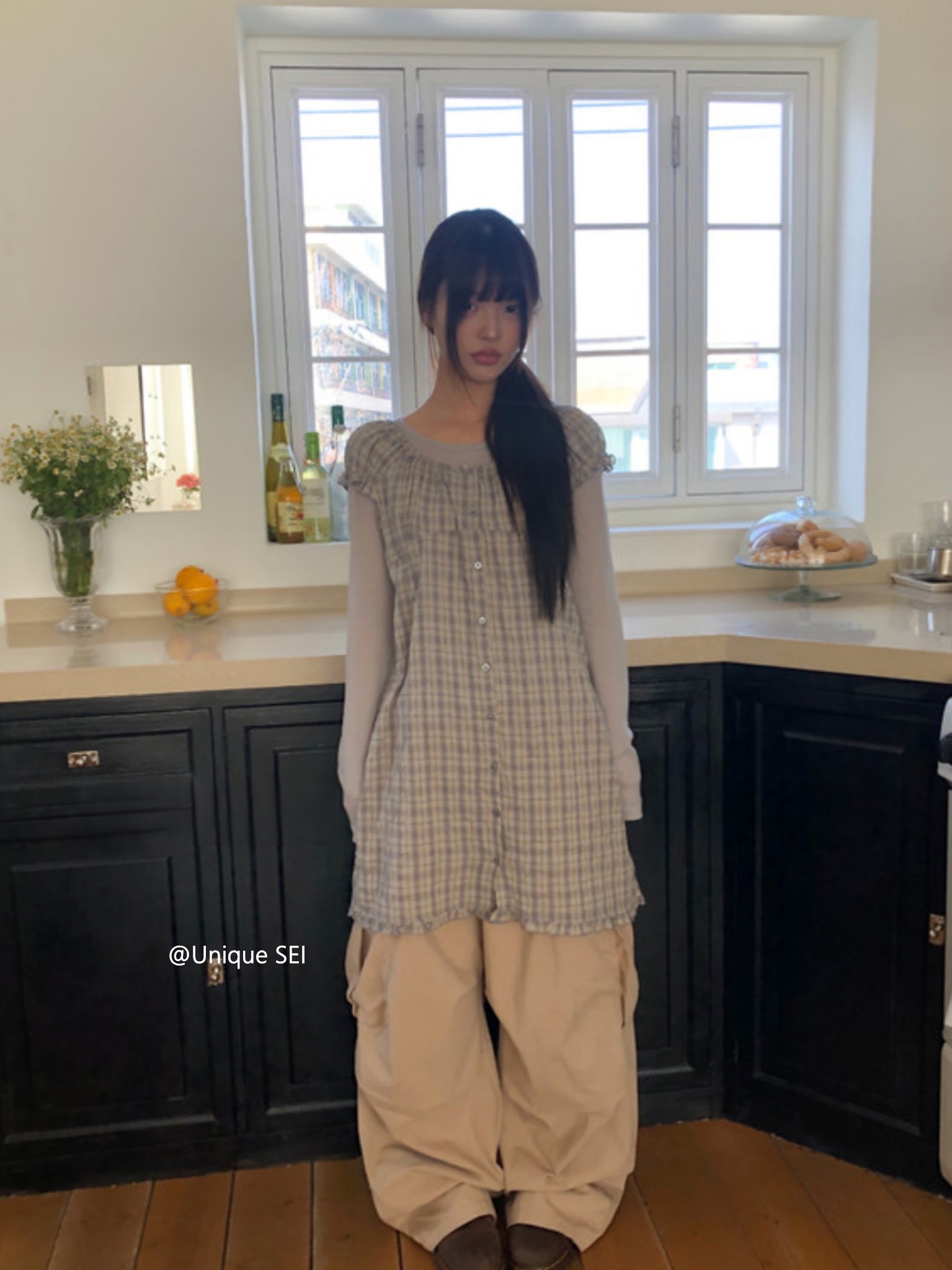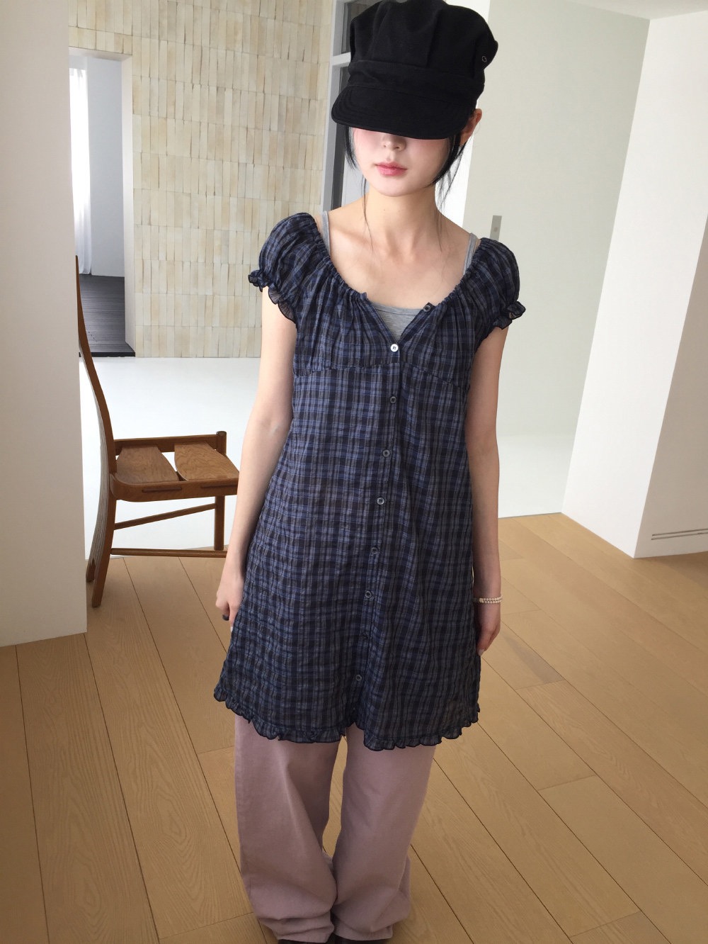 찹쌀 센스 soft 익스트림 제인 바람 주간 실크 아마 얇은 긴팔 맨위 miu 부서 체크무늬 한 마디 허리밴드 치마바지 여성