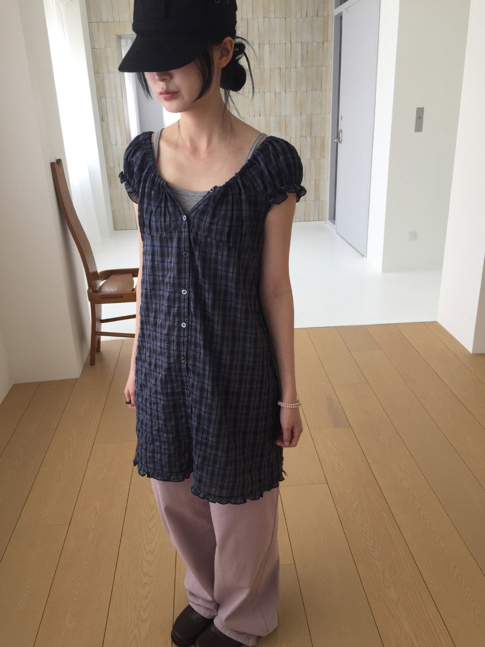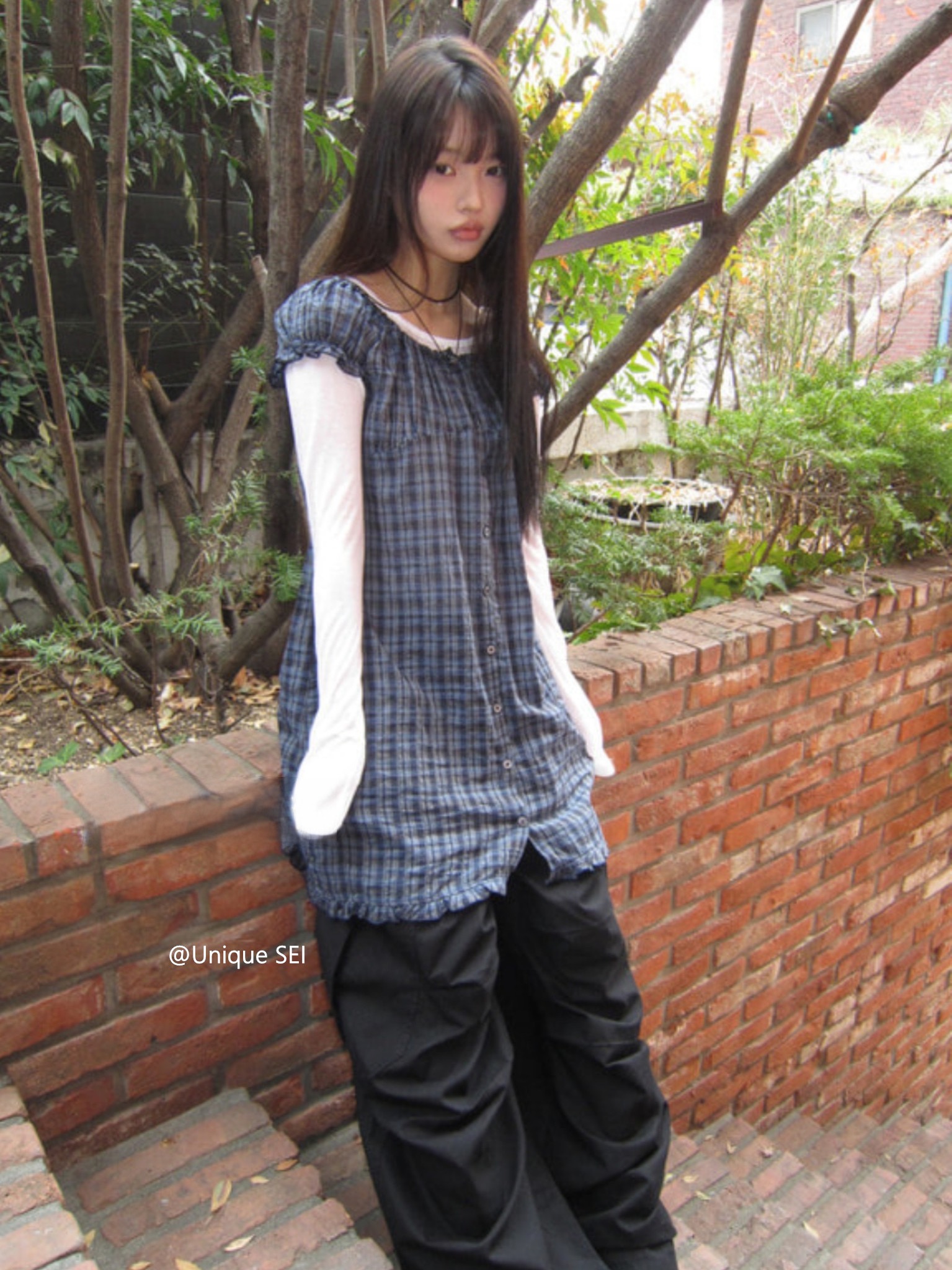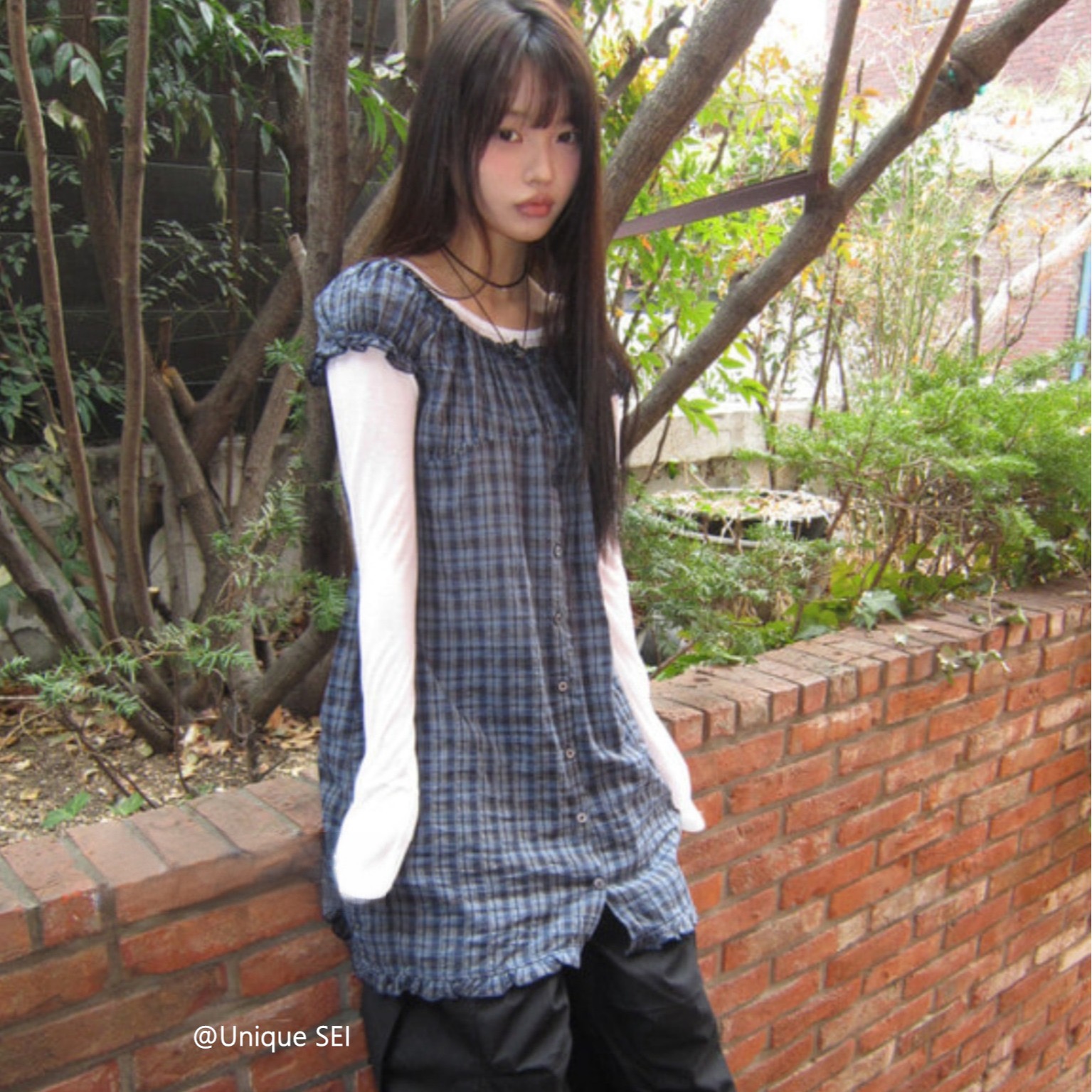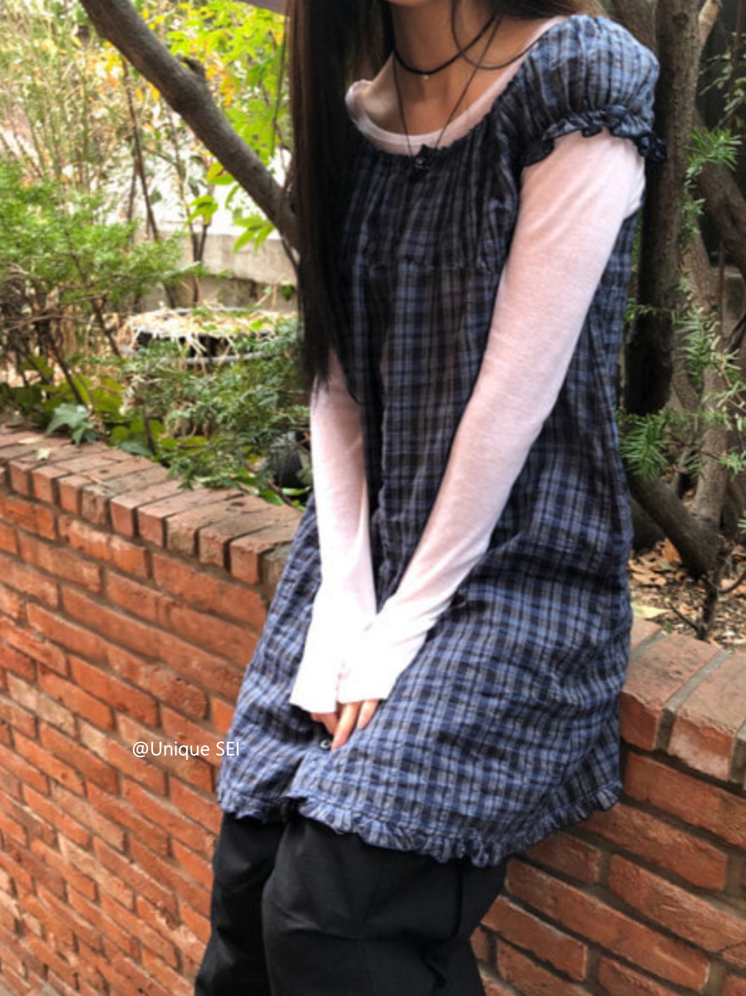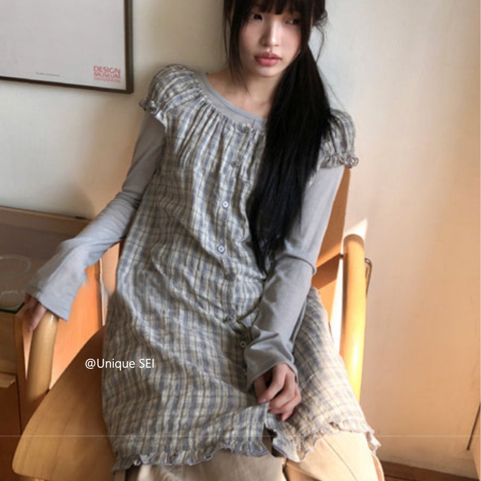 찹쌀 센스 soft 익스트림 제인 바람 주간 실크 아마 얇은 긴팔 맨위 miu 부서 체크무늬 한 마디 허리밴드 치마바지 여성