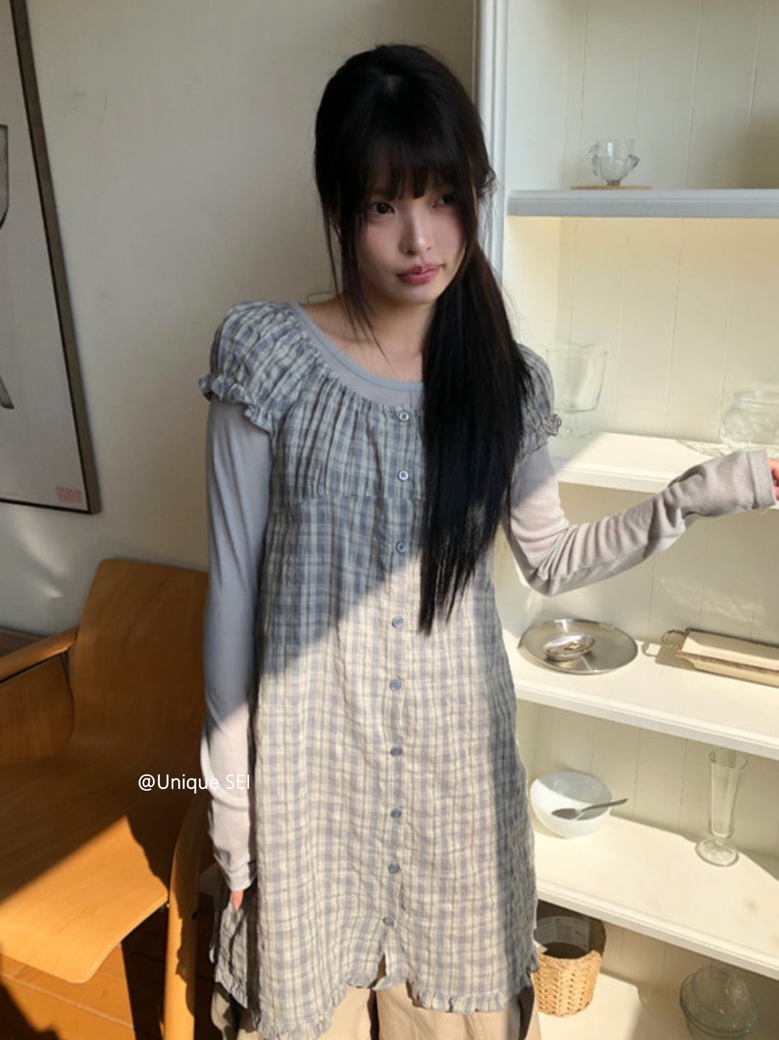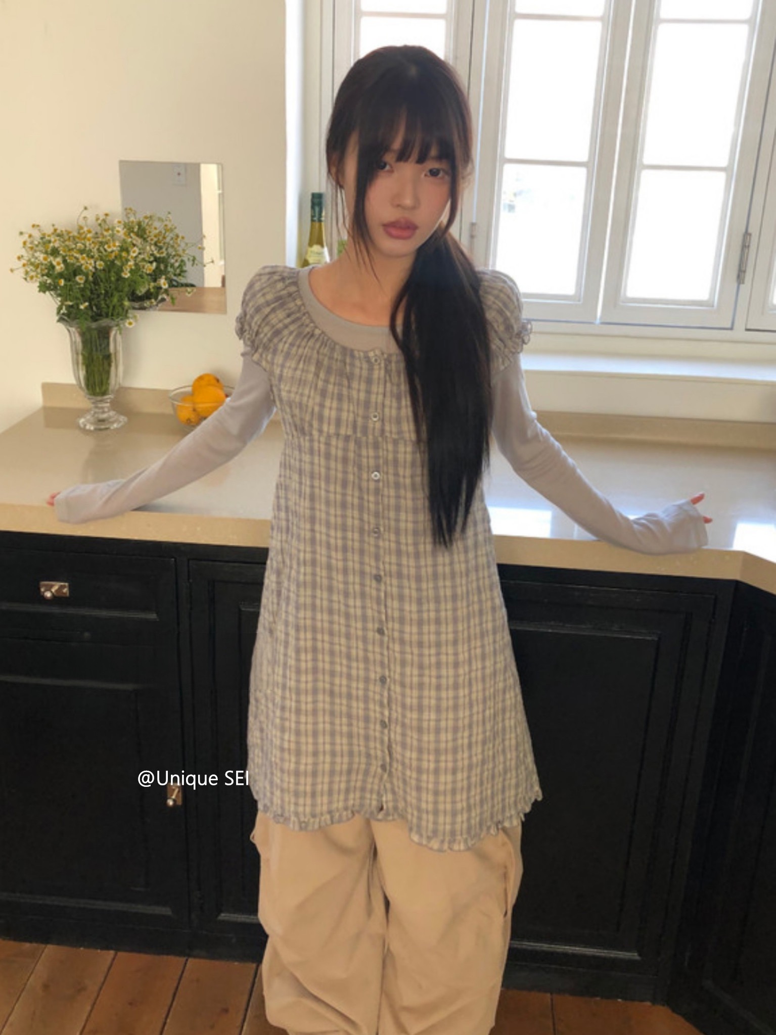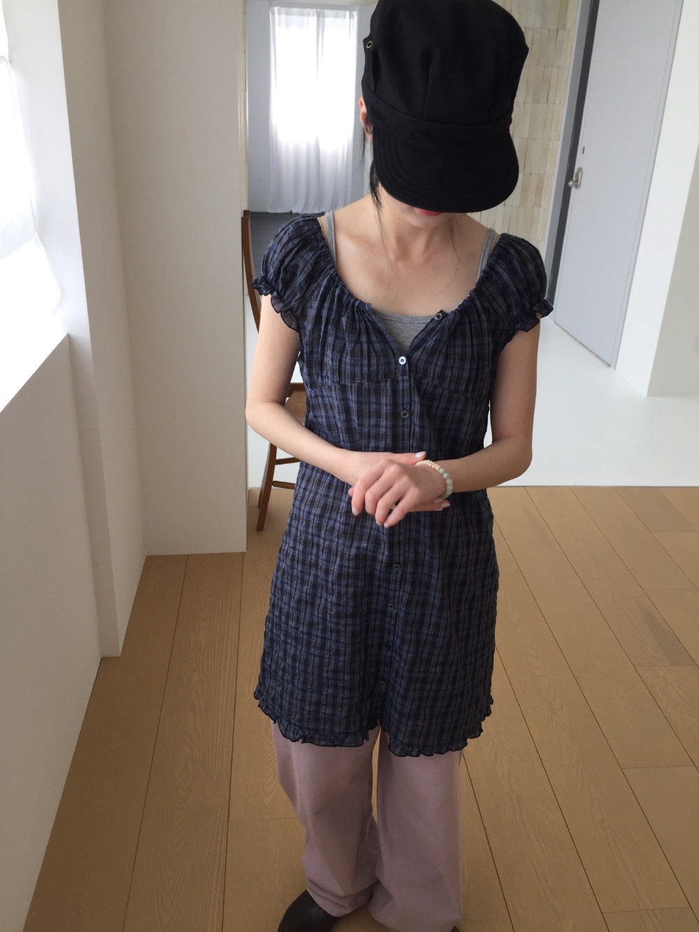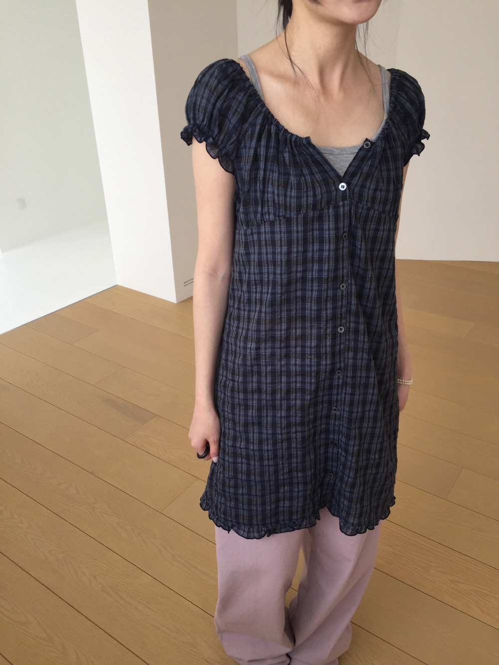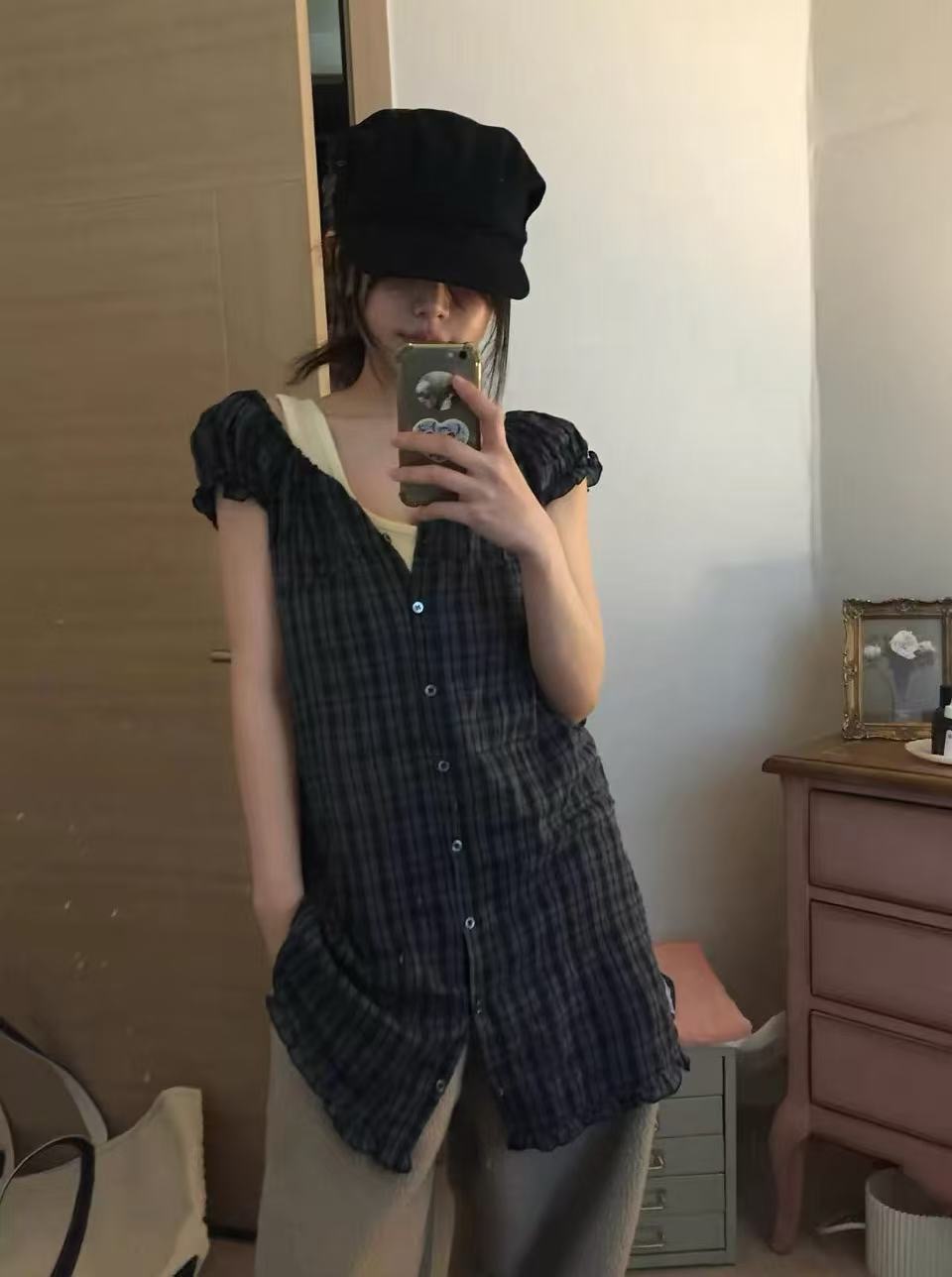 찹쌀 센스 soft 익스트림 제인 바람 주간 실크 아마 얇은 긴팔 맨위 miu 부서 체크무늬 한 마디 허리밴드 치마바지 여성