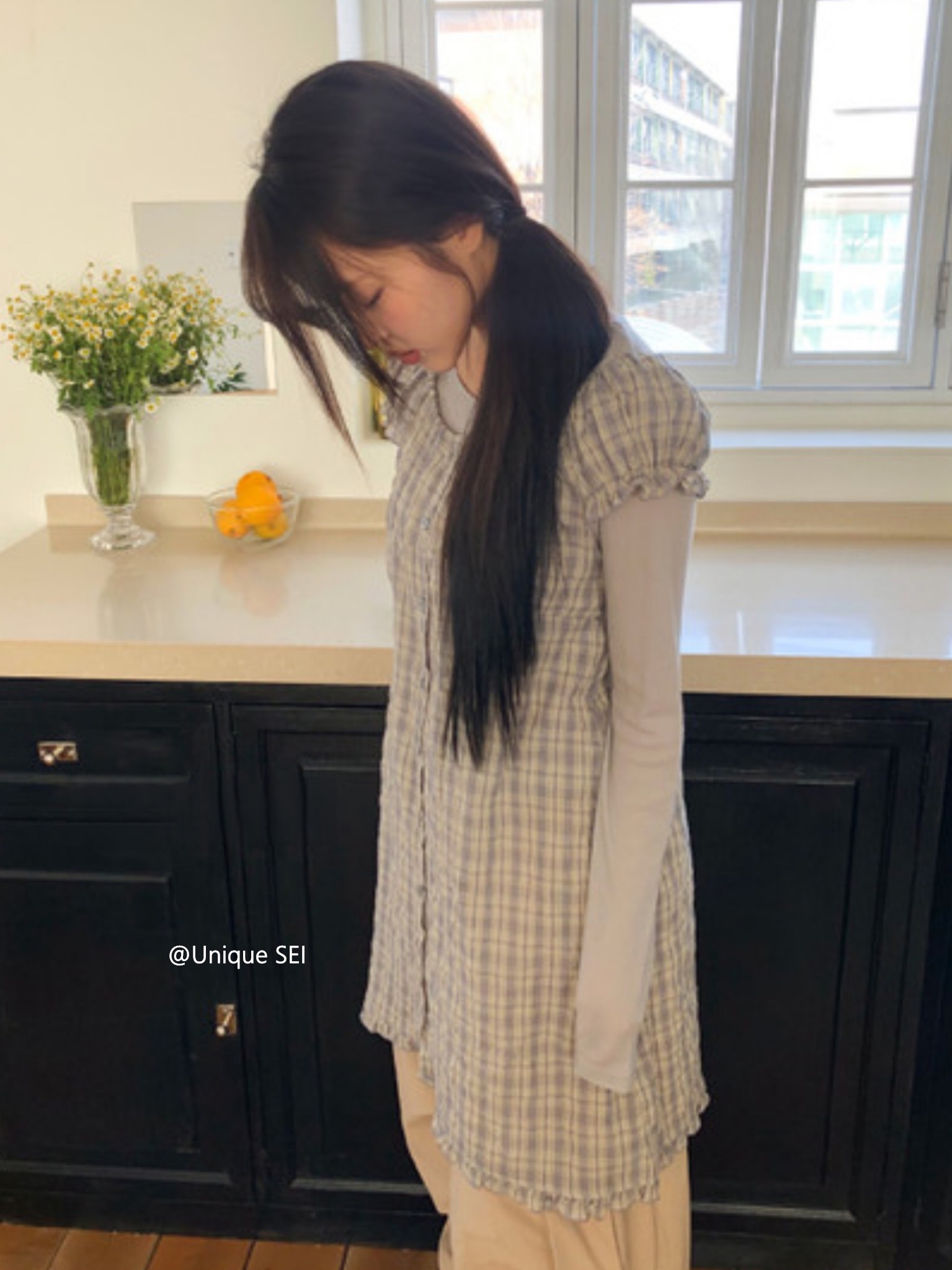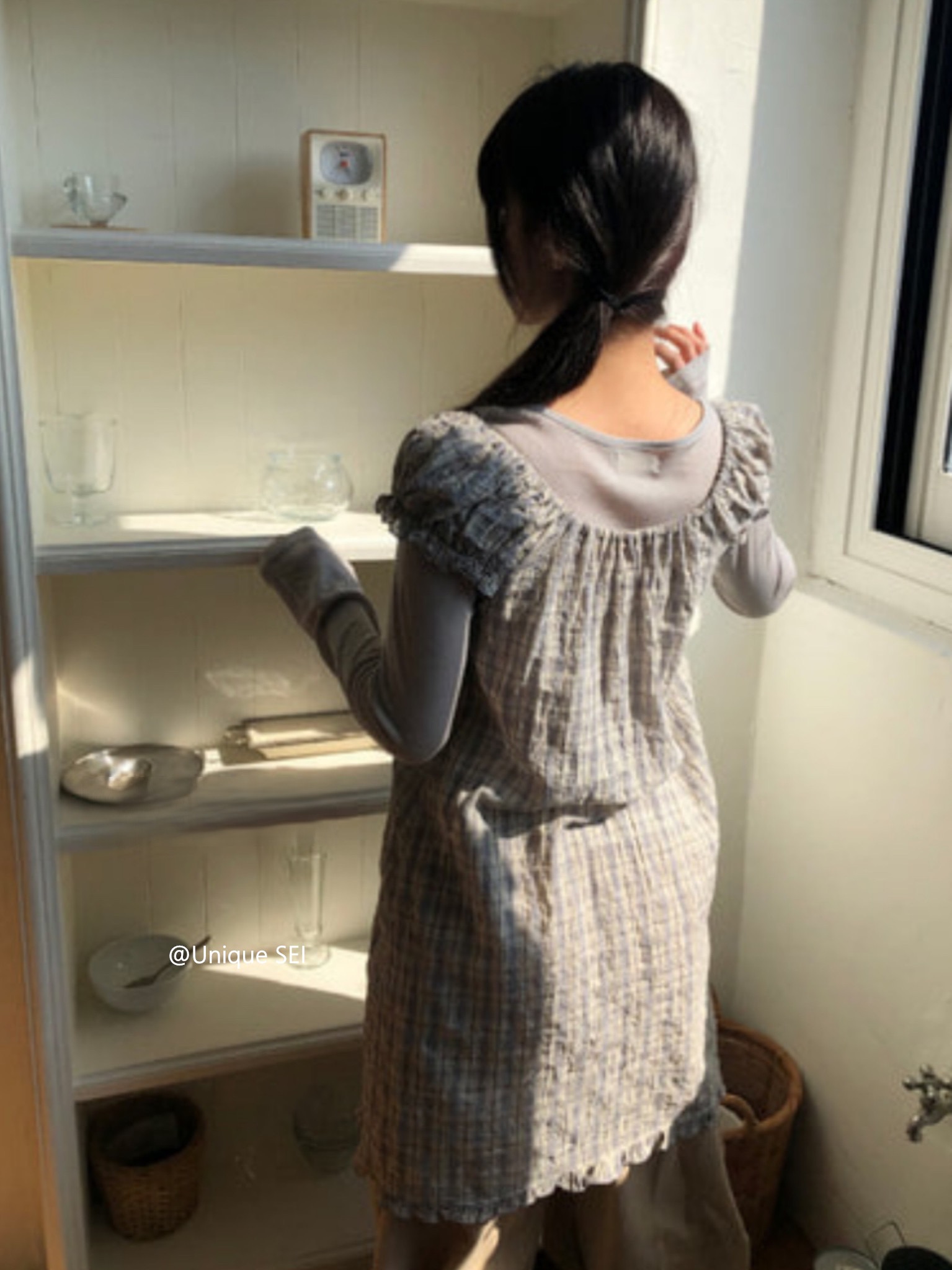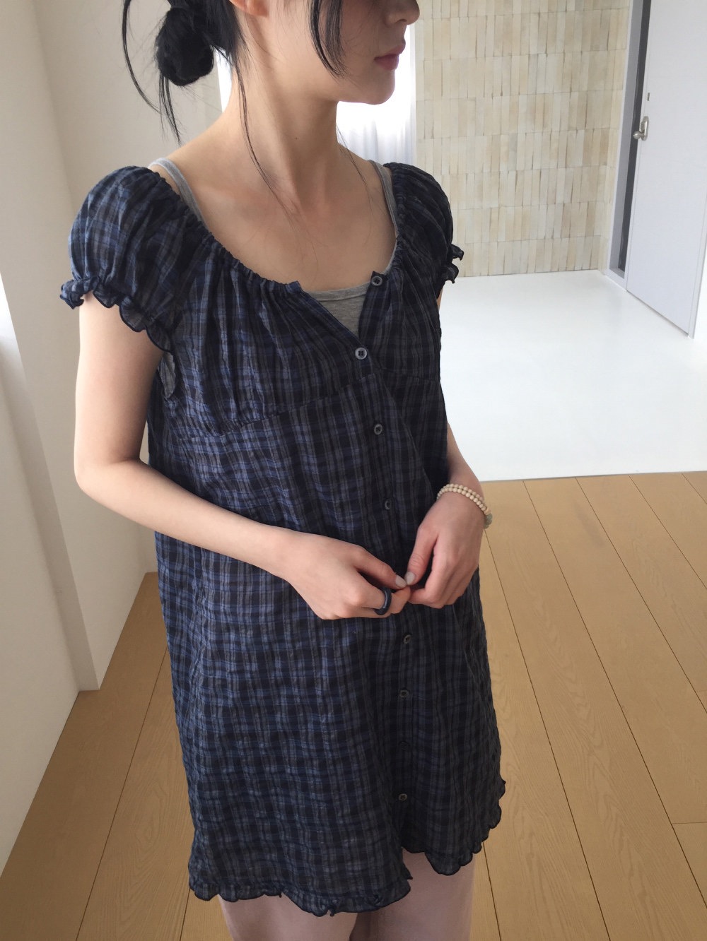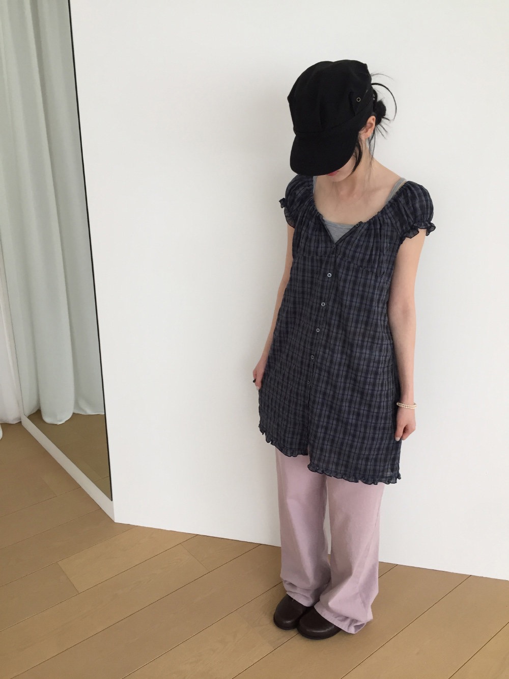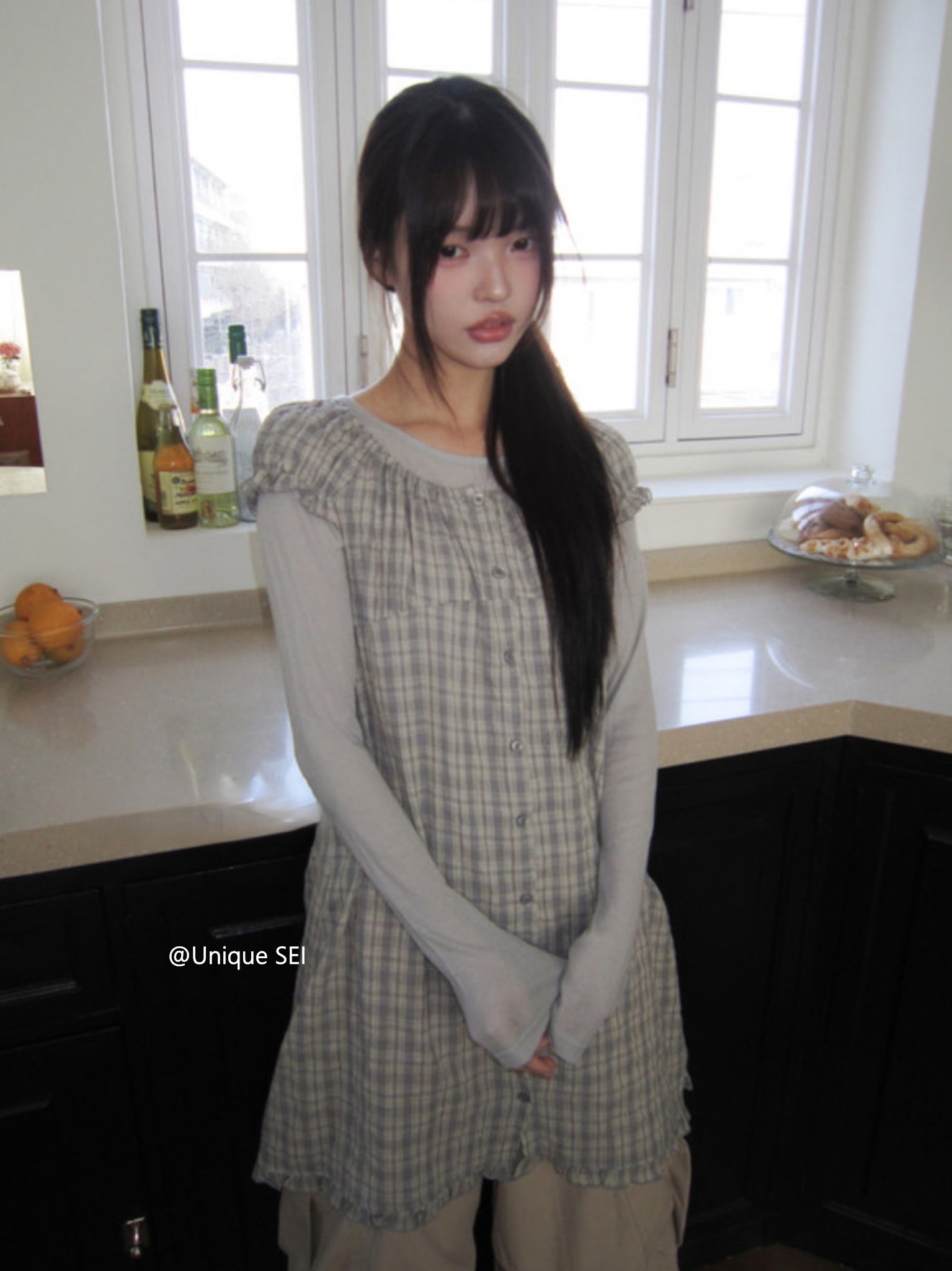 찹쌀 센스 soft 익스트림 제인 바람 주간 실크 아마 얇은 긴팔 맨위 miu 부서 체크무늬 한 마디 허리밴드 치마바지 여성